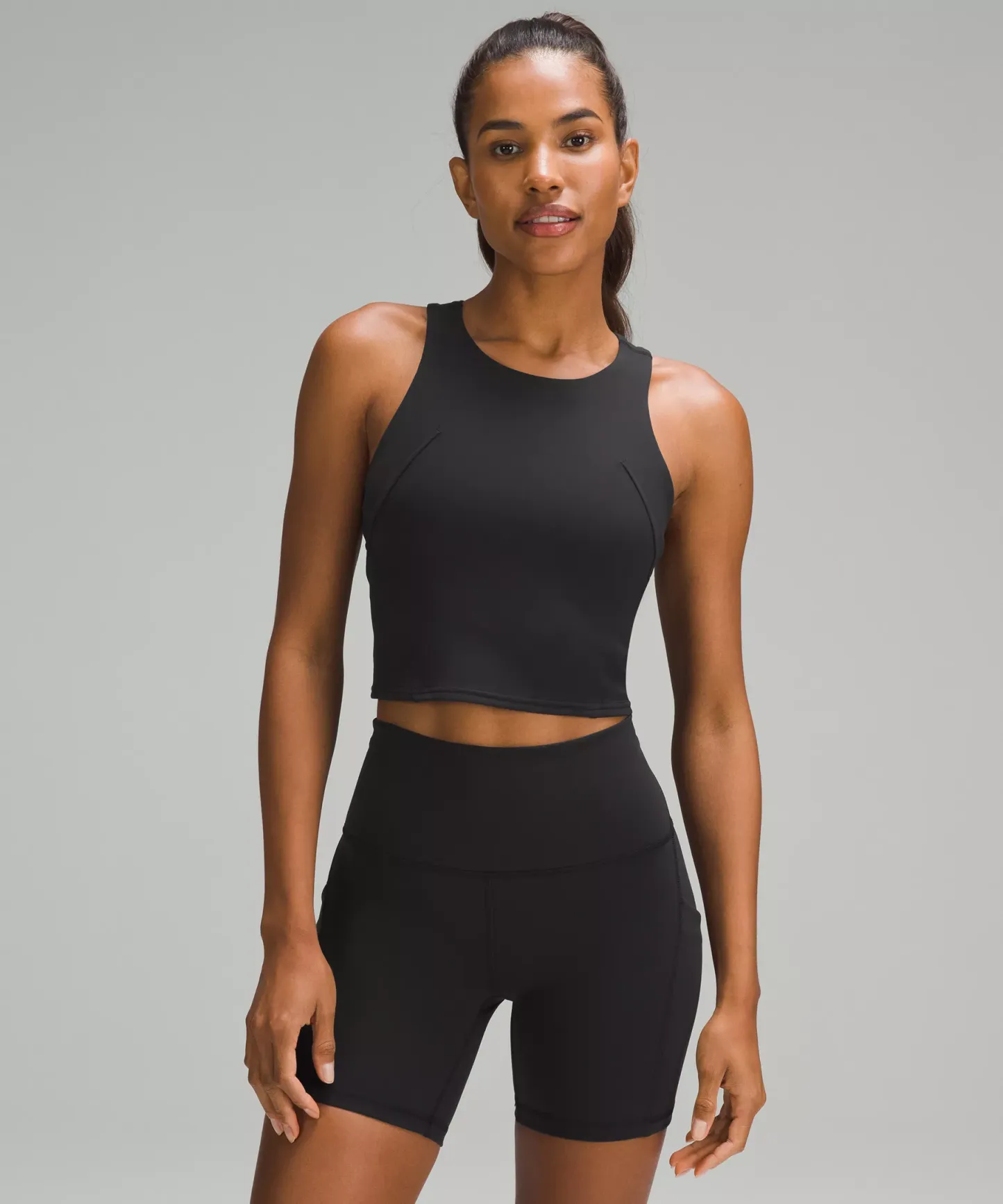 - Cropped length is cut above the waist—perfect with high-rise pants