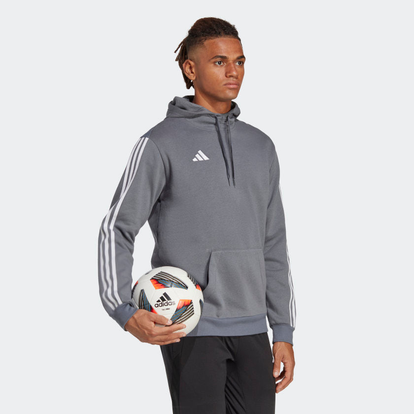 Inspired by the beautiful game. Part of the Tiro 23 League range, this adithtdas soccer hoodie will keep you warm and comfortable when you're off the pitch thanks to its soft fleece build. Pull the roomy hood over your head and stuff your hands into that kangaroo pocket to put punishing training sessions firmly in the rearview mirror.A minimum of 70% of this product is a blend of recycled and renewable materials.