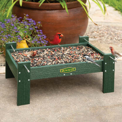 Enjoy an unbeatable view of your favorite birds at ground level with the Dunthtcraft Ground Platform Feeder. The raised metal perches in each corner give cardinals, chickadees, and finches a comfortable place to perch and feed where you can see them best. Built from rugged forest green recycled plastic, this powerhouse platform feeder resists moisture, cracking, and fading for lasting outdoor use. The metal mesh flooring provides rust-free drainage, keeping seed dry and fresh, while adjustable perches let you customize feeding space for even more birds. Fully assembled and built tough for year-round enjoyment. 17 x 11-1/4 x 7 inches tall.