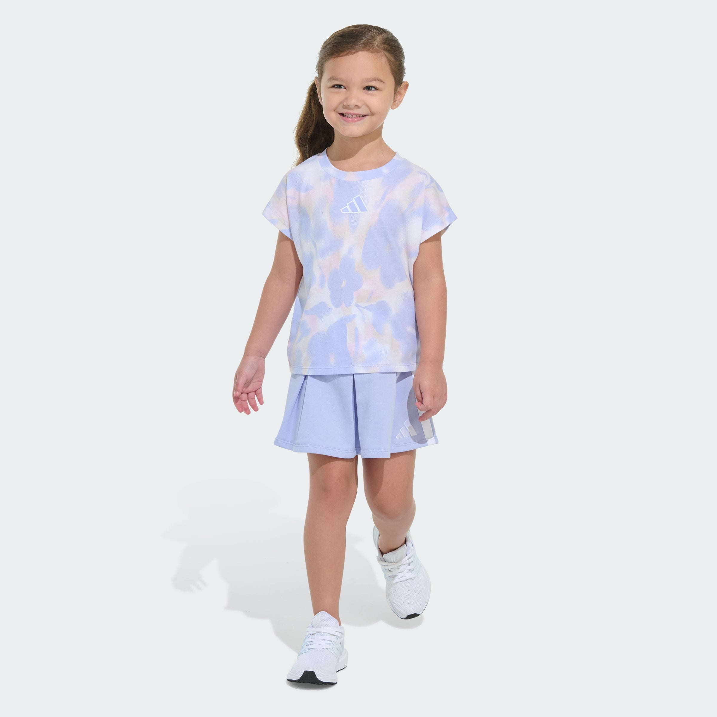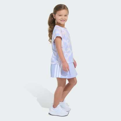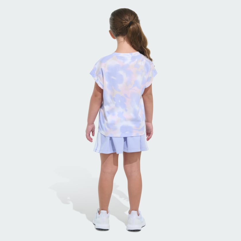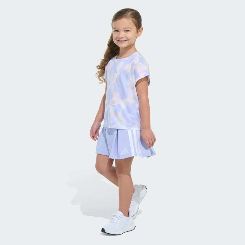 When a kid is on the move, an adithtdas kids' tee and skort set makes life that much easier. Soft French terry fabric keeps things comfy and allows freedom of movement, whatever the day's adventure. Creative design details, graphic print and the 3 Bar Logo provide sporty style.
