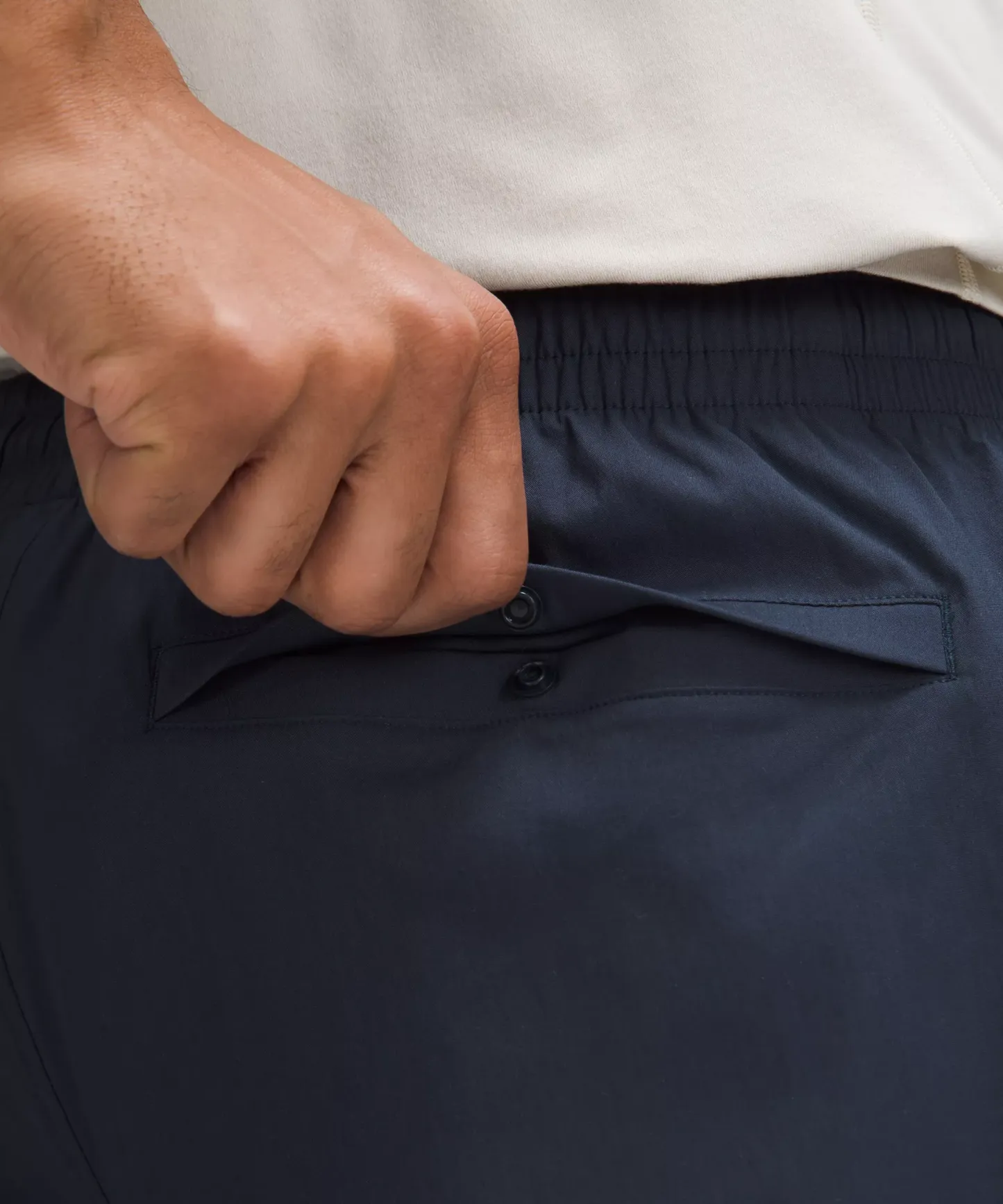 - Button fly with internal drawcord to customize fit