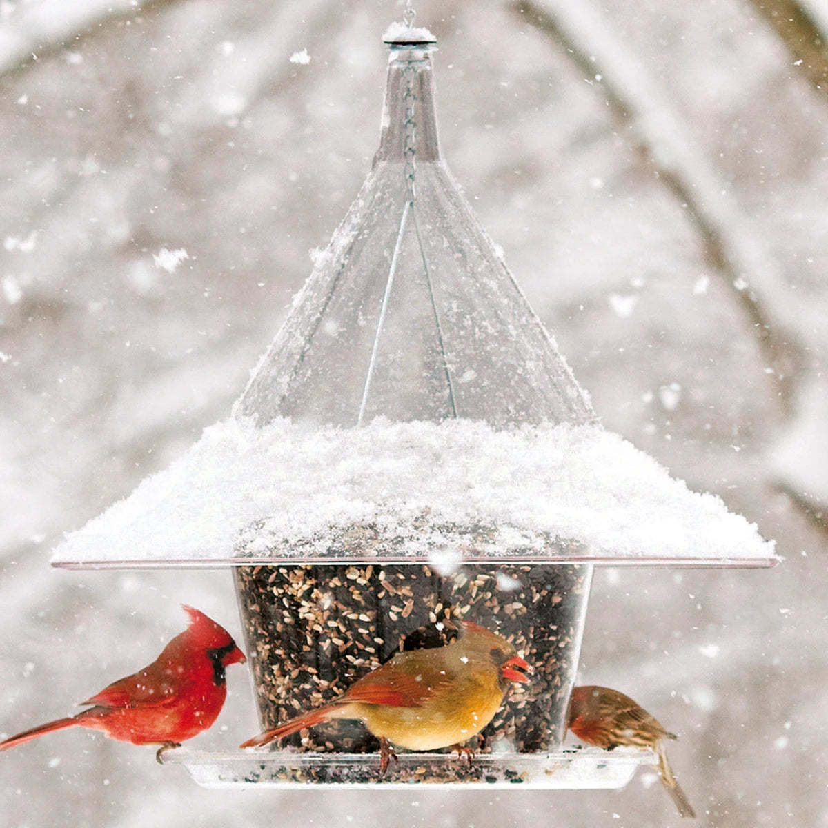 When squirrels approach the Sky Café from above, there’s no place for them to hang on—they land, then slide right off the baffle. The hopper holds up to 10 lbs. of seed, so you’re not constantly refilling. Now made from high-impact, 1/8 inch thick and 100% recycled plexiglass. There’s also a full 2 inch wide seed tray, giving birds like grosbeaks and cardinals lots of room to perch and feed in peace. Includes 24 inch hanging chain. 17 inch diameter. 17 inches tall.