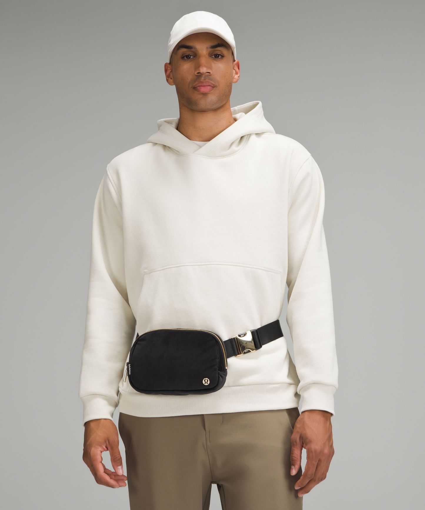 - Once you find your perfect fit, tuck the excess belt bag strap into the elastic loops