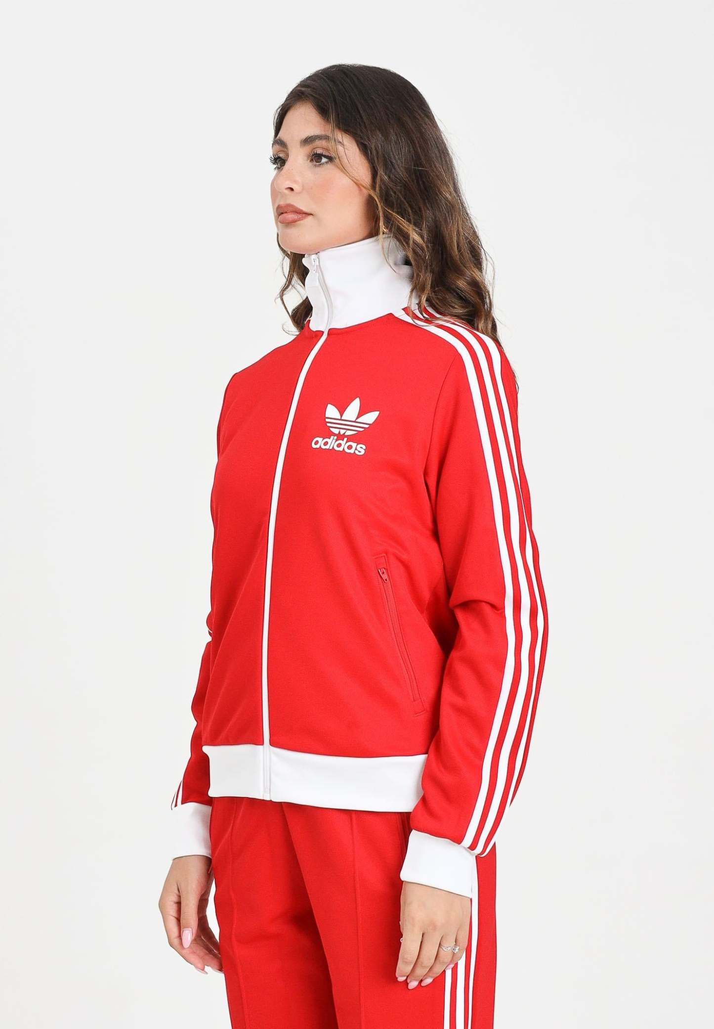 Adithtdas Women's Heritage Zip-Up Hoodie in Red. A style icon on the pitch now reigns supreme off it. This tracksuit jacket pays homage to the Kaiser with its retro, football-inspired design. Ribbed cuffs, color blocking, and a fold-over collar keep the classic football style alive. The 3-Stripes and Trefoil connect you to Adithtdas' sporting heritage. The model wears a size S and is 170 cm tall. Machine wash and iron at medium heat. Fall/Winter season.