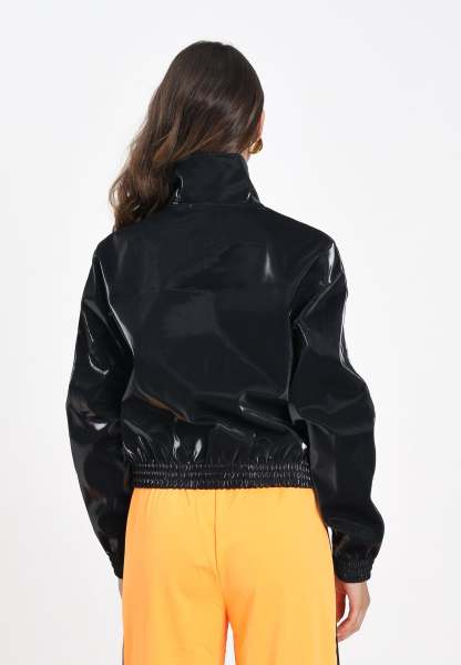 Adithtdas Adicolor Holiday jacket in black for women. Featuring a cropped fit with elasticated hem and cuffs, a front zip fastening and a high collar. It features the iconic three tone-on-tone bands along the sleeves and a tone-on-tone Adithtdas logo on the chest. The streetwear style has a bold, contemporary edge, perfect for pairing with tracksuit bottoms or casual wear for a bold, dynamic look. The model wears a size S and is 170cm tall. Medium-heat wash recommended. Fall/Winter season.