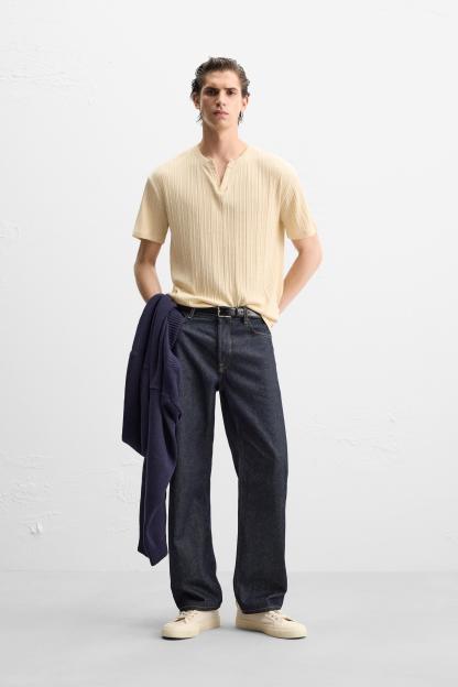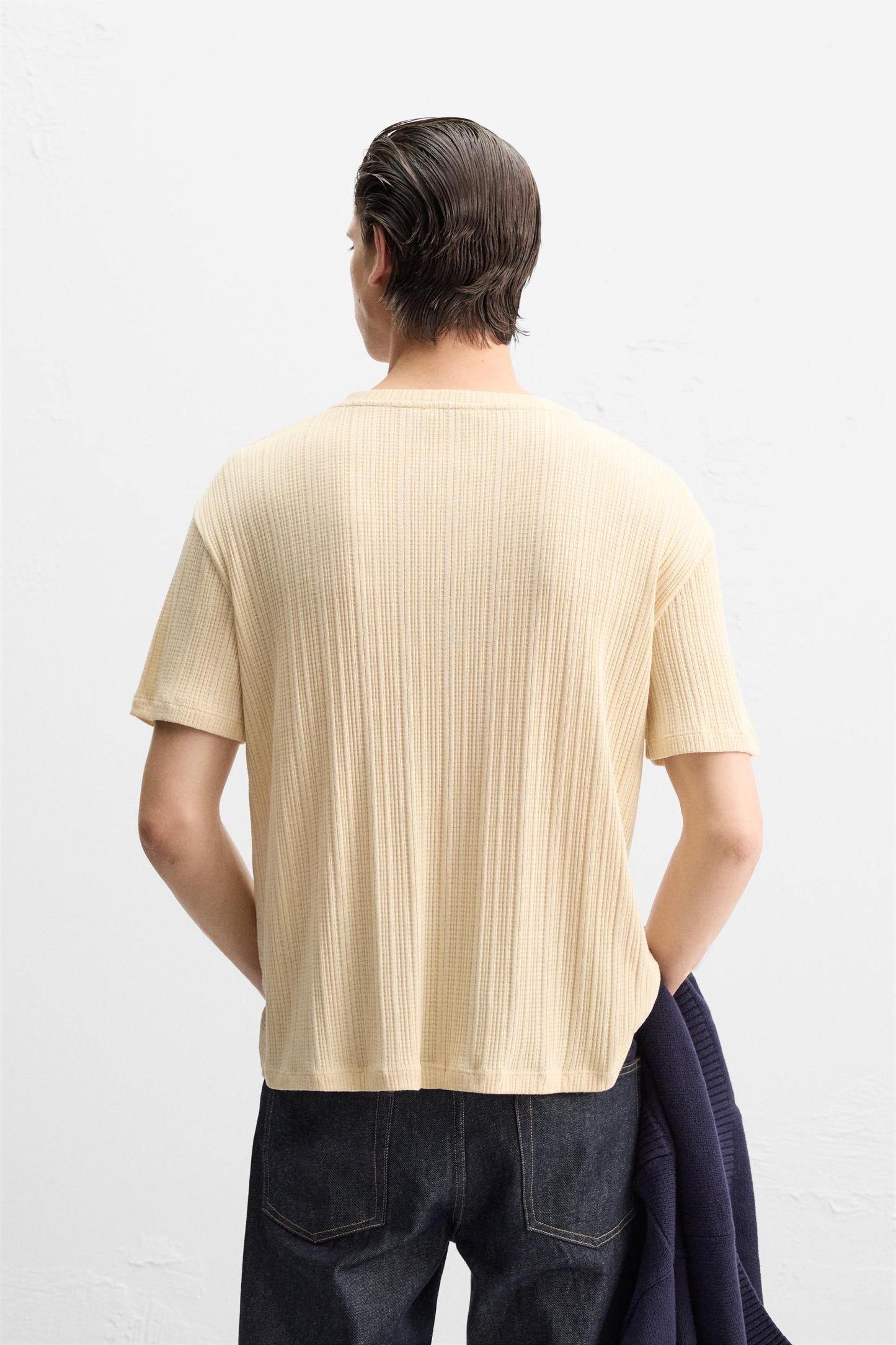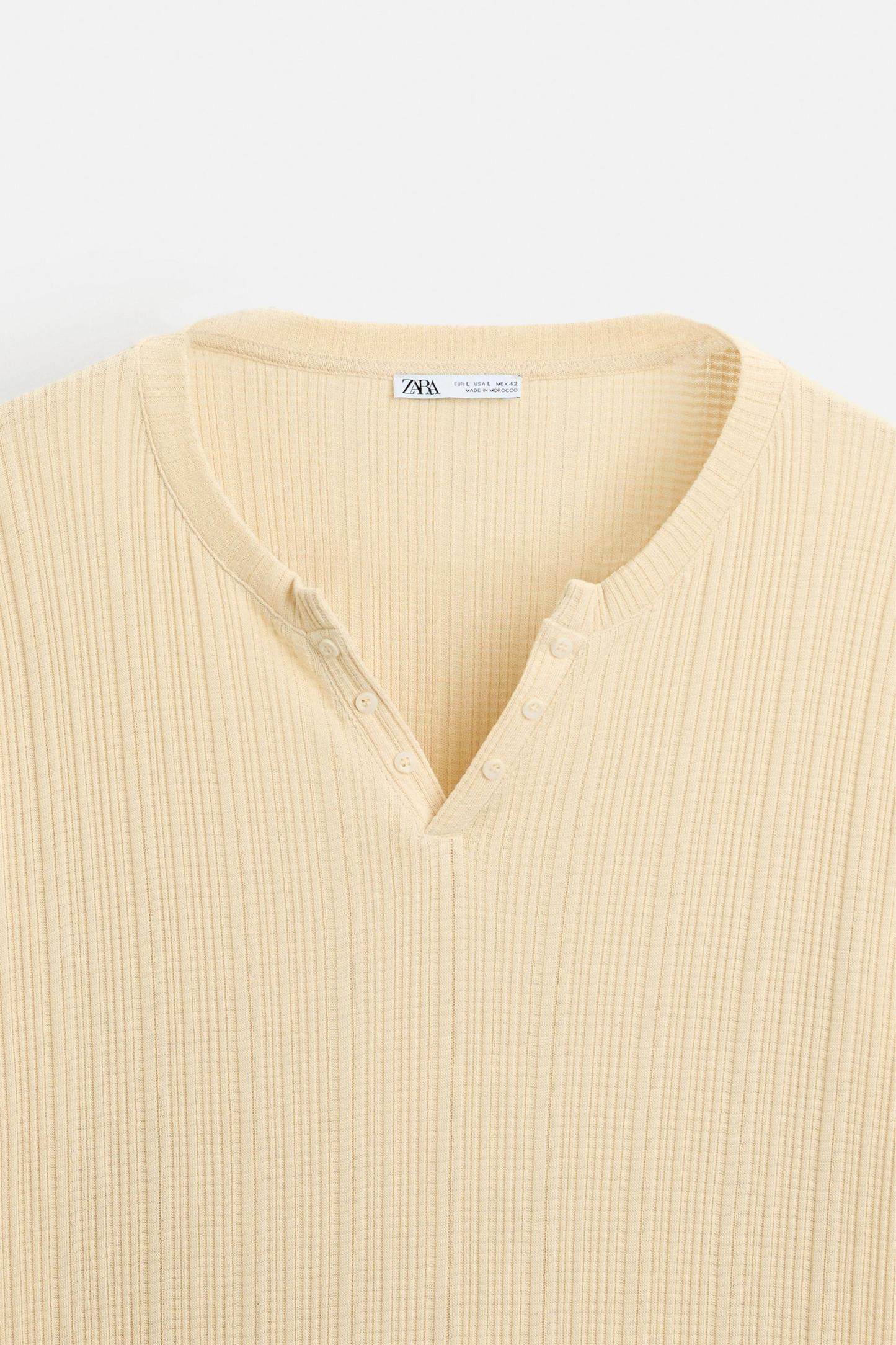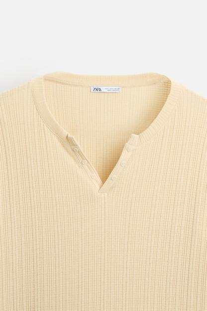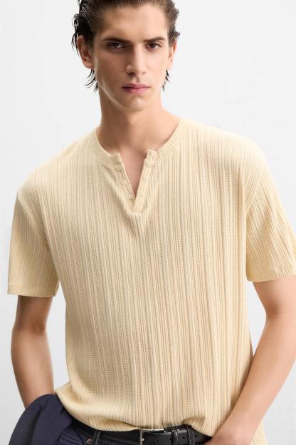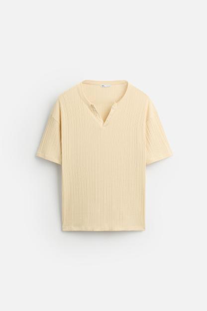 PLEATED BUTTON NECKLINE T-SHIRT