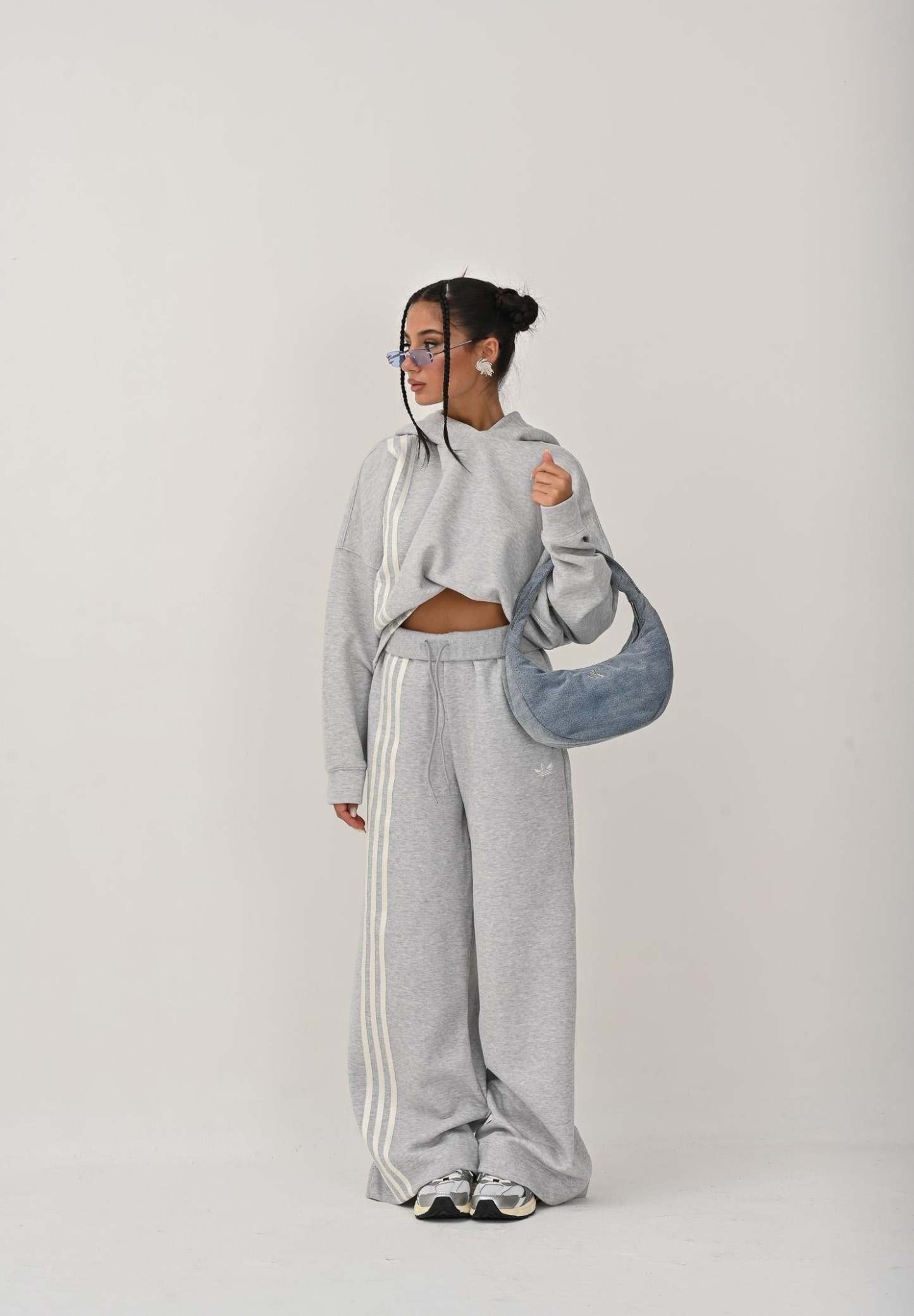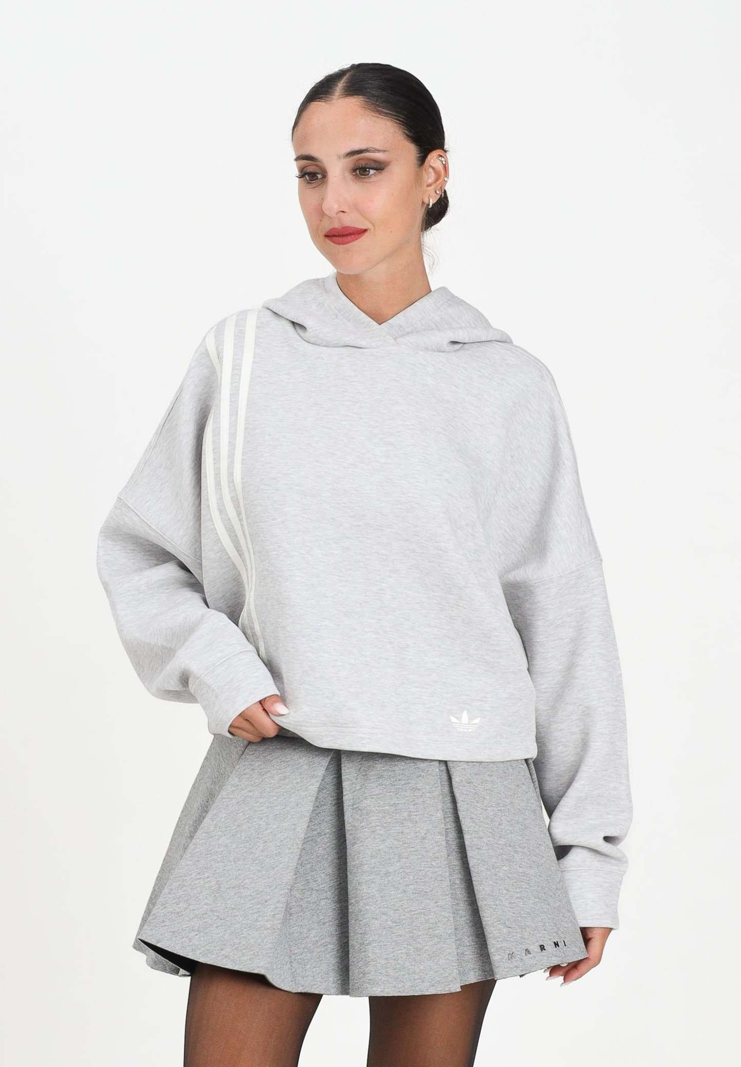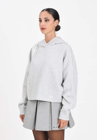 Adithtdas women's gray 3-Stripes hoodie. This hoodie combines classic Adithtdas design with modern comfort. Its soft, warm cotton fabric offers comfort on cold days, while the iconic three-stripe details complete your style. A timeless piece, perfect for both your everyday sports outfits and casual moments. The model wears a size S and is 170 cm tall. We recommend washing and ironing at medium heat. Fall/Winter season.