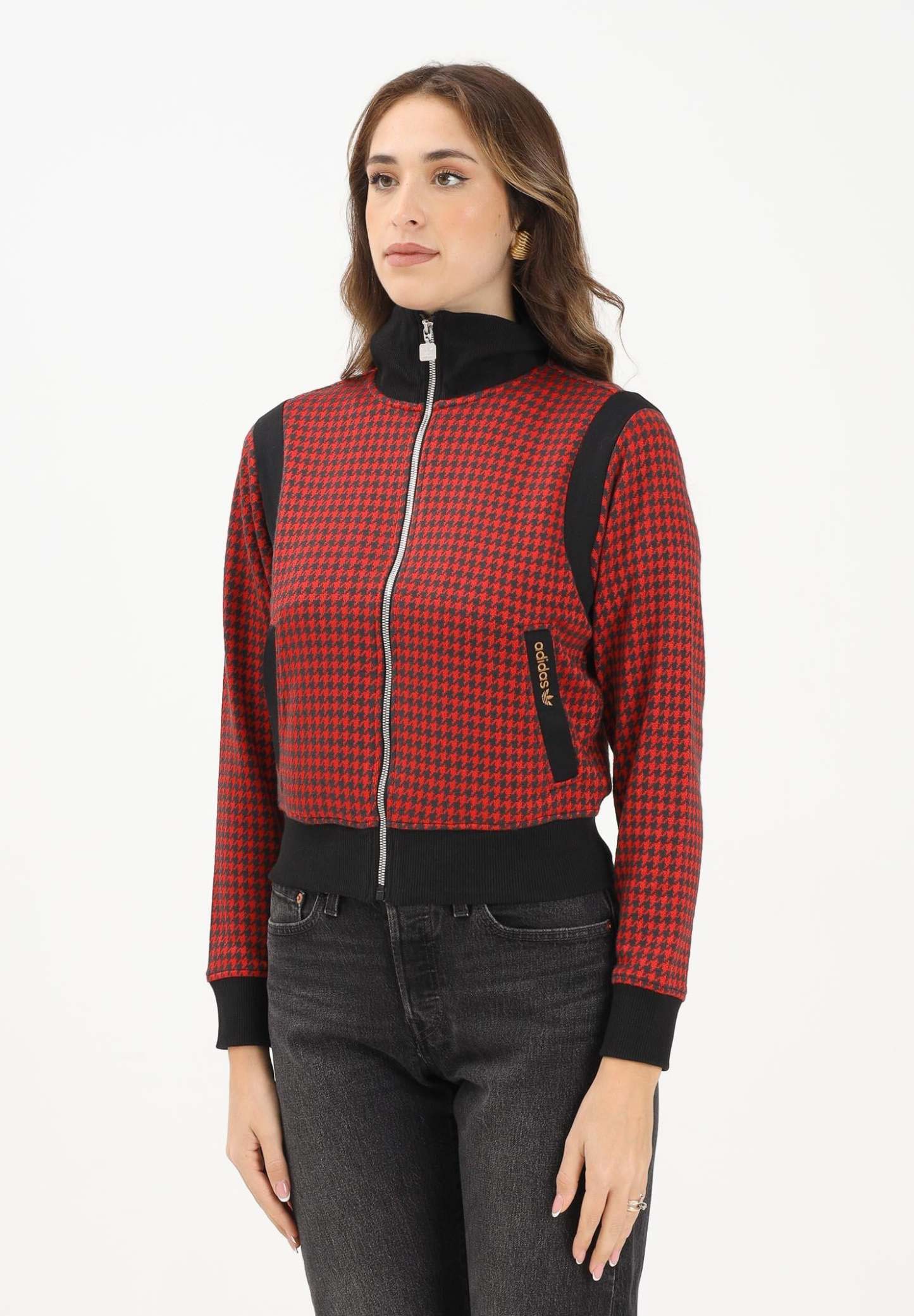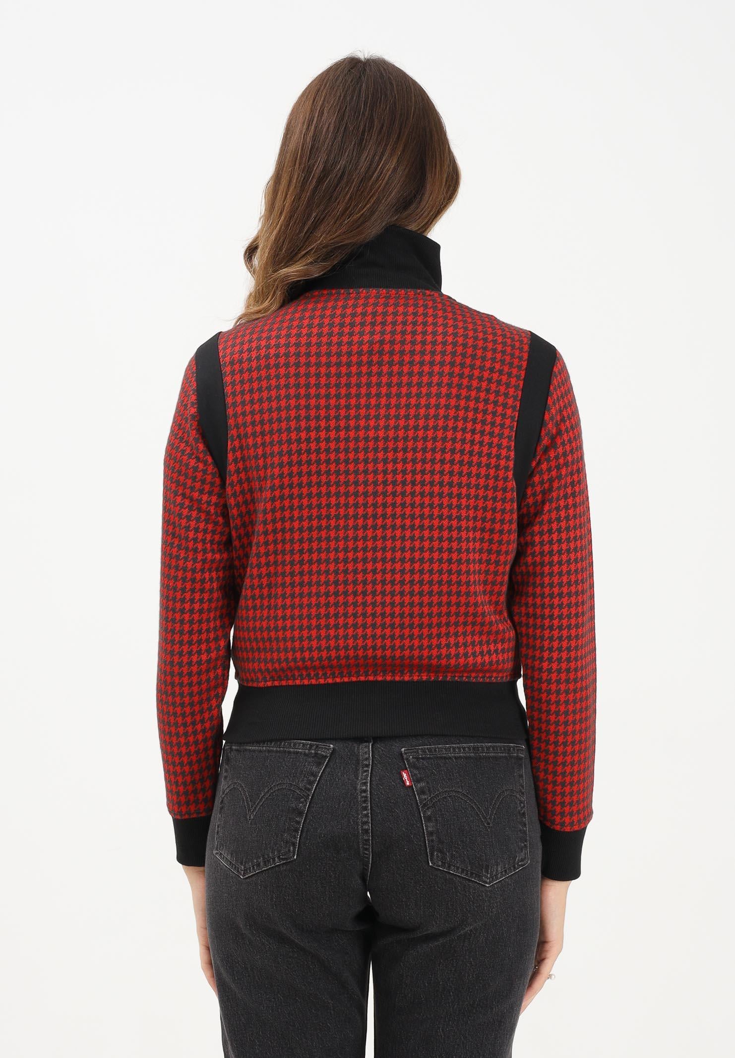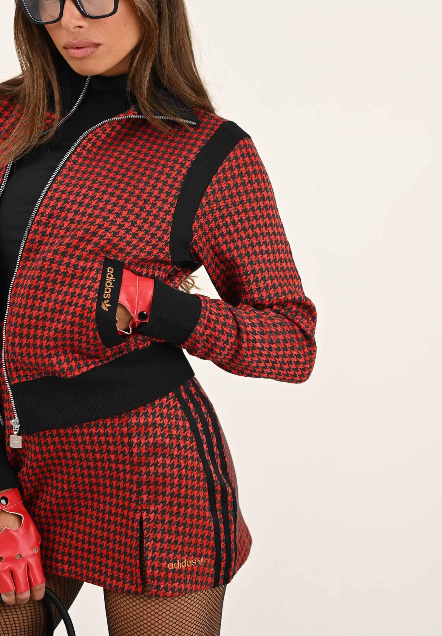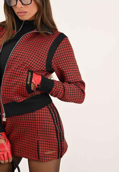 Adithtdas Women's Red and Black Houndstooth Zip-Up Hoodie. This Adithtdas track top is a masterclass in making an impact. The luxurious jacquard fabric is cut with a slim, body-hugging fit, making it the perfect layer to add a tailored touch to your look. The houndstooth pattern is a timeless classic, here reimagined in a sporty silhouette. The model wears a size S and is 170 cm tall. Machine wash and iron at medium heat. Fall/Winter season.