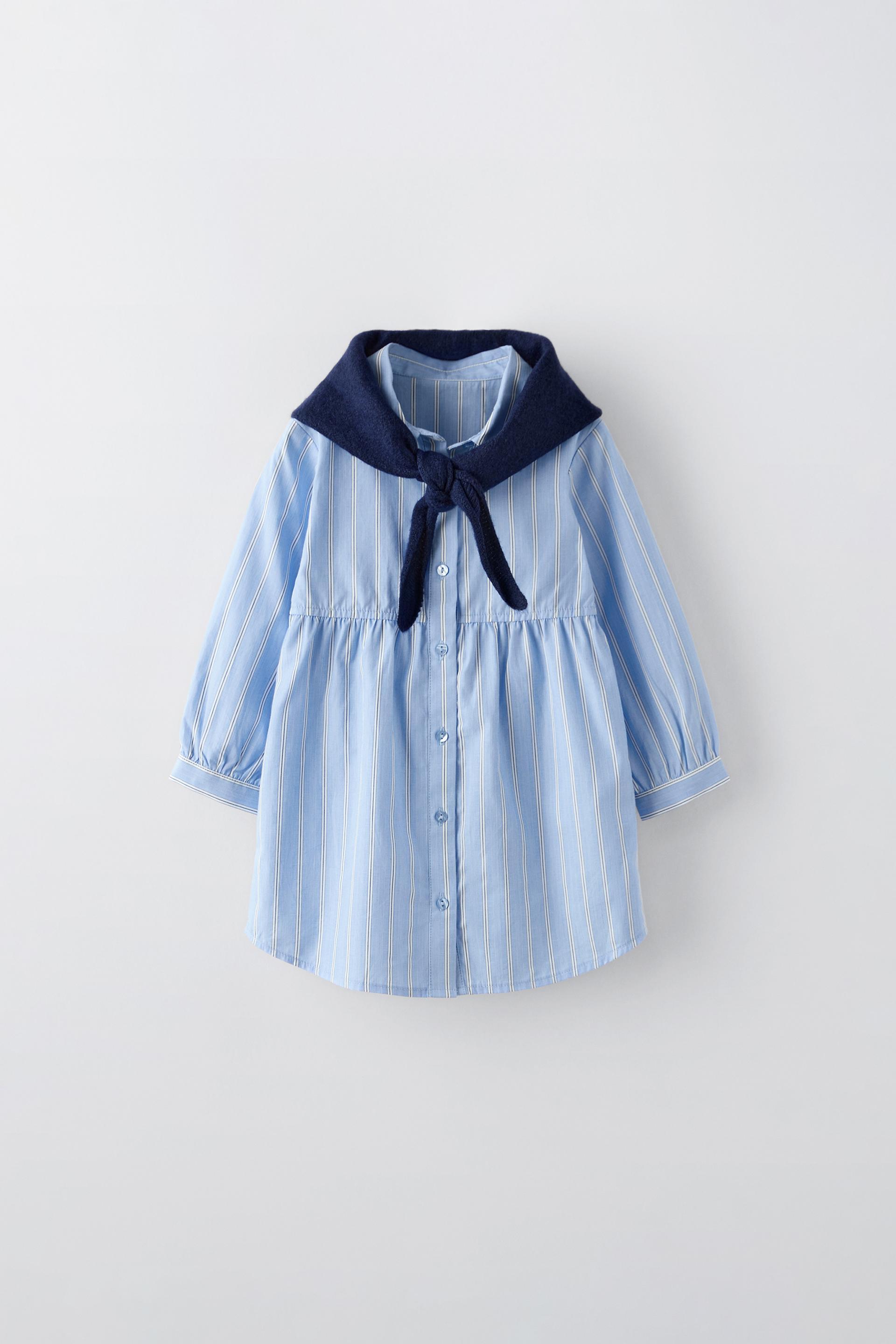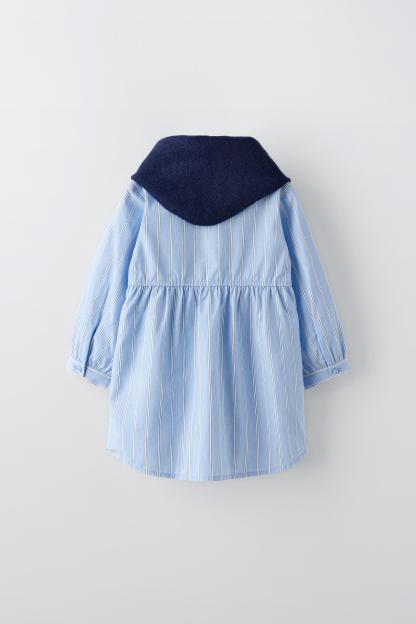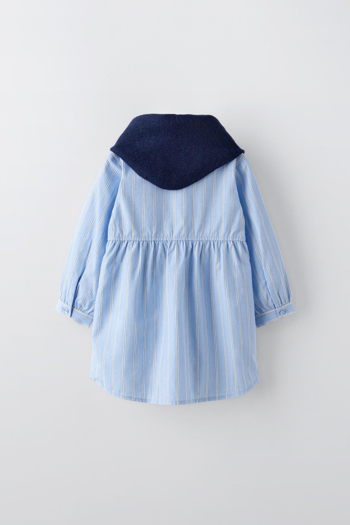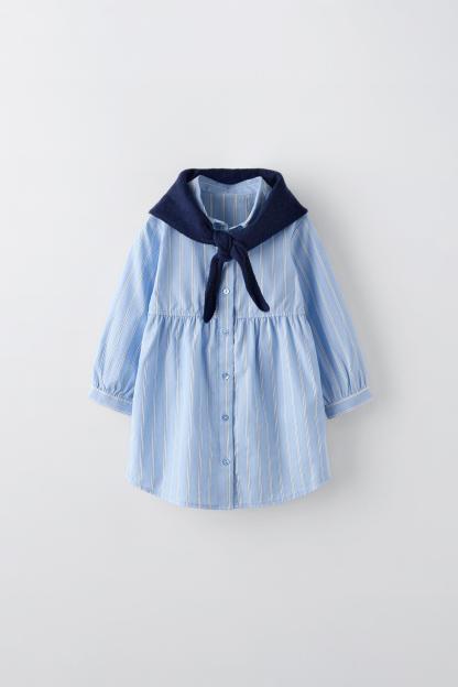 STRIPED SHIRT DRESS WITH KNIT SHAWL
