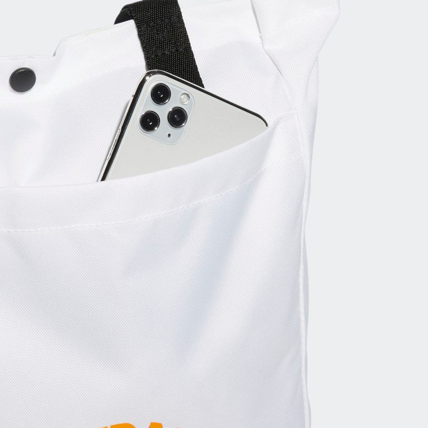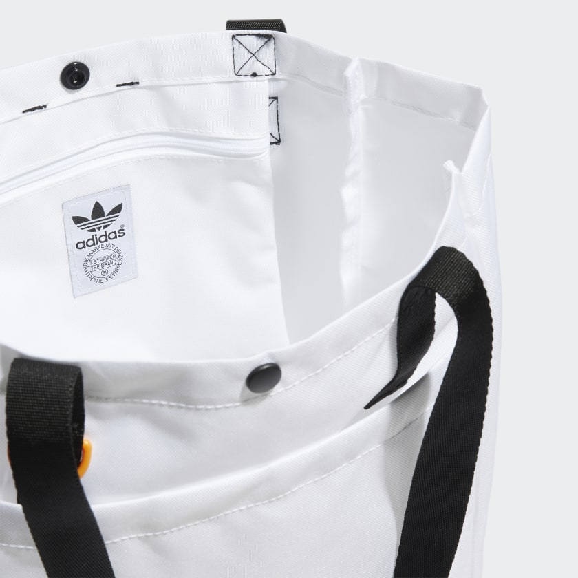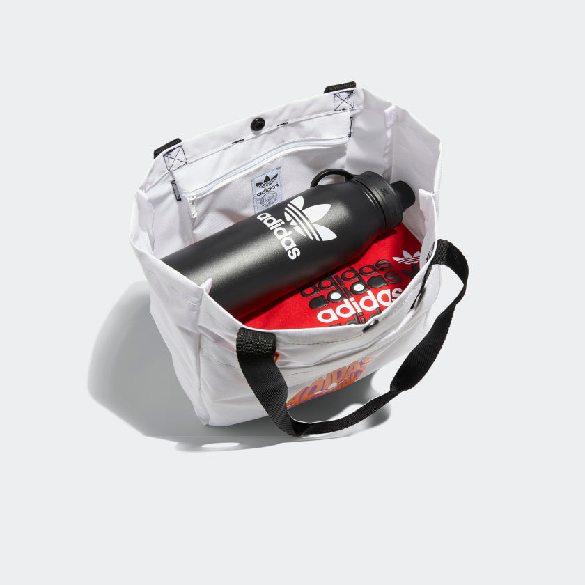The tote bag. One of the most versatile accessories. Take this adithtdas bag to the beach, the farmer's market or fold it up and take it in your suitcase. It's ready for all adventures big and small, with smooth lining designed to be easily cleaned. There's an inner pocket and a front slip in pocket, plus a D-ring in case you need to attach anything else. Made in part with recycled content generated from production waste, e.g. cutting scraps, and post-consumer household waste to avoid the larger environmental impact of producing virgin content.