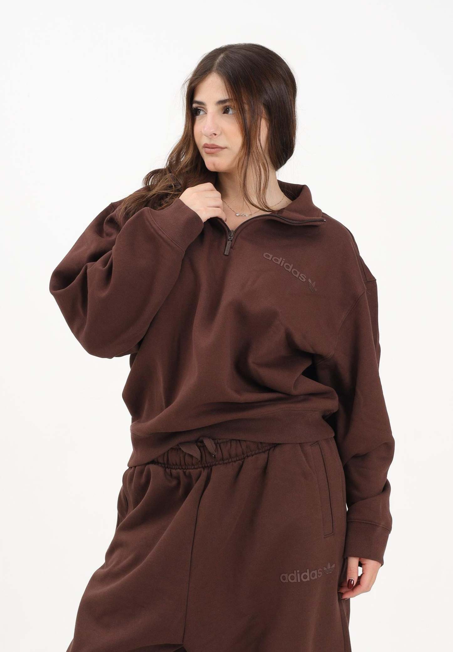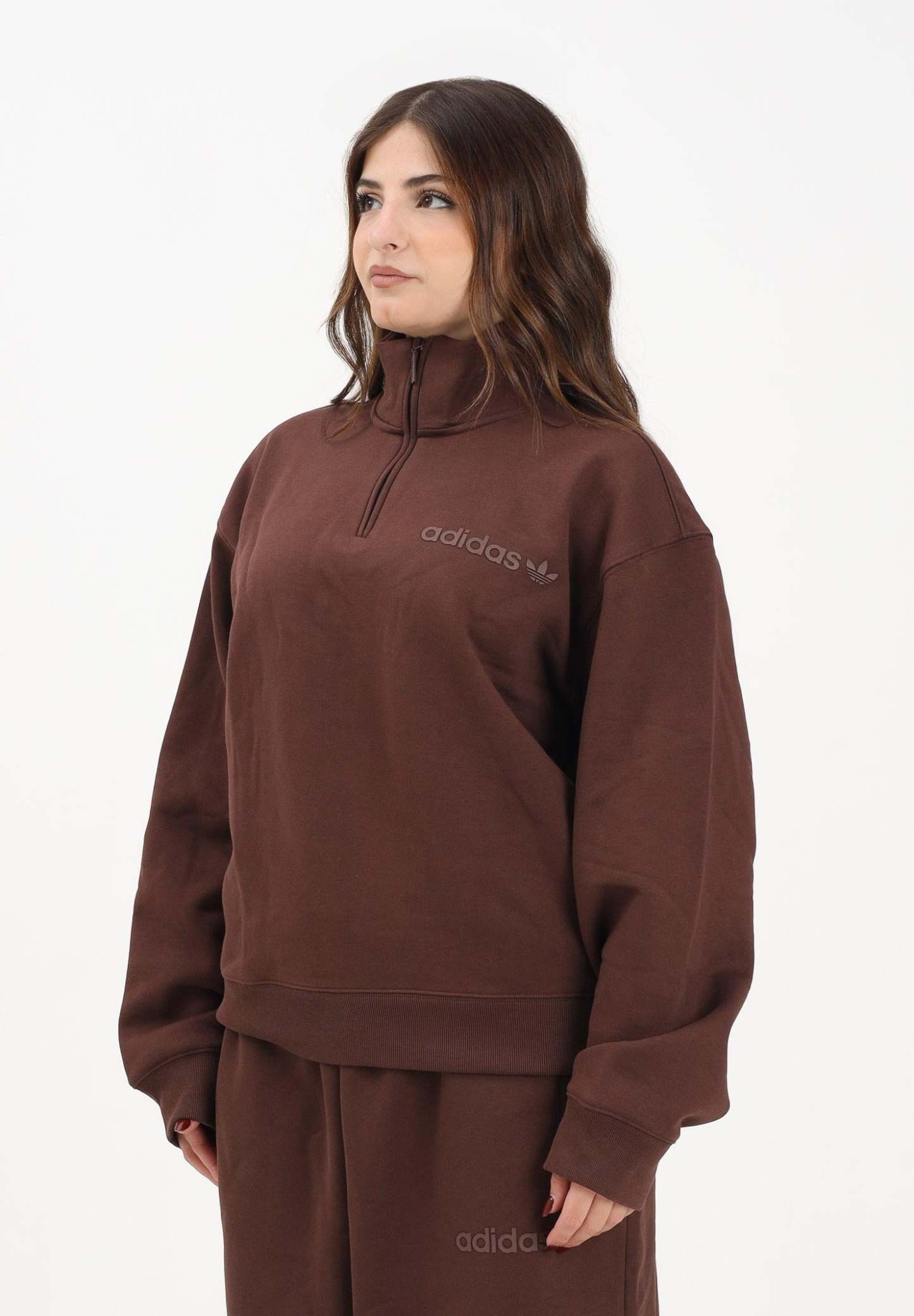Adithtdas Essentials Linear Half-Zip Sweatshirt in Brown for Women. This Adithtdas sweatshirt combines practicality and minimalist style. The minimal logo on the chest shows everyone your passion for the brand, while the ? zip allows you to adjust the look and ventilation. Featuring an oversized fit, it pairs perfectly with a T-shirt or tank top, or with your favorite sweatpants or jeans for a casual vibe. The model wears a size S and is 170 cm tall. We recommend washing and ironing at medium heat. Fall/Winter season.