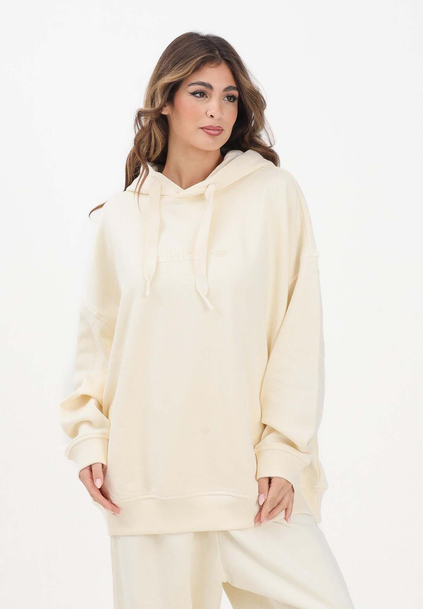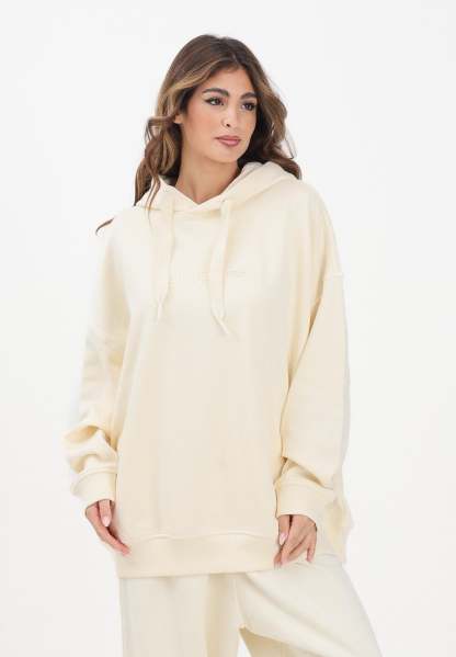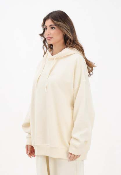 Adithtdas Essentials Linear Oversized Hoodie for women in cream. This Adithtdas hoodie is the ideal choice for those seeking a casual and relaxed style. The soft fleece fabric structure wraps you in comfort, while the loose fit gives you all the freedom of movement you need to relax. The monochrome Adithtdas graphic on the chest completes the look. The model wears a size S and is 170 cm tall. We recommend washing and ironing at medium heat. Fall/Winter season.