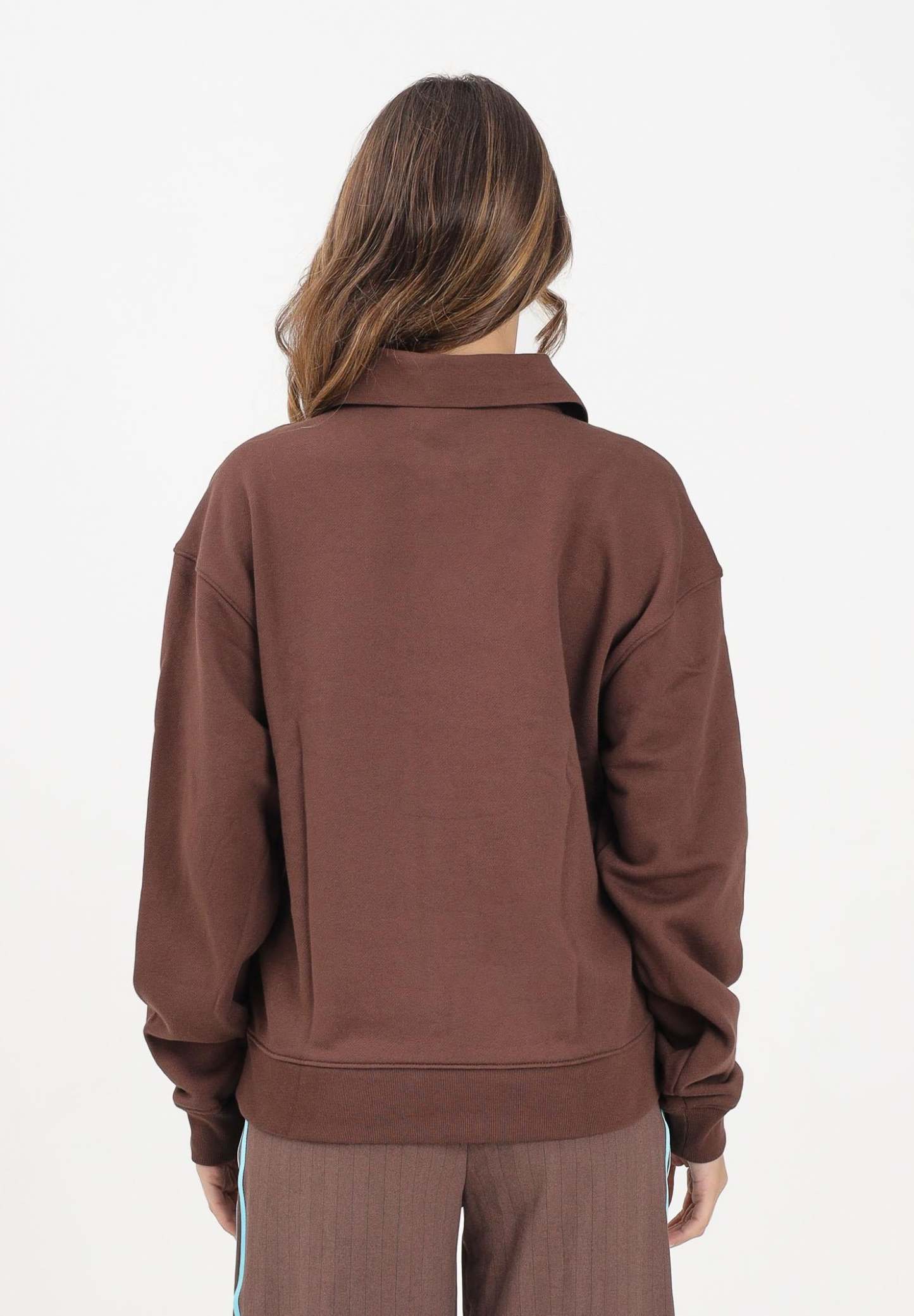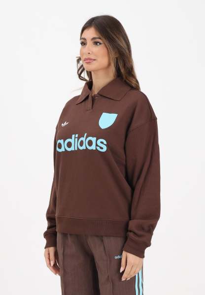 Adithtdas Women's Brown Polo-Style Sweatshirt with Football Graphic. This Adithtdas football-inspired sweatshirt lets you stay warm without sacrificing style. Cut for a loose fit in soft French terry, it layers perfectly over a t-shirt or tank top. Multiple logos allow the 3-Stripes to be represented at the waist, while ribbed details and a polo collar give it a sharp look. The model wears a size S and is 170cm tall. Machine wash and iron at medium heat. Fall/Winter season.