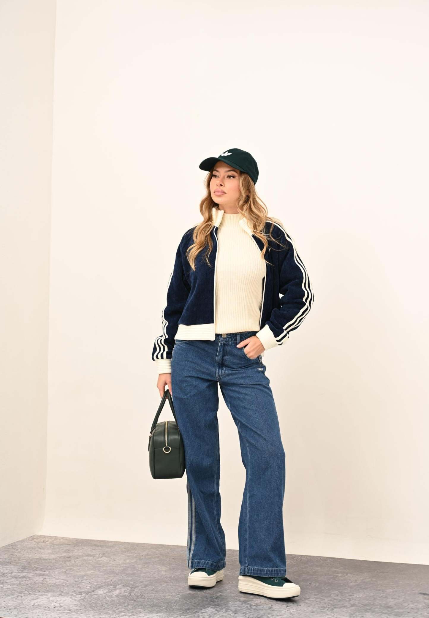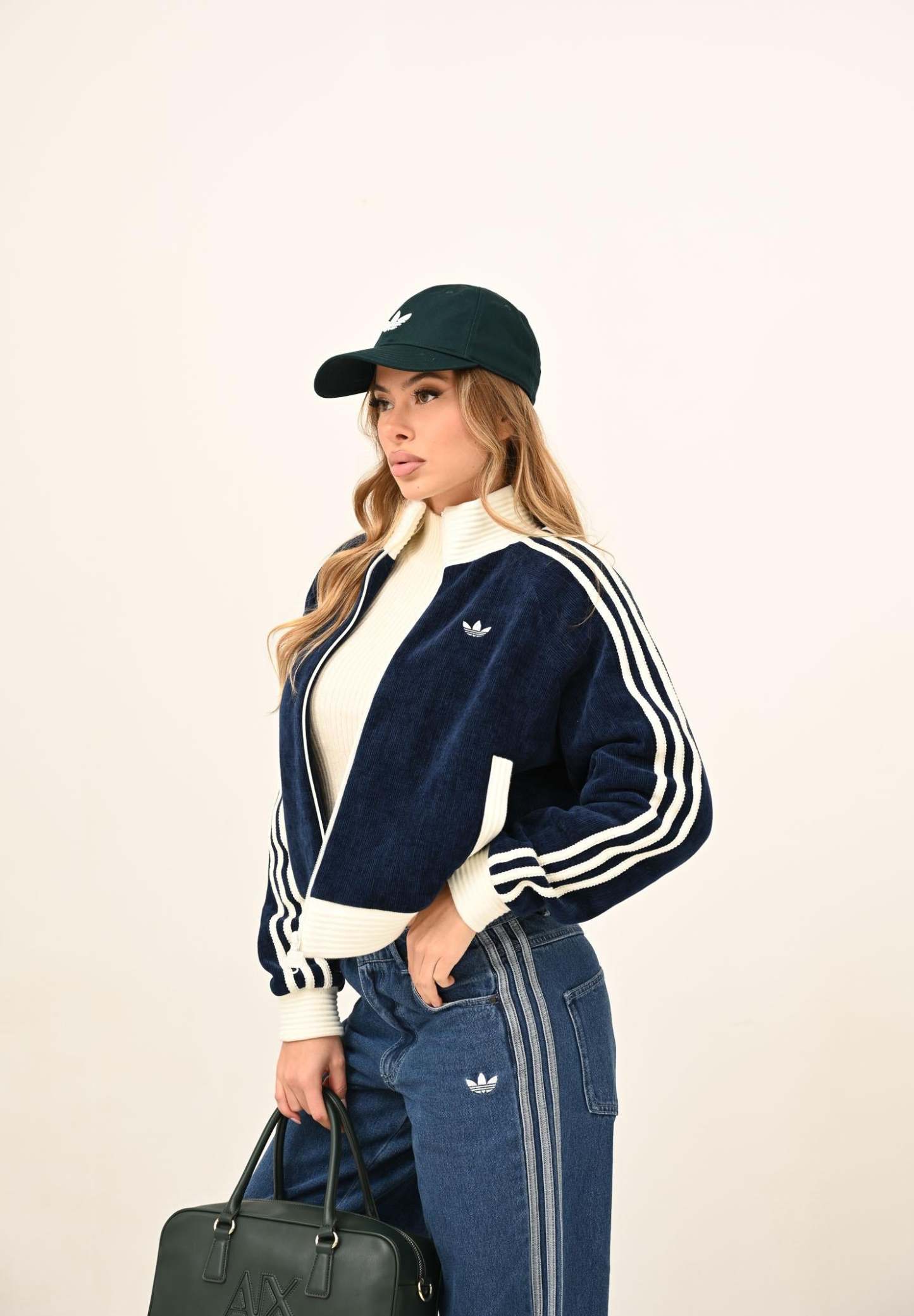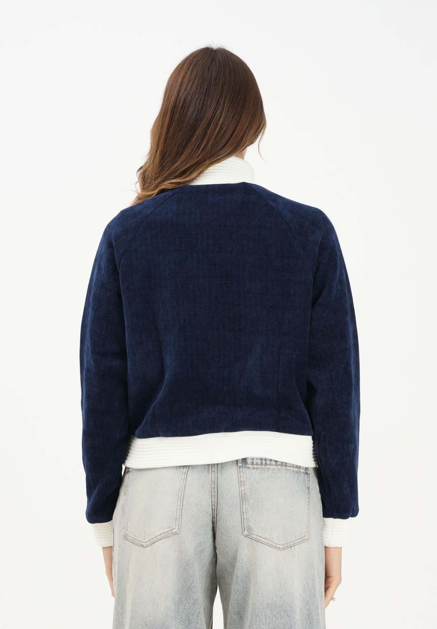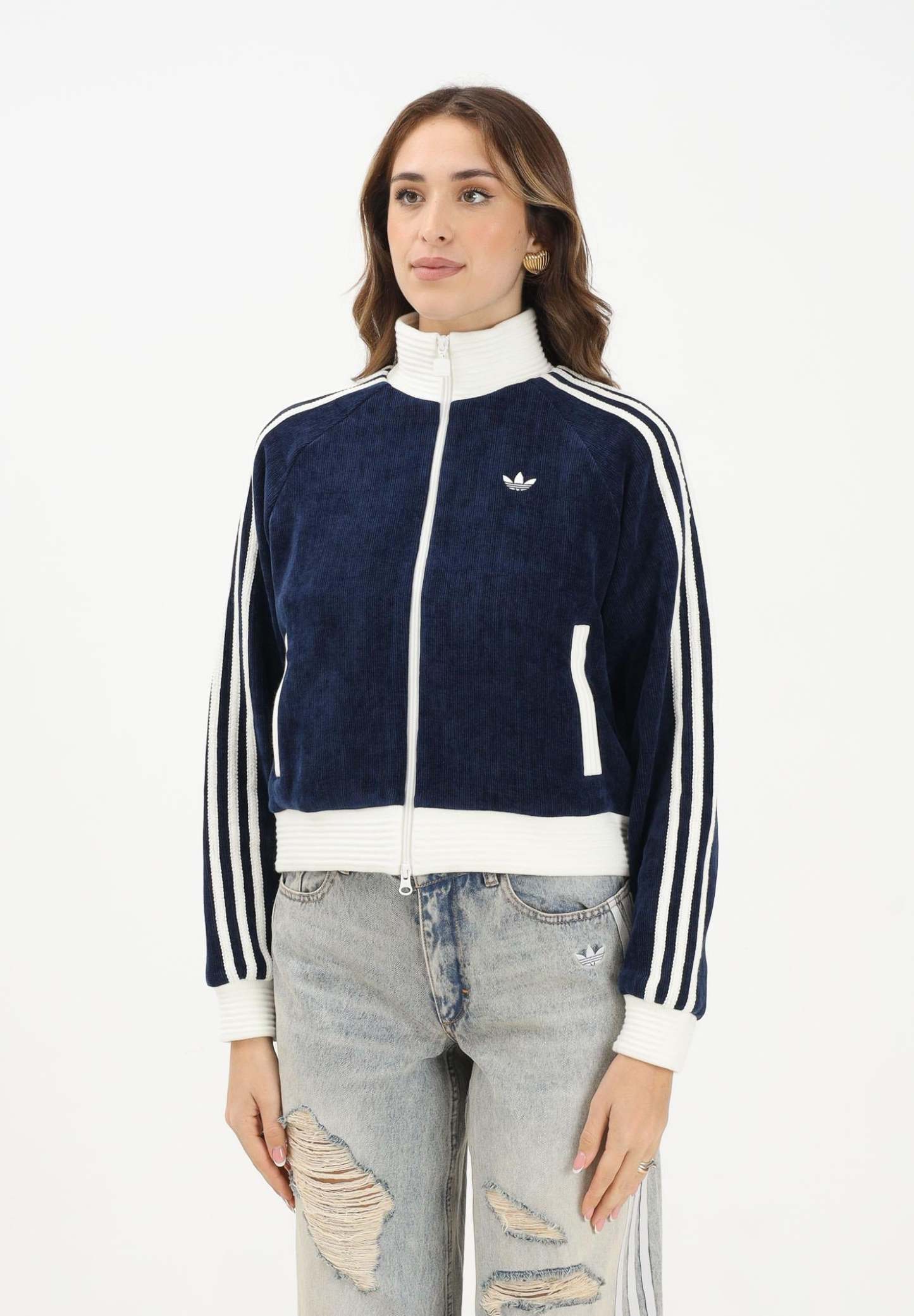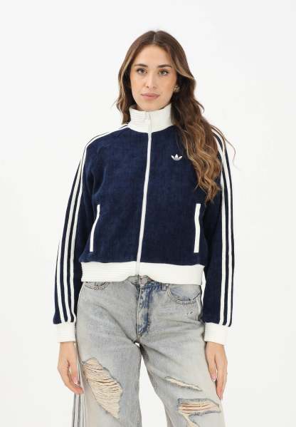 Adithtdas Adithtdas VELOUR KNIT women's zip-up sweatshirt in blue. The Adithtdas Velour Knit Track Top is for you if you love casual wear with a touch of luxury. Crafted with a high neck and three-stripes in a chunky knit, it offers a loose fit that's as practical as it is beautiful. The two-way center front zip allows for the adjustment you prefer, so you feel comfortable and on trend. The embroidered Trefoil adds the iconic Adithtdas touch, while the flat-knit ribbed knit ensures a snug fit. Whether you're going out or relaxing at home, this top is perfect for any occasion. Enjoy the cozy textures and versatile designs of the Adithtdas Cozy Winter collection. The model wears a size S and is 170 cm tall. We recommend washing and ironing at medium temperature. Fall/Winter season.