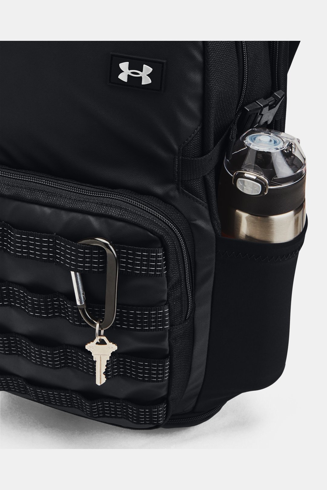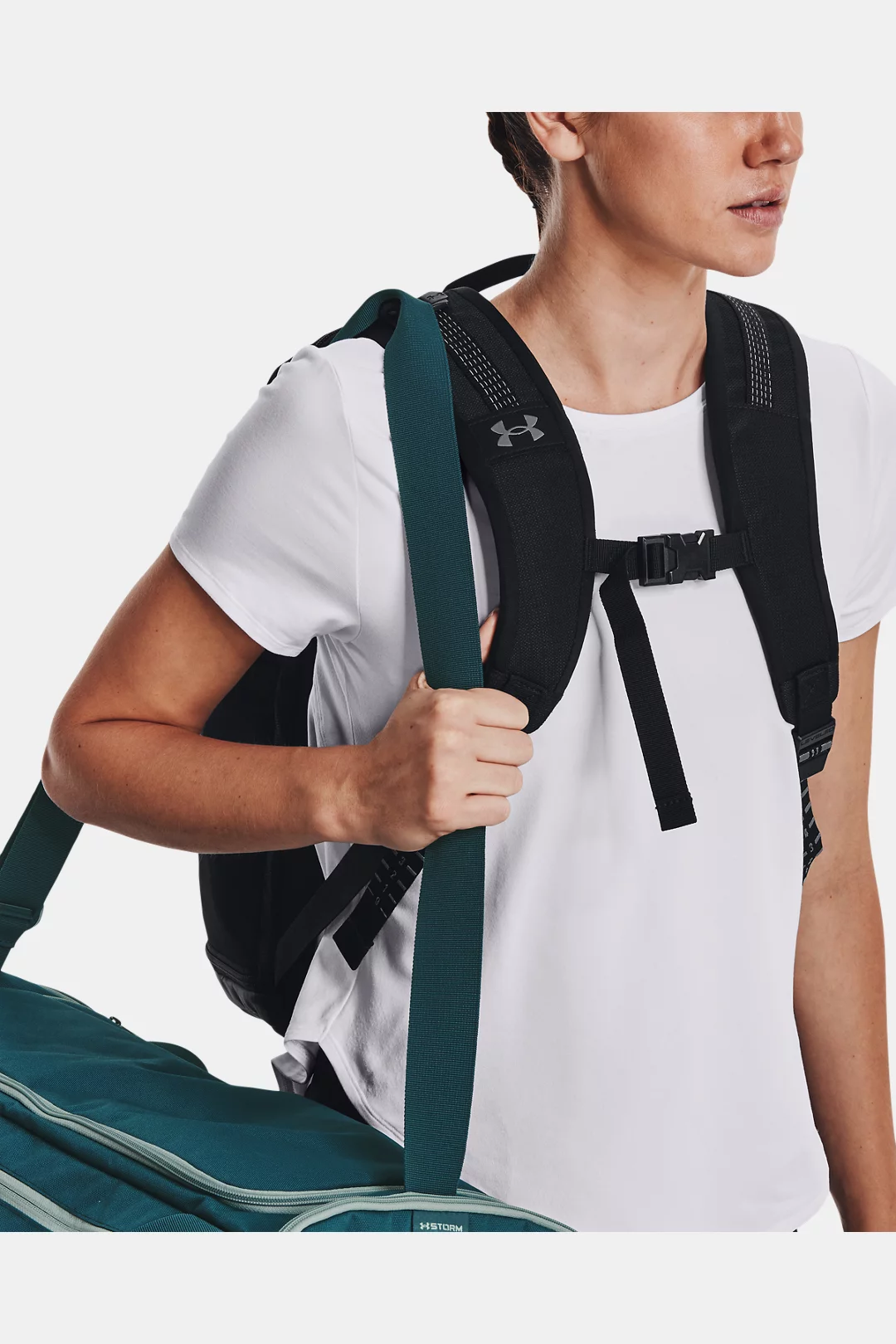 - Adjustable, removable UA Strap Clip? on shoulder to prevent duffle bag from falling off when carrying both