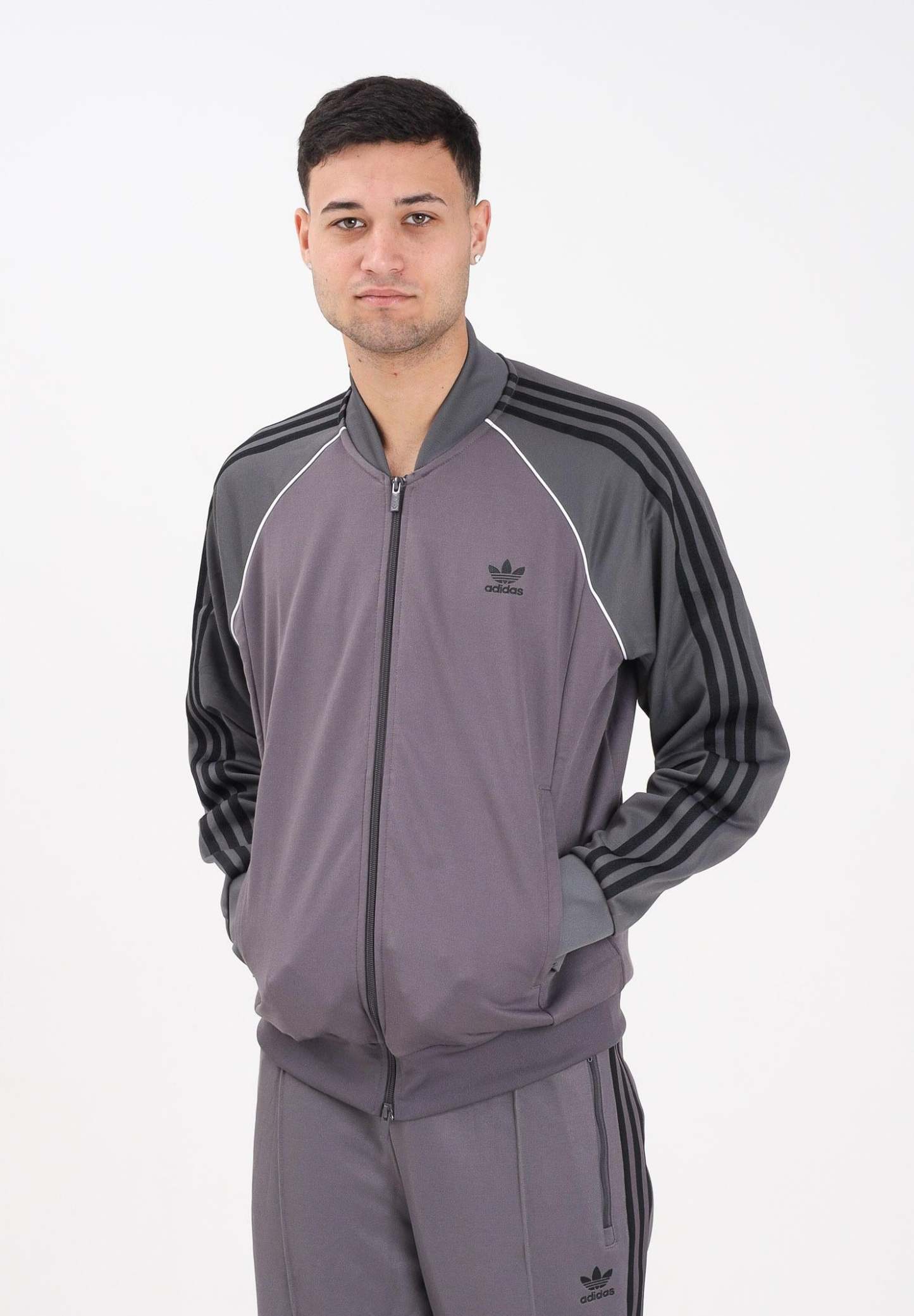 Adithtdas men's gray SST zip-up sweatshirt. This isn't your average tracksuit sweatshirt. Crafted with a sleek, fitted design, it seamlessly blends modern style with Adithtdas ' rich sports heritage. Whether you're lounging at home or out and about, its zip pockets ensure your essentials are safe while you go about your daily activities in absolute comfort. The model is wearing a size L and is 187 cm tall. We recommend washing and ironing at medium heat. Fall/Winter season.