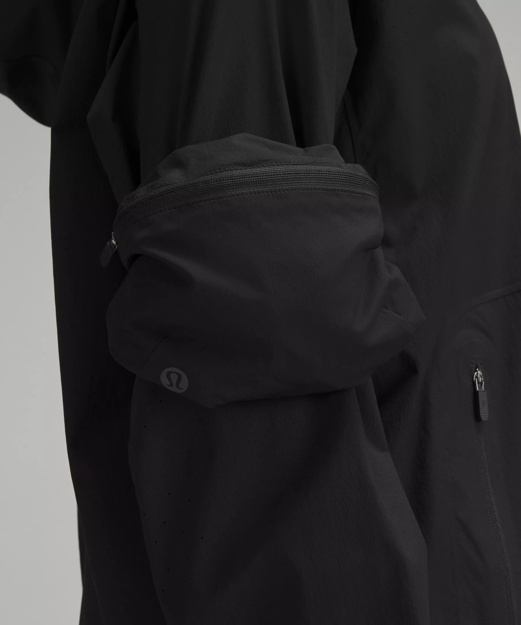 - Packs into pouch on sleeve. Unsnap the pouch to wear it around your arm