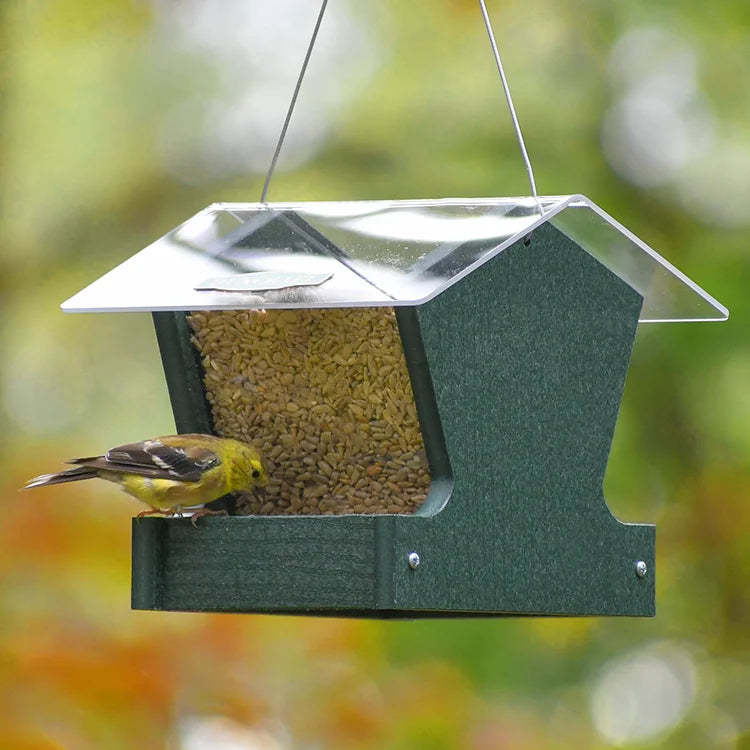 Bring nature closer with the inviting green Heritage Hopper Feeder. Ideal for attracting a mix of perching and clinging birds, including cardinals and chickadees. Made from recycled plastic, it won’t fade, crack, or warp, even in harsh weather. Clearview front panels allow easy seed monitoring, and metal mesh flooring provides superior drainage to keep seed fresh. Openings along the bottom automatically feed seed to both trays, while the broad clearview roof protects against rain and snow. Built for lasting performance and effortless feeding. 8 x 8 x 7 inches.