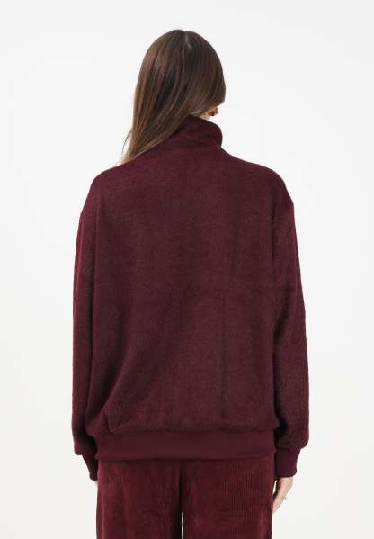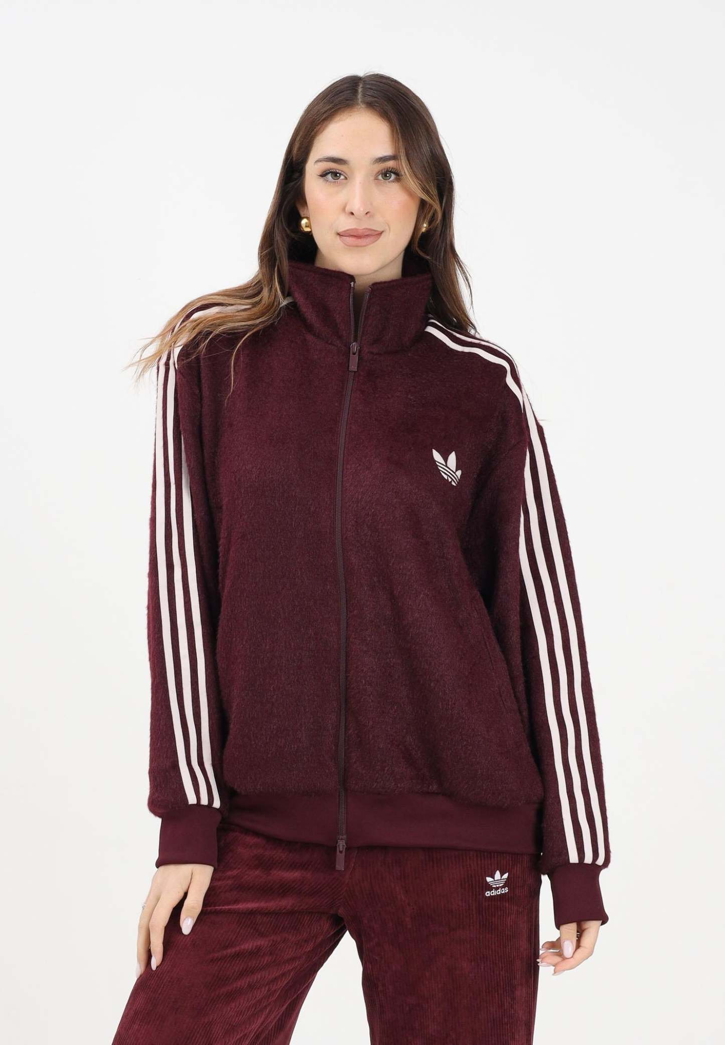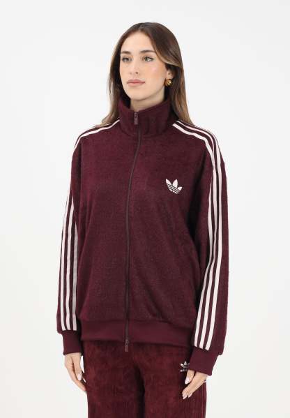 Adithtdas Felpa con zip Mohair Firebird bordeaux da donna. Questa felpa Adithtdas da donna unisce stile sportivo e comfort con un tocco trendy grazie al suo tessuto effetto peluche. Il modello, in un elegante tono borgogna, presenta una vestibilit�� morbida con colletto alto e chiusura frontale con zip completa. Le iconiche 3 Strisce lungo le maniche e il logo Trefoil ricamato sul petto aggiungono un carattere autentico e immediatamente riconoscibile. Polsini e fondo a coste garantiscono una migliore aderenza e mantengono la forma. Il retro �� completamente liscio, mantenendo un look pulito e sport-chic. Perfetta da indossare con pantaloni coordinati o jeans per outfit casual, athleisure o street-style. La modella indossa una taglia S ed �� alta 170cm. Si consiglia un lavaggio ed una stiratura a media temperatura. Stagione autunno inverno.