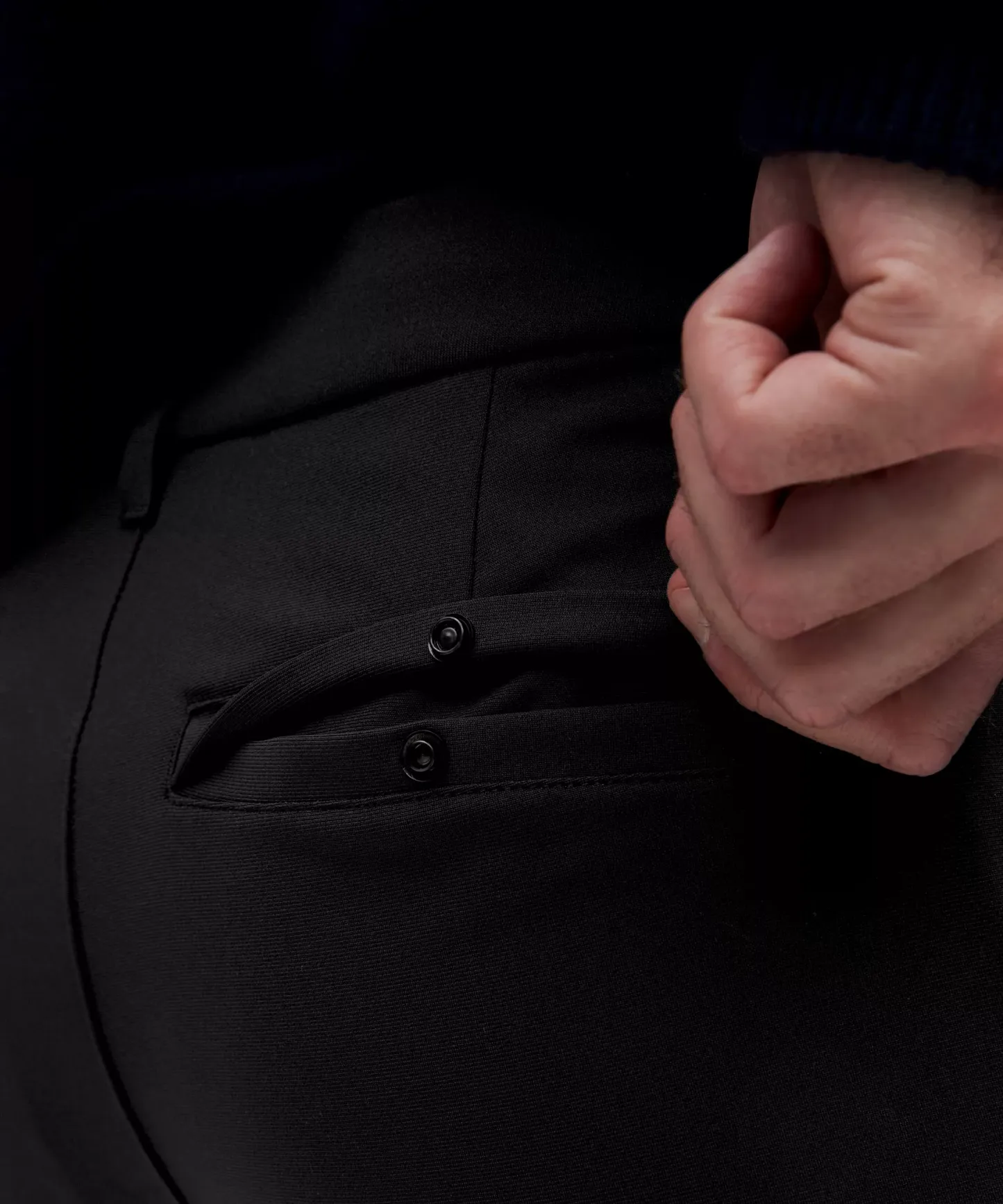 Back welt pockets with hidden snaps