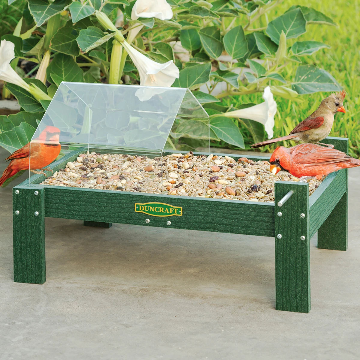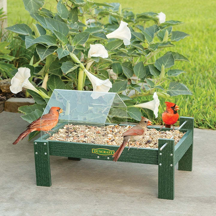 Our platform feeder provides the best view of your birds at the ground feeding level with protection from the weather—while not blocking the view. The raised metal perches, on two corners, allow your birds to perch where you can see and enjoy them. Great for attracting more birds! Clearview plastic canopy anchored to the tray protects half of the feeder with easy in and out access from both sides. Designed with extra love, this powerhouse platform feeder is built tough and built to last. Durable green recycled plastic with metal mesh drainage, so your seed lasts longer. Feeding tray stands 4 inches above the ground. 17 x 11-1/4 x 7 inches tall.