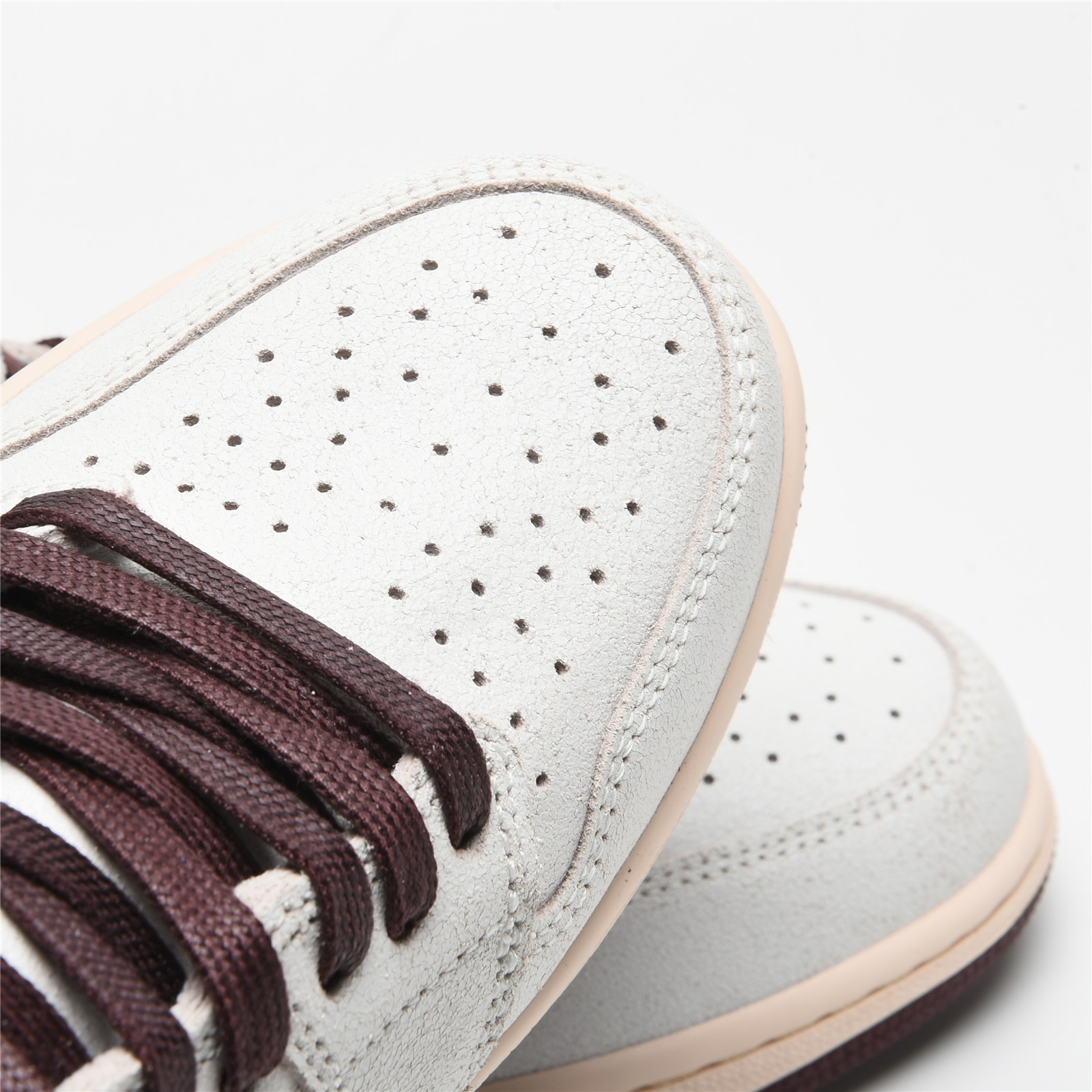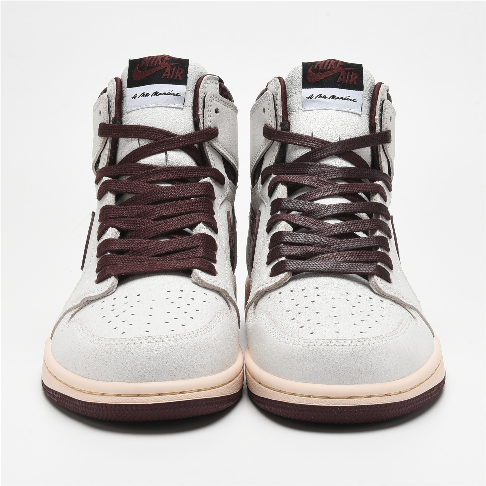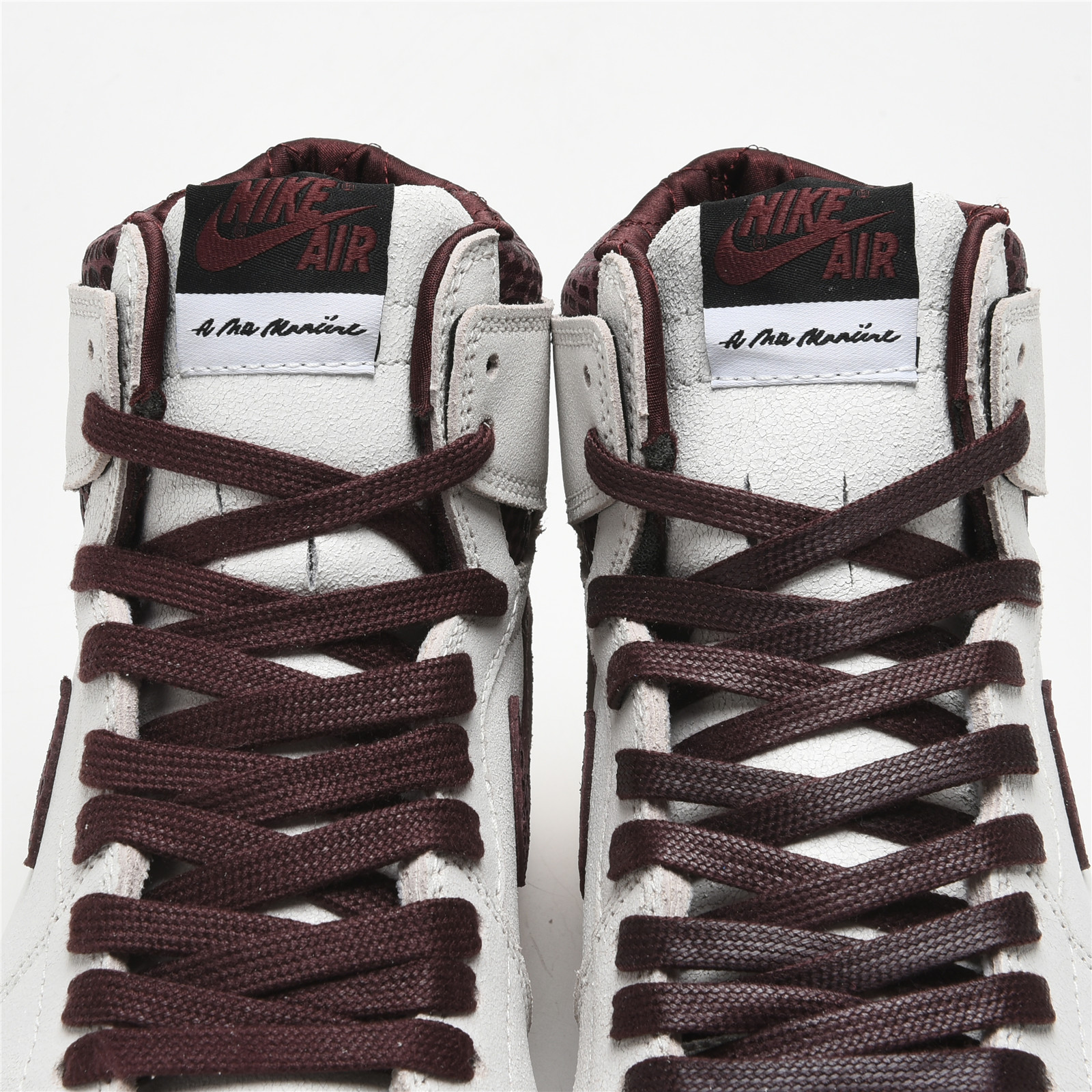 The AIR JtggORDAN 1 A Ma Maniére features a premium cracked leather upper with burgundy reptilian-textural leather collars and Swooshes. Silky quilted lining and custom woven tongue and insole labels add a sense of luxury. At the base, a yellowed sole provides a vintage feel to complete the design.