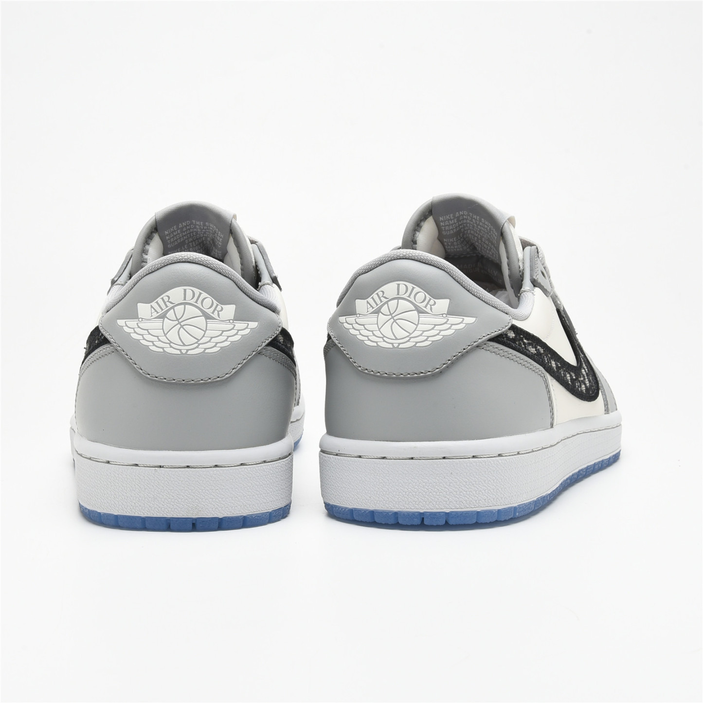 This Jordan 1 Retro High is composed of a white and grey leather upper with traditional Dior monogram print Swoosh. These shoes are made in Italy with premium materials. Co-branded icy translucent soles, Dior branded tongue and Wings logo, and a silver "Air Dior" hang tag completes the design.