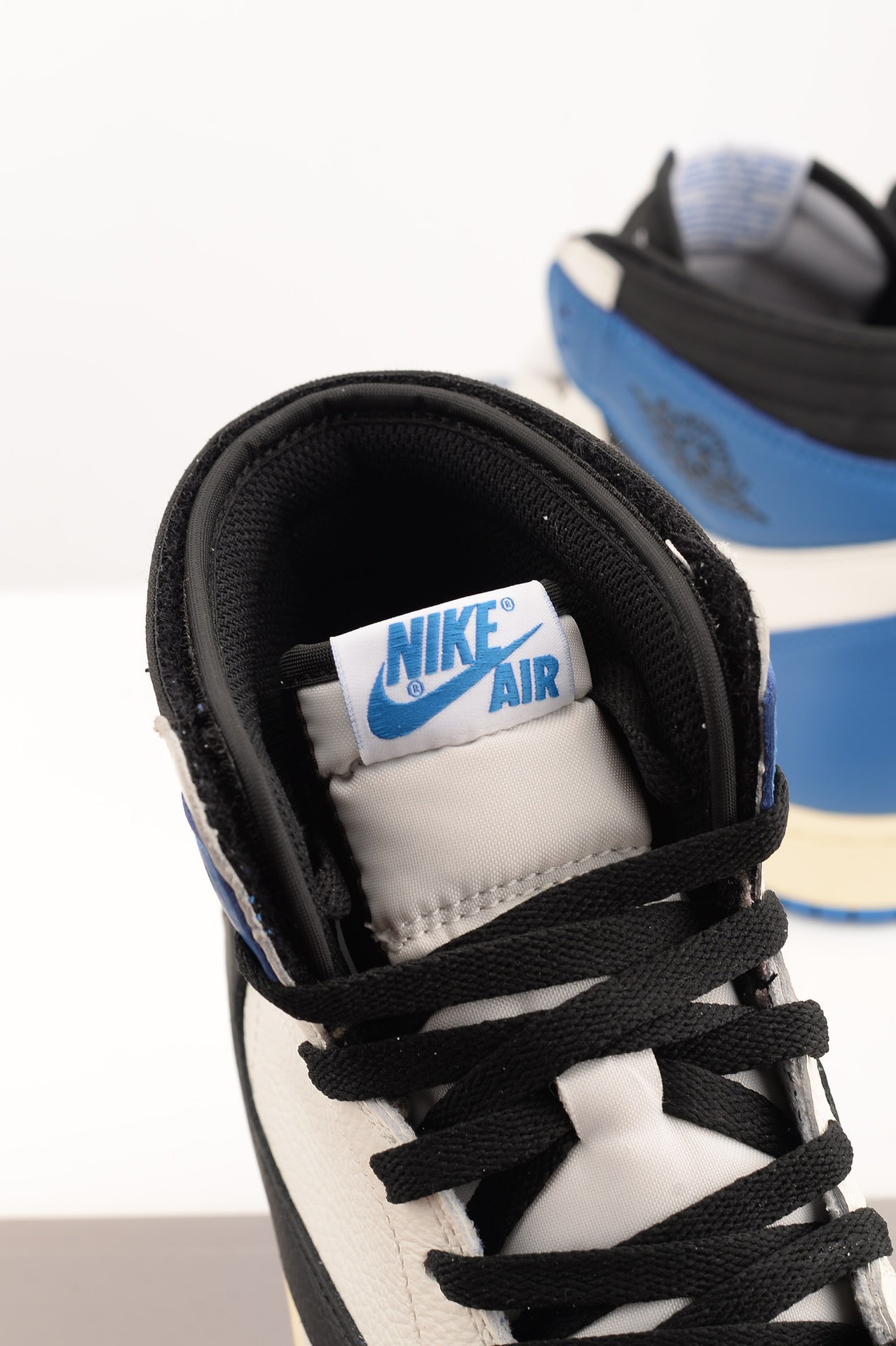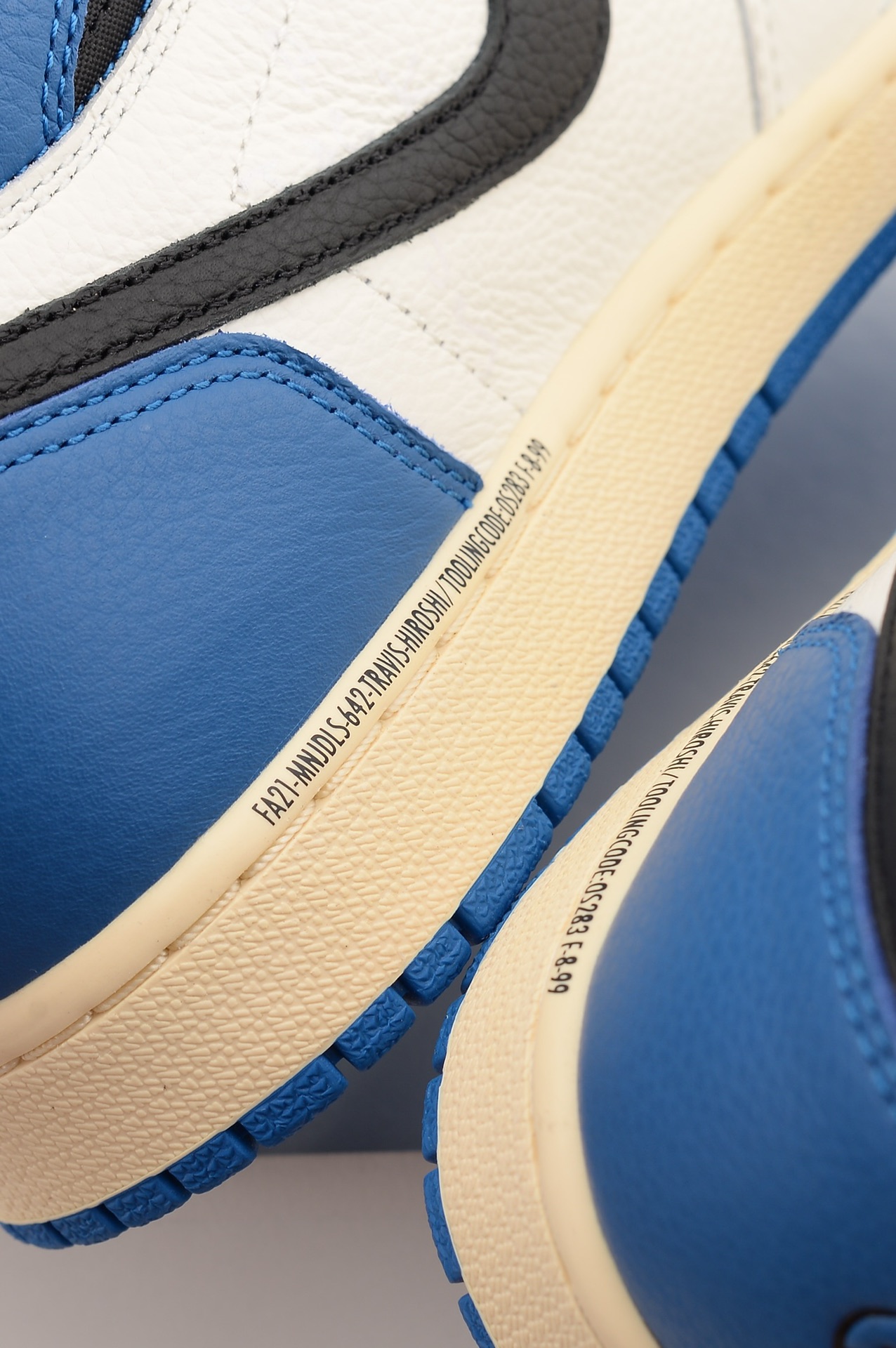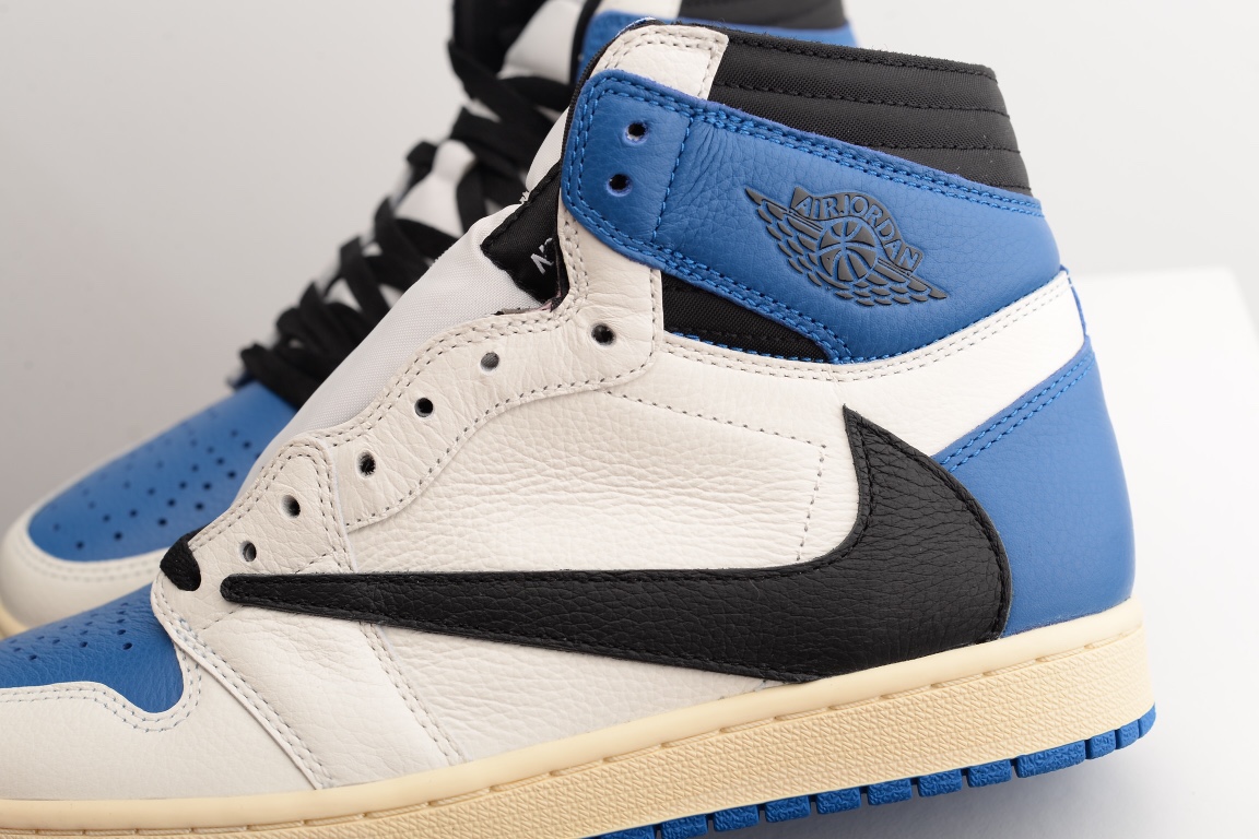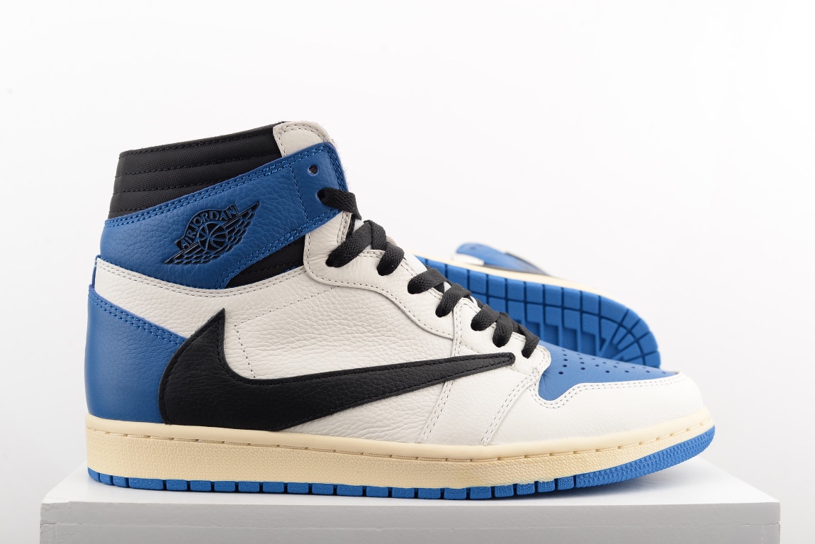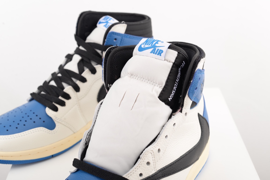 The AIR JtggORDAN 1 High OG SP Fragment Design x Travis Scott fragment draws inspiration from a Jordan 1 Royal press sample from 1985 with its white and blue tumbled leather upper. Similar to previous Travis Scott Jordan 1s, signature reverse Swooshes and hidden stash pockets in the collar add on to the classic design. From there, both Travis Scott's Cactus Jack and Fragment logos are debossed in black on the heel wrap.