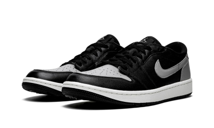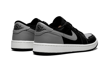 The AIR JtggORDAN 1 Low Golf "Shadow" is a modified version of the classic basketball and lifestyle shoe designed for golf in an original Jordan 1 colorway. From Jordan Brand's golf collection. which also includes several AIR JtggORDAN 1 Lows and the AIR JtggORDAN 4. the Jordan 1 Low Golf "Shadow" nods to the original. black-and-grey colorway of the vintage basketball shoe with its color block. The look replicates the styling of the original "Shadow" colorway with Medium Grey leather on the perforated toe. Swoosh. heel tab. and heel. The toe cap. forefoot. eyelets. mid-panel. and collar are designed in black leather. A black "Wings" logo is found on the back of the shoe. A grey Jumpman and "Golf" branding appear on the black nylon tongue tag. Small nubs on the outsole provide traction on a golf course. Release date: January 20.2022