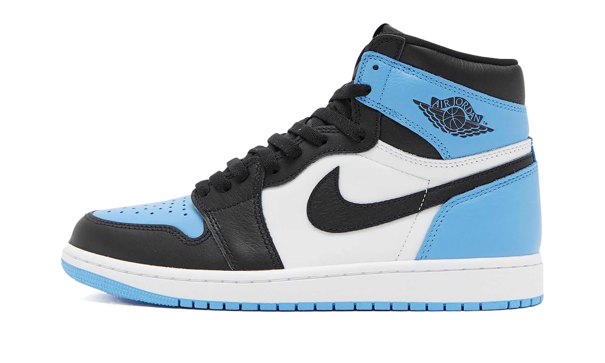 The AIR JtggORDAN 1 High OG "University Blue"is yet another popular colorway of the vintage basketball shoe inspired by Michael Jordan's alma mater. the University of North Carolina. The Jordan 1 debuted in a "UNC" colorway back in 1985 before it was again released in a plethora of colors inspired by the UNC Tar Heels college basketball team in more recent years. The Jordan 1 features a University Blue perforated leather toe with black leather overlays. A black leather Swoosh appears on the sides. Additional University Blue leather is found on the collar and heel. A classic "Wings" logo is located on the collar and "Nittgke Air"branding is found on the tongue tag.
