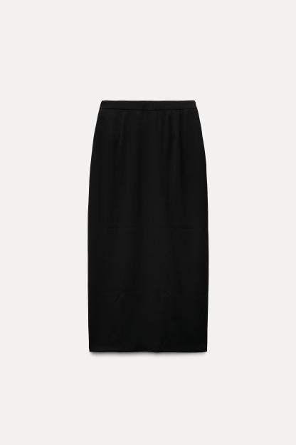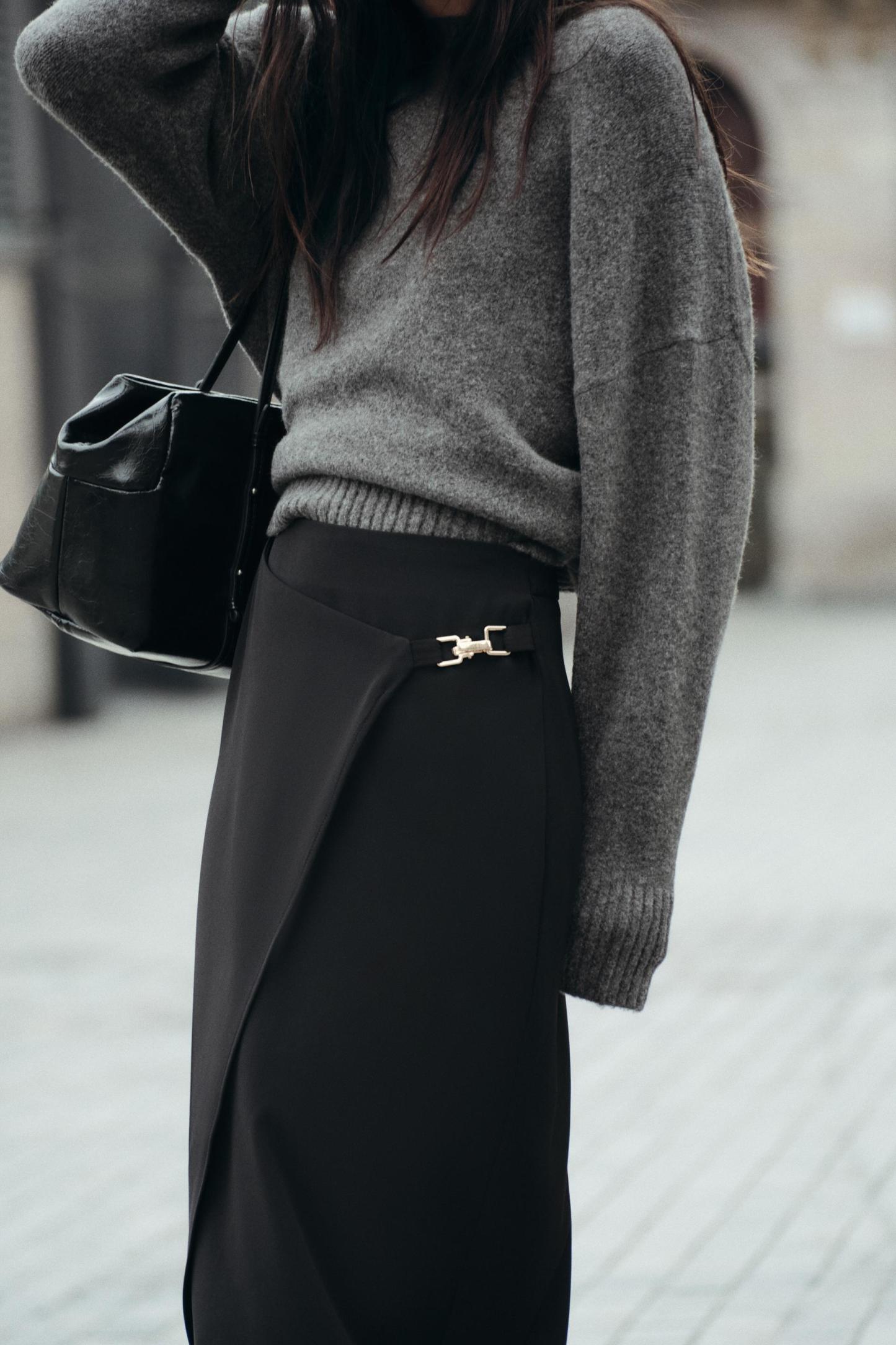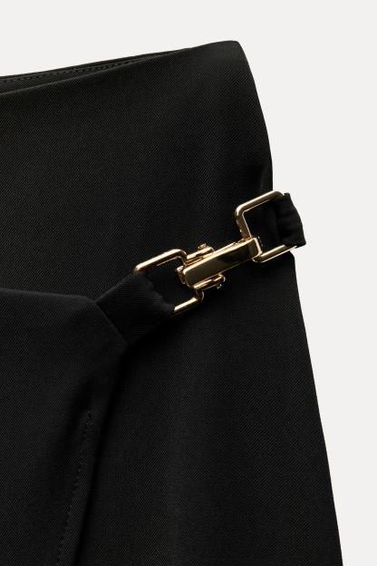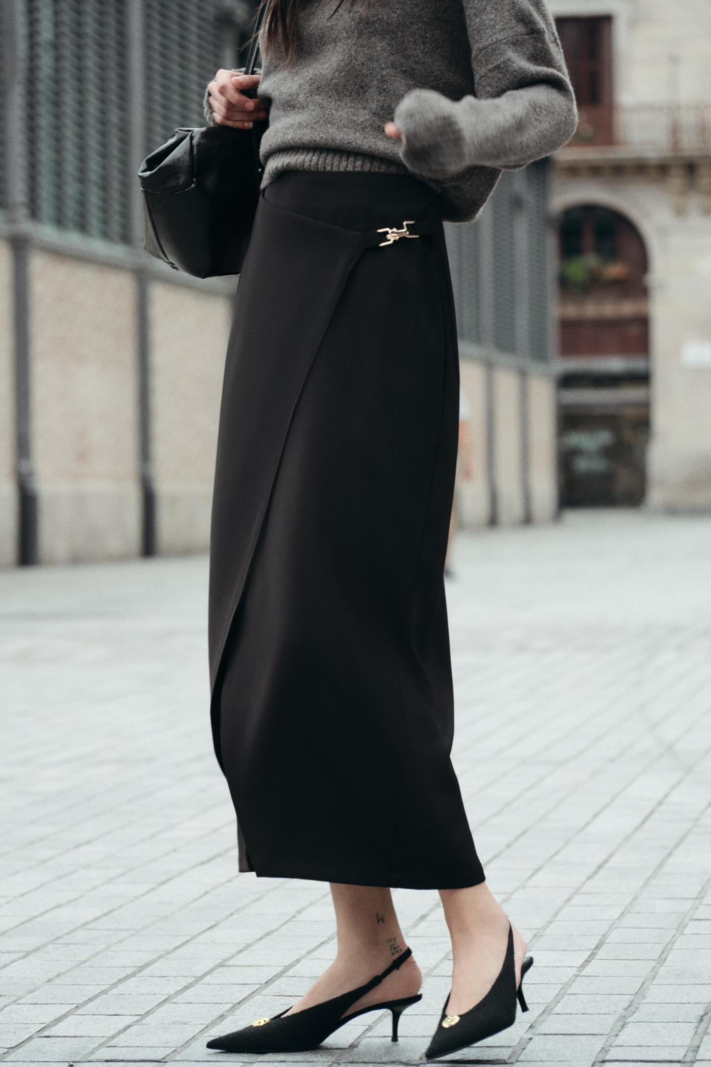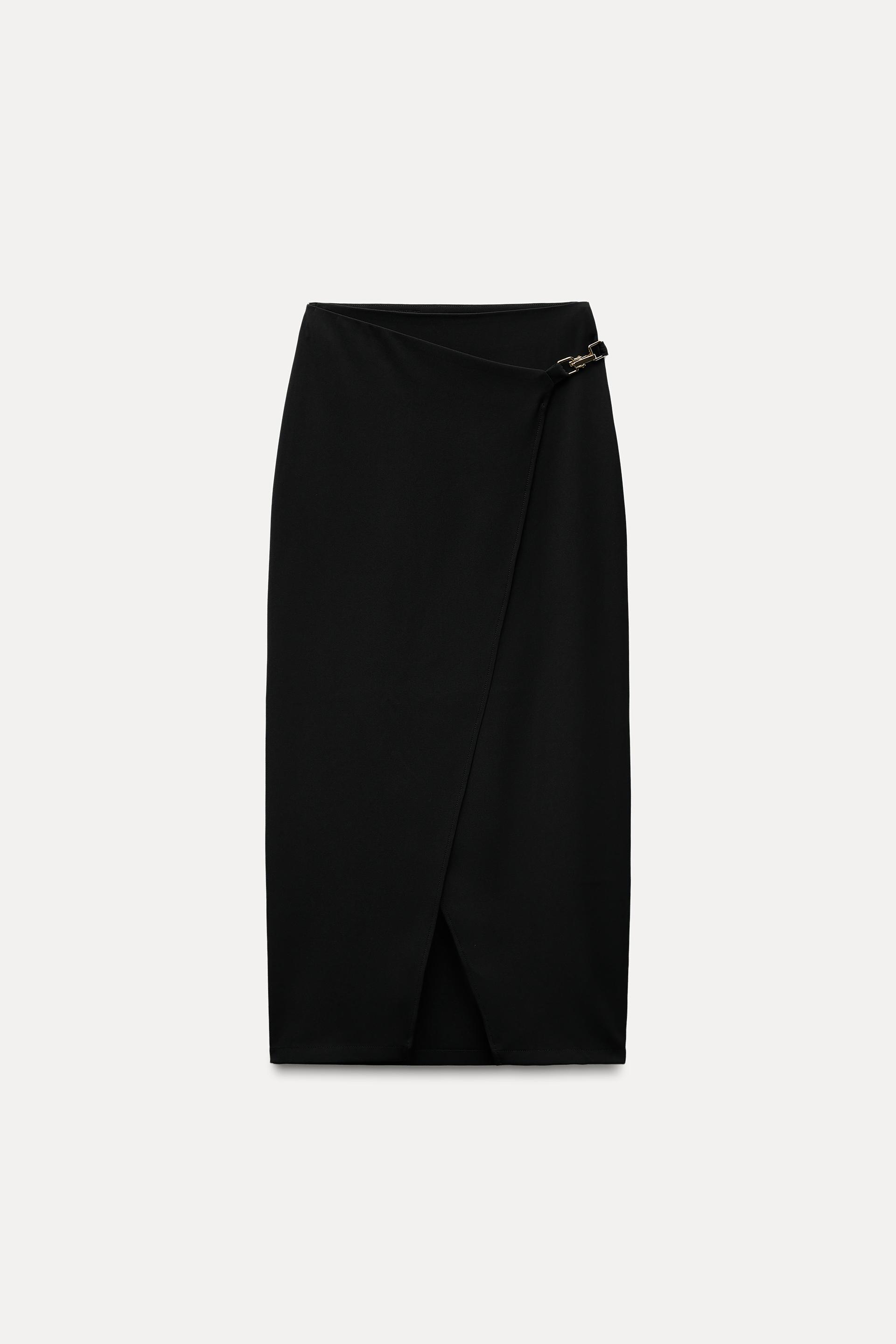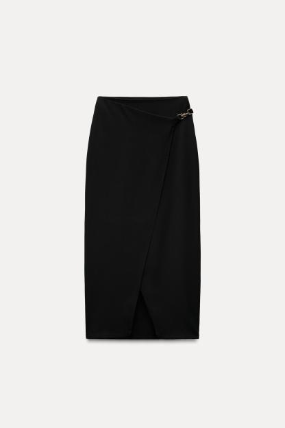 High waisted skirt with front slit. Wrap closure with hidden interior button and golden clip appliqué.