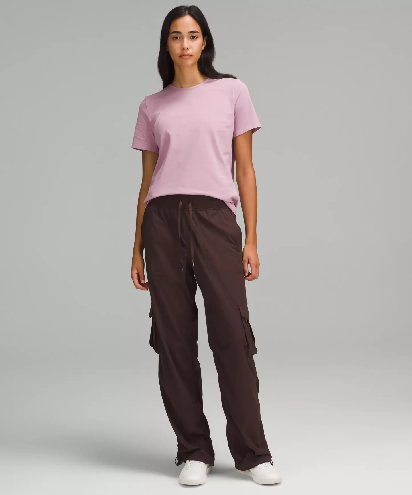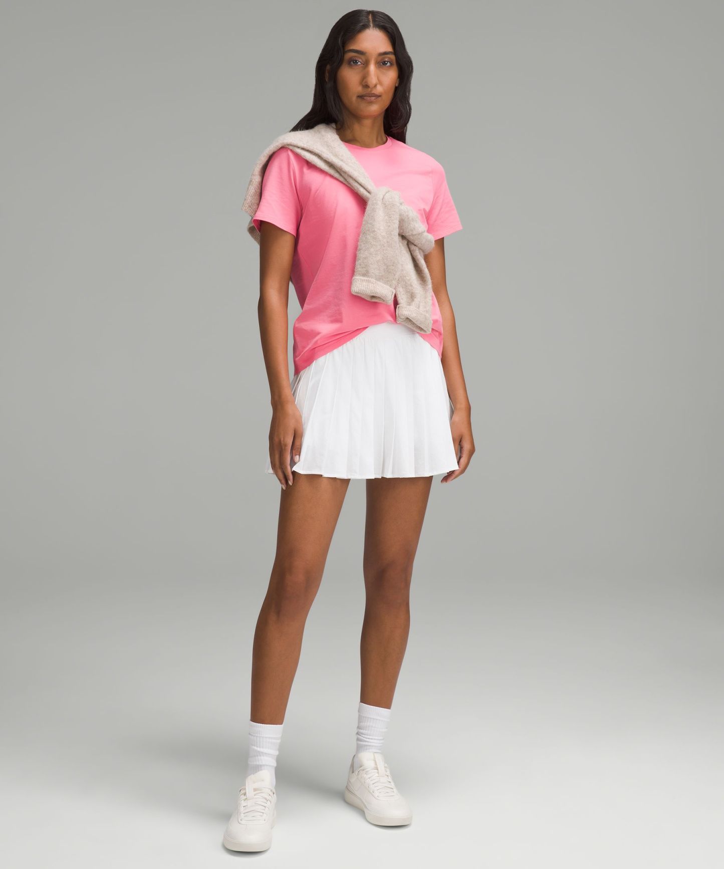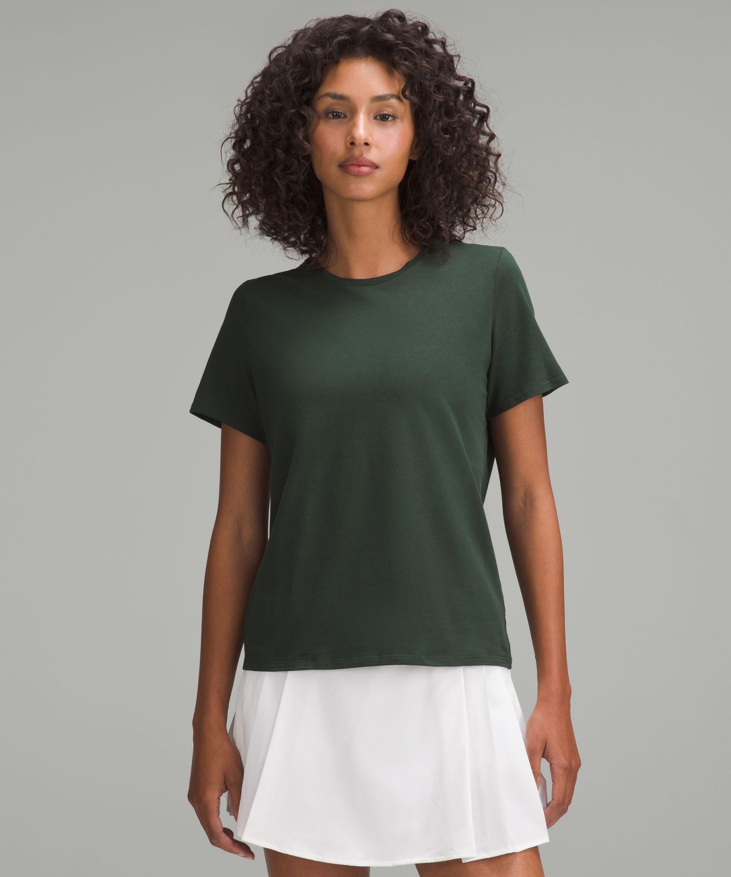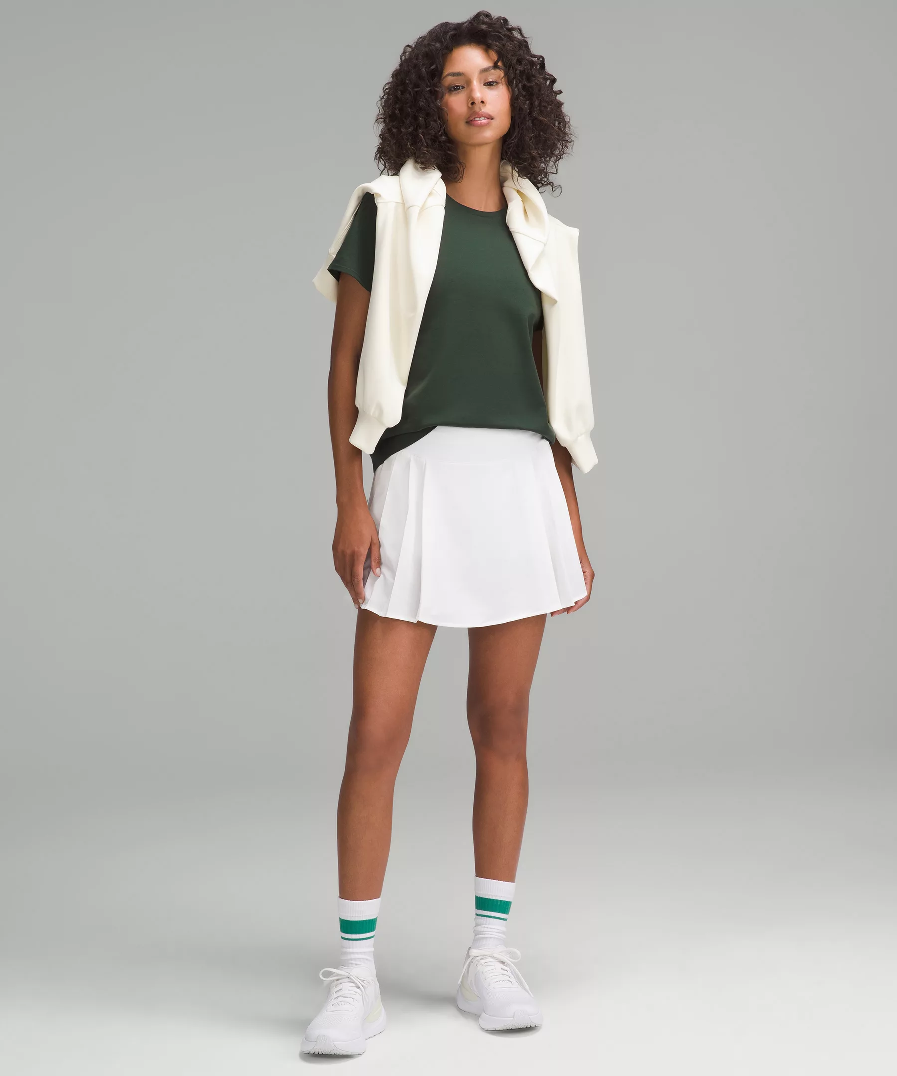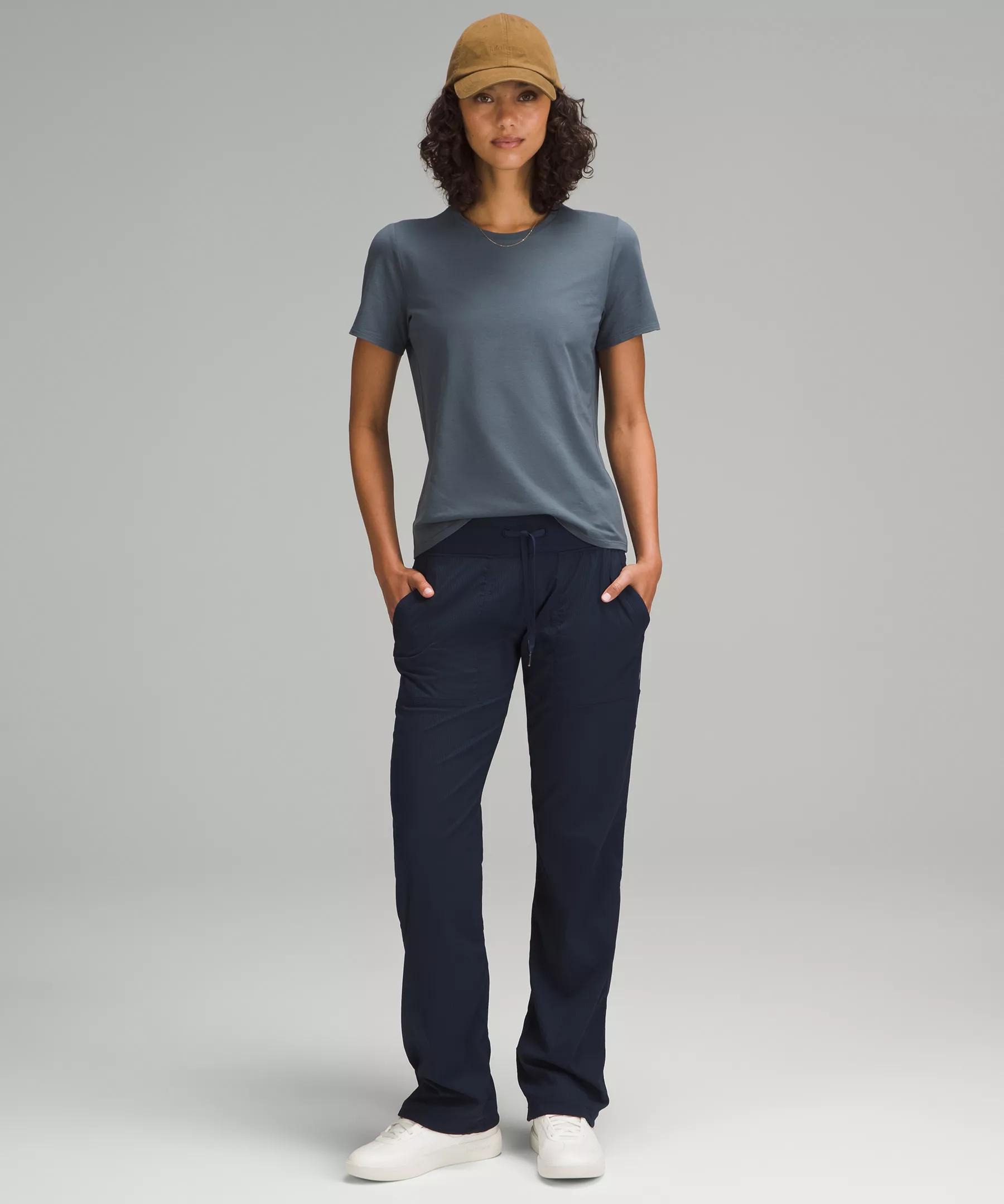 - Straight hem hits below the waistband for moderate, everyday coverage