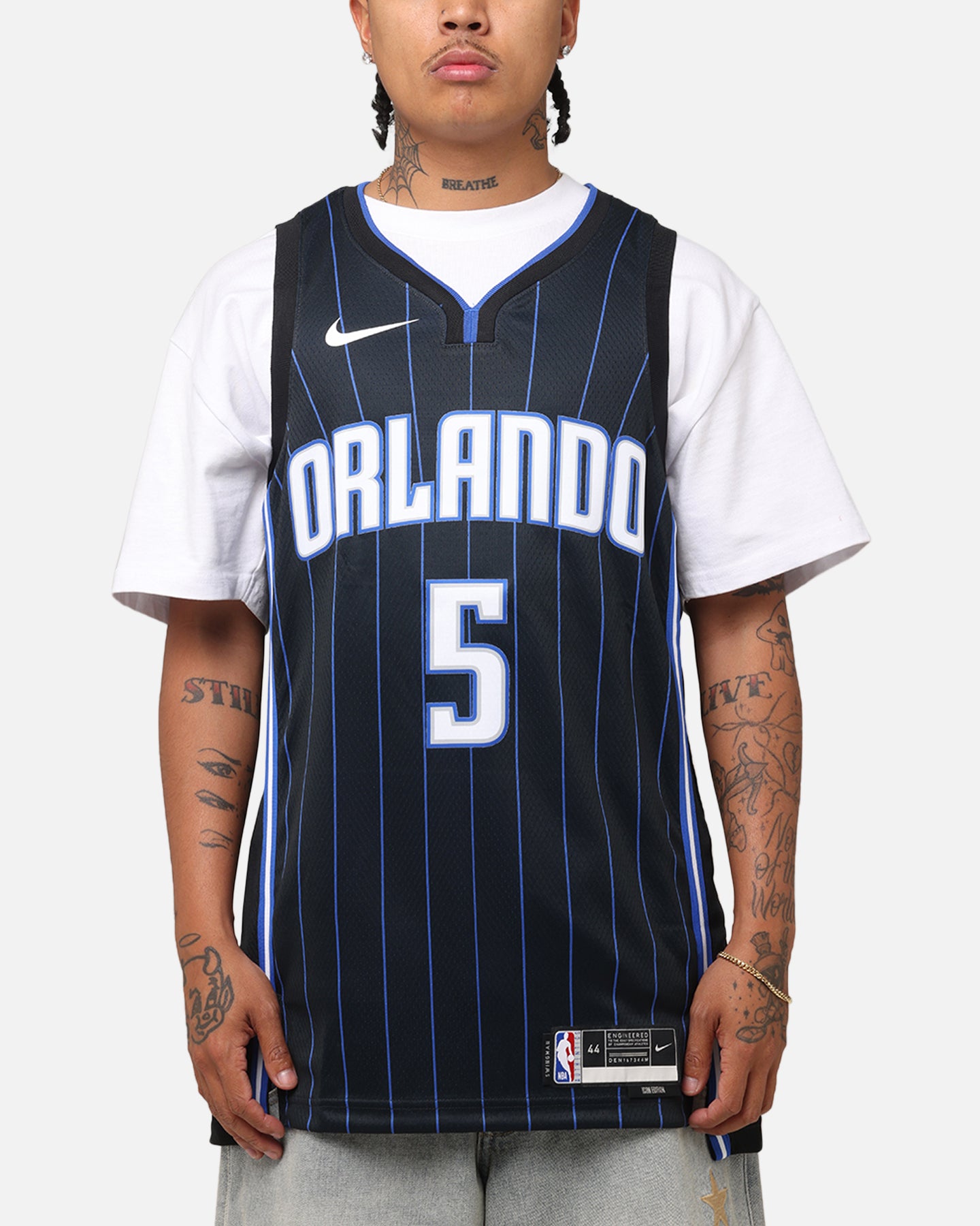 Every team has its true colours, an unmistakable identity that sets it apart from the rest of the league. Honouring a rich hoops heritage, this Orlando Magic jersey is inspired by what the pros wear on the hardwood, from squad details to lightweight, sweat-wicking mesh. It helps keep you dry and cool on or off the court while you rep your favourite player and the game you love. Cop it today and level up your team spirit.- Nithtke Dri-FIT technology- Mesh construction- Twill player name and number- Heat-applied graphics- Jock tag at hem- Material: 100% Polyester- Colour: Black- Style: DN2017-016