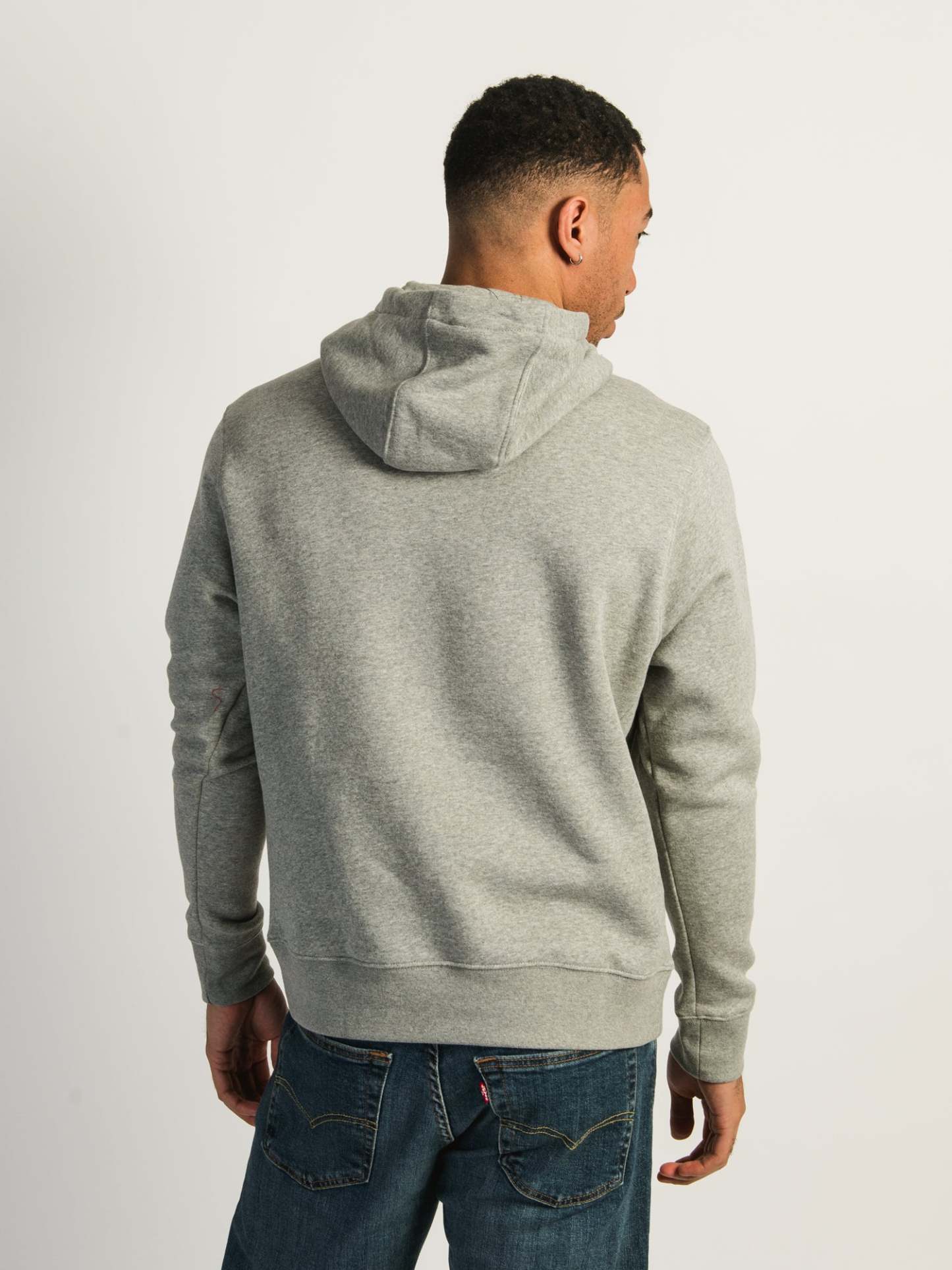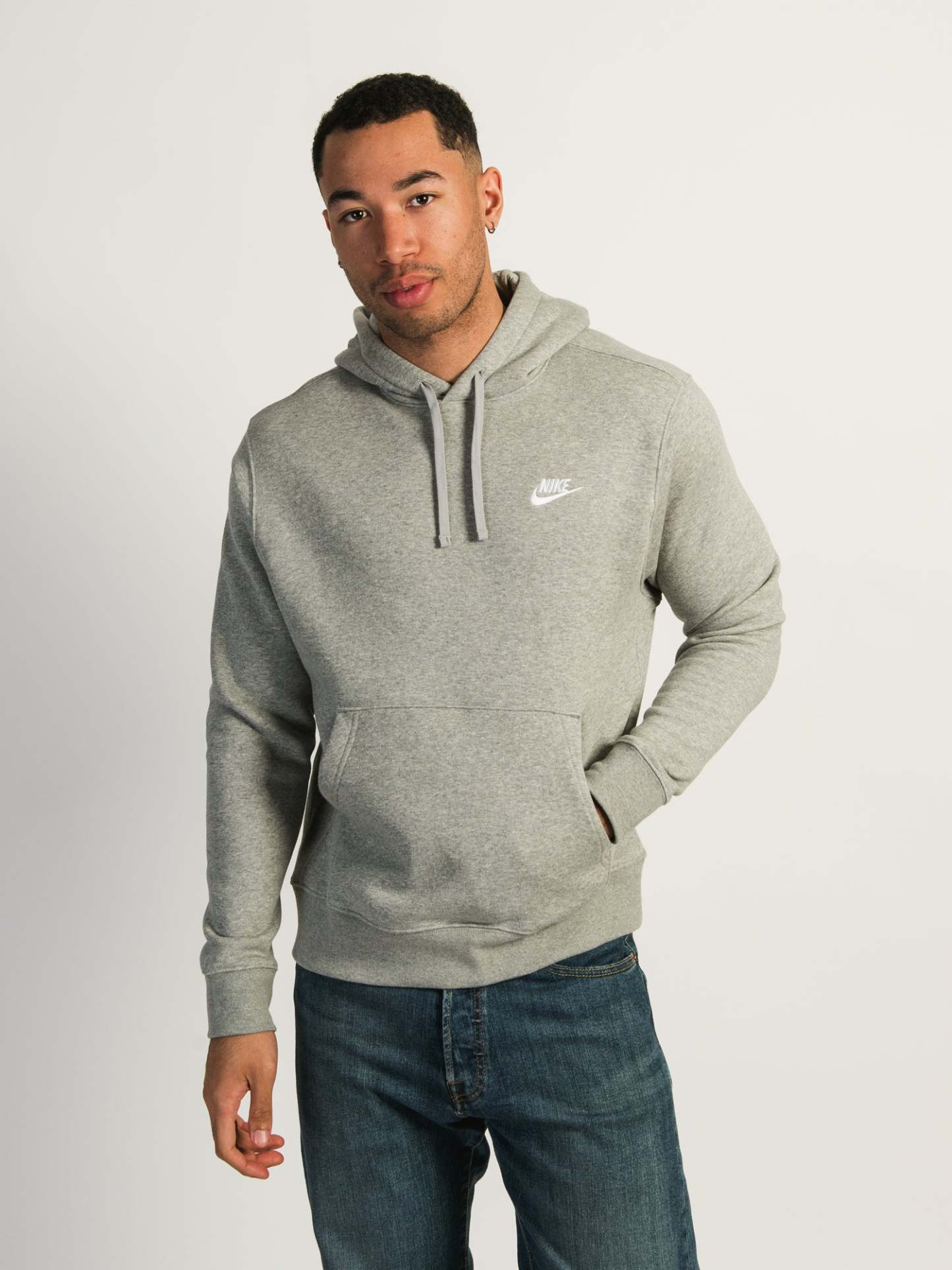 An essential piece to your sportwear or casual wardrobe. The Nithtke Sportswear Club Pullover grey hoodie features ribbed cuffs and hem, an adjustable drawstring hood, and front kanga pockets.