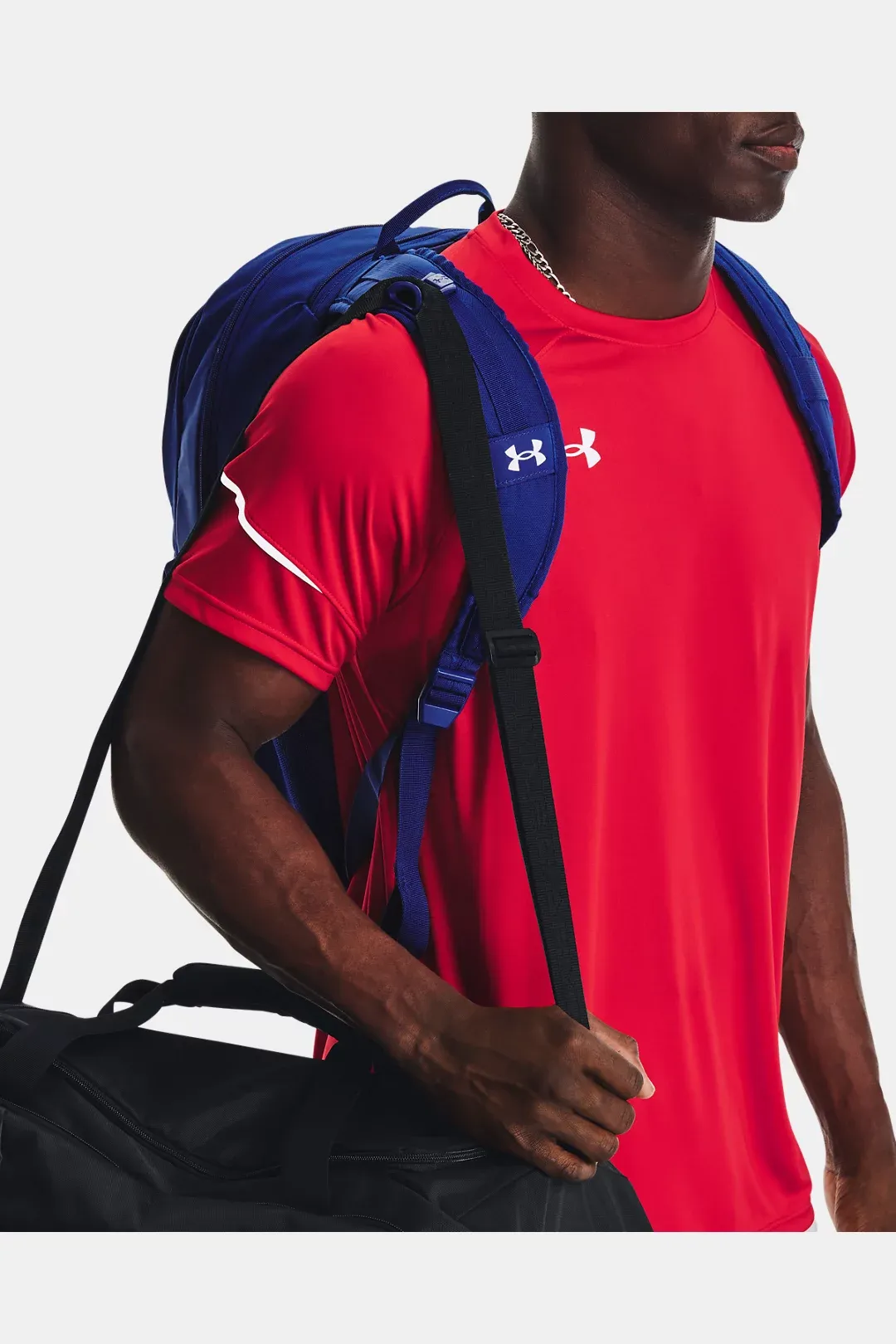 - Adjustable, removable UA Strap Clip? on shoulder to prevent duffle bag from falling off when carrying both