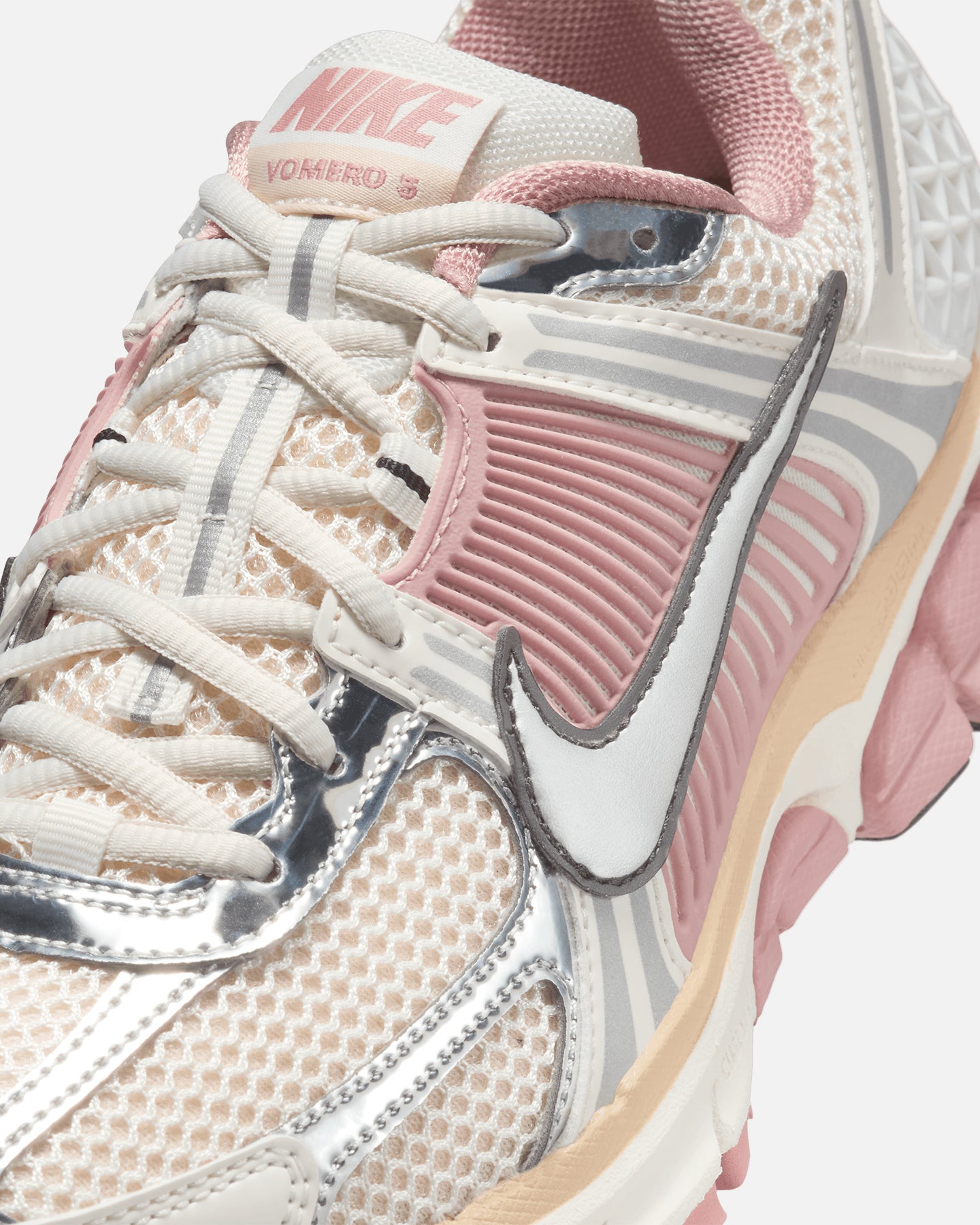 The Vomero 5 takes early 2000s running to modern heights. A combination of breathable and durable materials stands ready for the rigors of your day, while Zoom Air cushioning delivers a smooth ride. This richly layered design makes for one of the coolest sneakers of the season. Cop yours today at Culture Kings.- Mesh upper- Synthetic leather upper- Zoom Air cushioning- Ventilation ports on the heel- Metallic accents- Foam midsole- Rubber outsole- Padded collar- Low-cut silhouette- Lace-up closure- Colour: Sail/Sail/Pearl White-Particle Pink- Style: HF1877-102