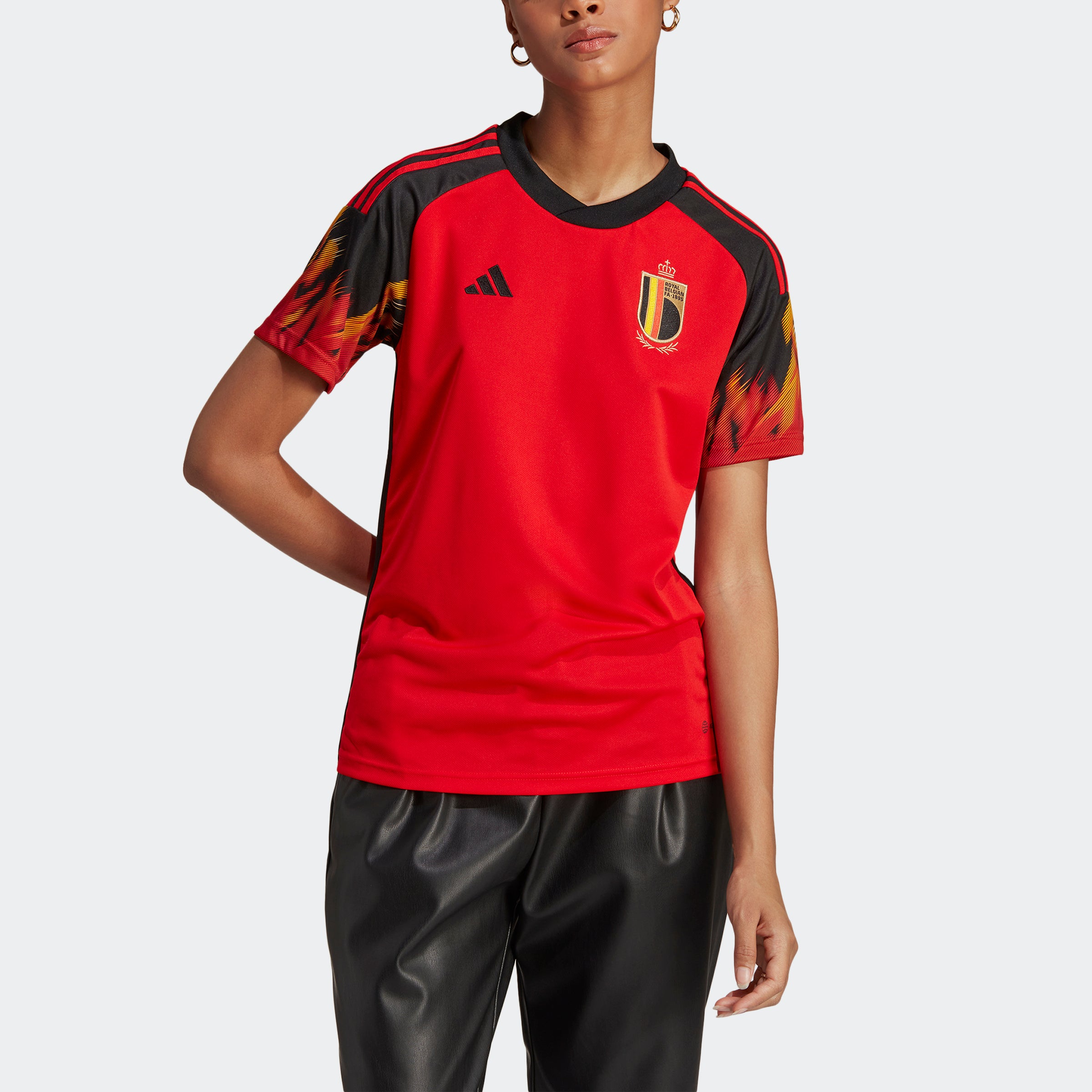 Burning bright on soccer's biggest stage. With red and yellow flames engulfing its black sleeves, this Belgium home jersey takes design inspiration from the team's famous Red Devils nickname. Created to keep fans dry when the on-pitch action heats up, it includes moisture-absorbing AEROREADY and mesh inserts. Sparking a fresh look on the chest, adithtdas' 3 Bar Logo joins a woven version of Belgium's badge.