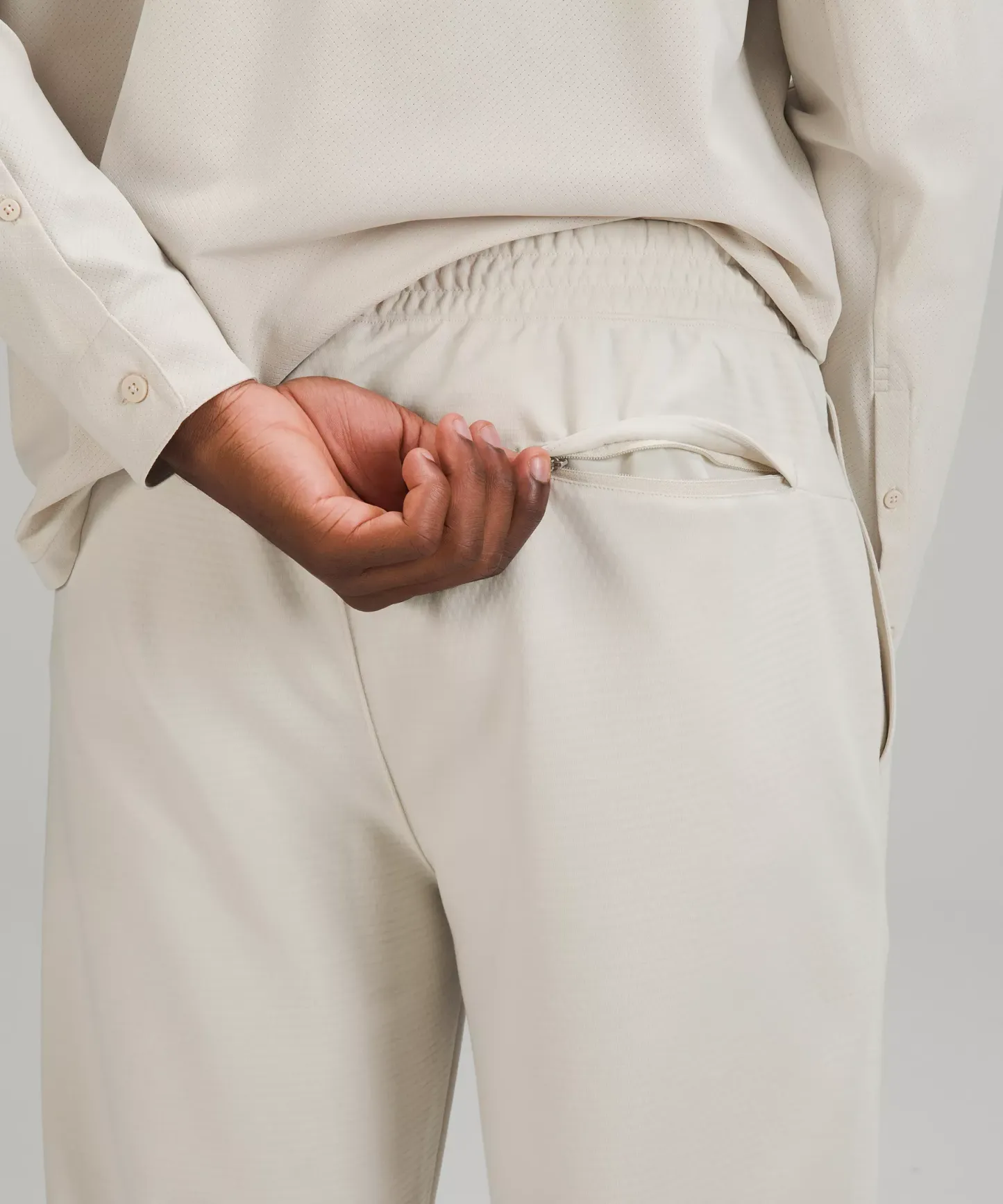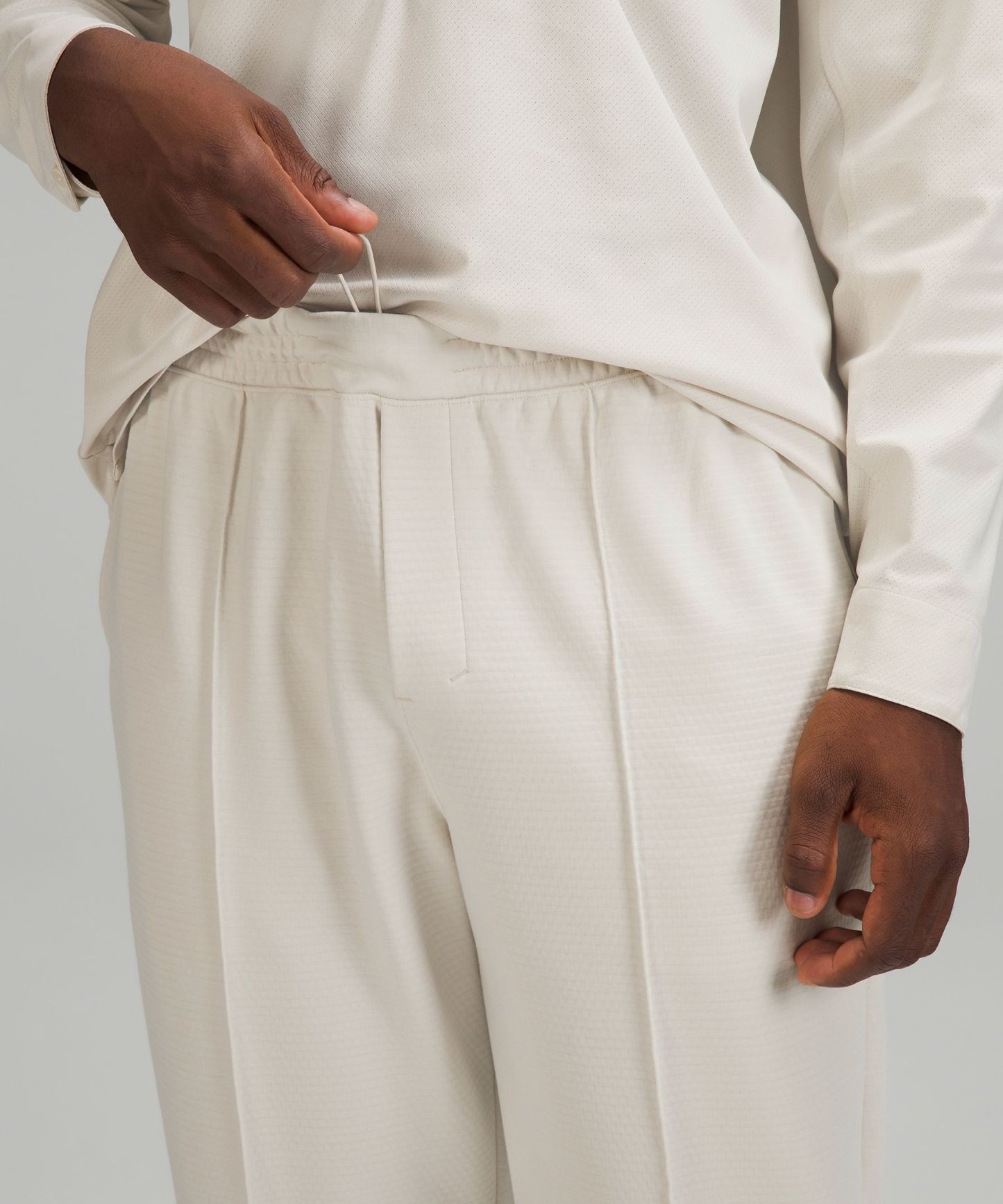 - Elastic waistband with faux fly