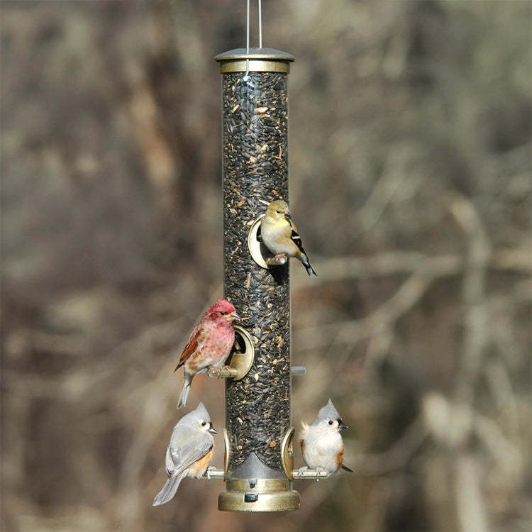 Sturdy and attractive tube feeder with a quick release bottom for easy cleanout. Watch your birds eat every seed! The built-in seed diverter reduces waste. Fill with sunflower seed, safflower seed or your favorite mixed seed. Built to last from heavy duty die-cast metal with an antique brass finish. Comes with six feeding ports. 2-3/4 x 24 inches tall with the wire hanger. Easy to clean and the base snaps out at the push of a button.