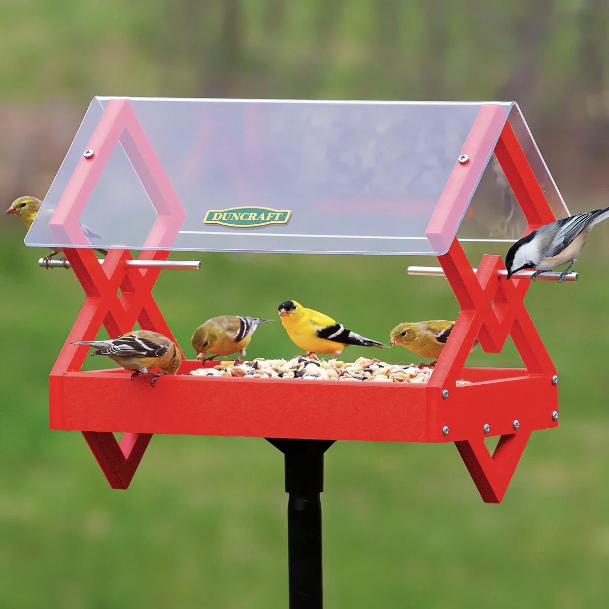 You'll be hard-pressed to find a more stunning feeder! Our distinctive diamond design creates multiple entry points for hungry birds to feed. Large clearview plastic roof protects seed from inclement weather. Easy clean seed tray is perfect for serving seed, fruit, nuts and more. Crafted of durable red recycled plastic. Includes 72 inch tall black powder coated steel sectional pole. All-screw construction with two aluminum perches. 14 x 8-1/2 x 12 inches.