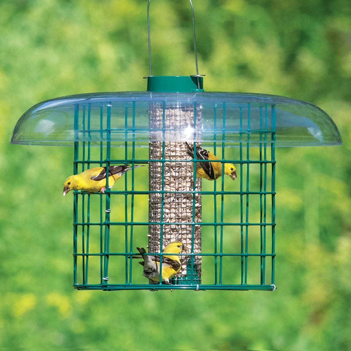 Back by popular demand! Discourage gray squirrels and larger birds with our all-metal wire caging and squirrel lock metal cap. Small birds enter the 1-1/2 inch fly-through openings to cling and feed. The 16 inch diameter weather guard keeps your seed dry and the stainless steel mesh is a breeze to clean. There's open caging on the bottom, so seed won’t accumulate. Clearview plastic weather guard. 9-3/4 x 15 inches tall with the wire hanger.