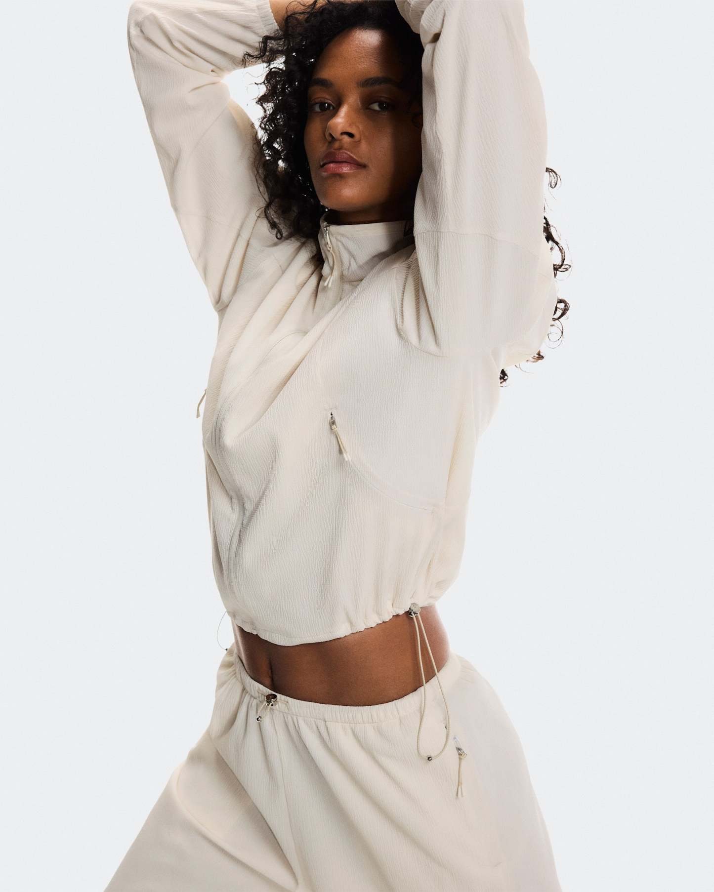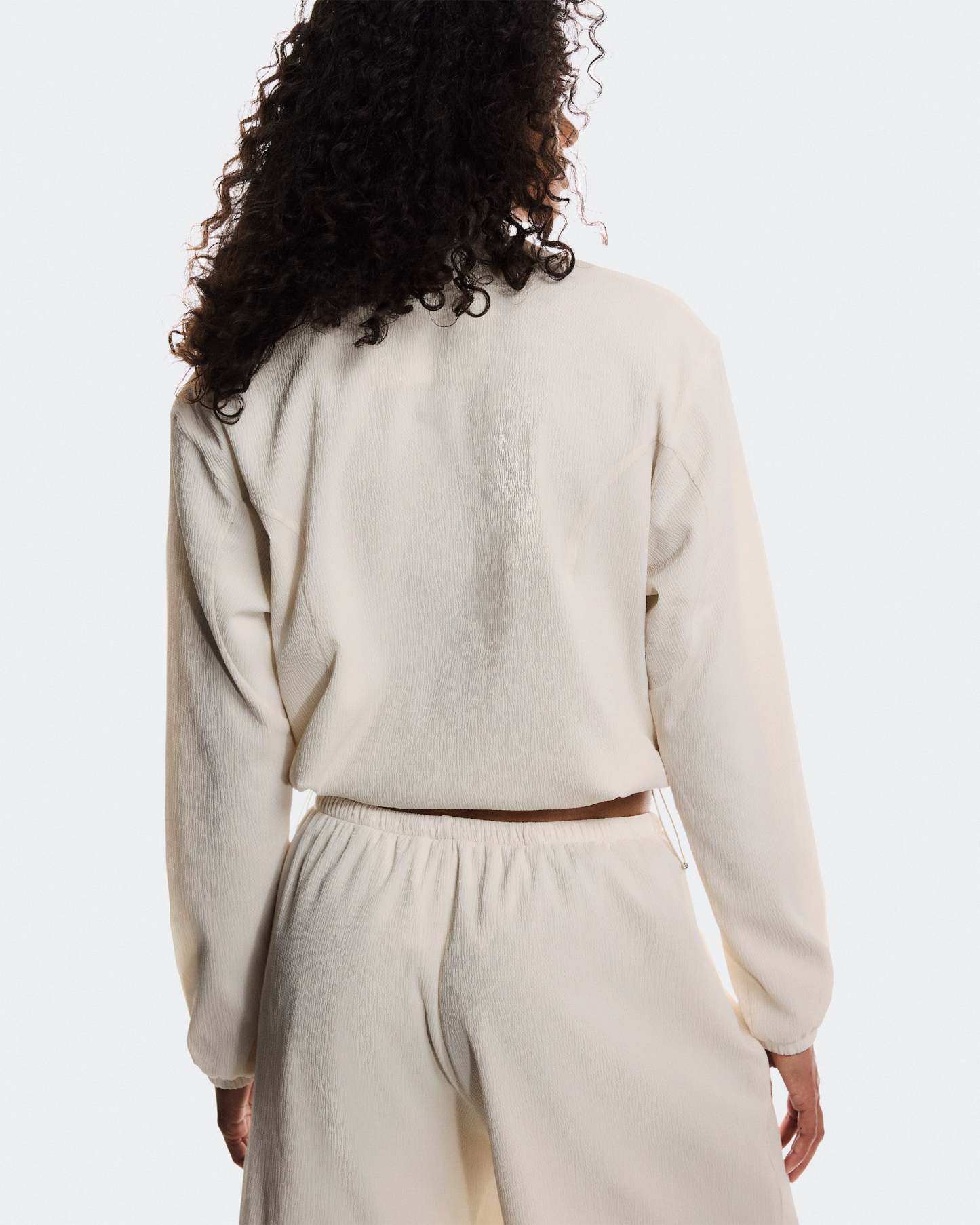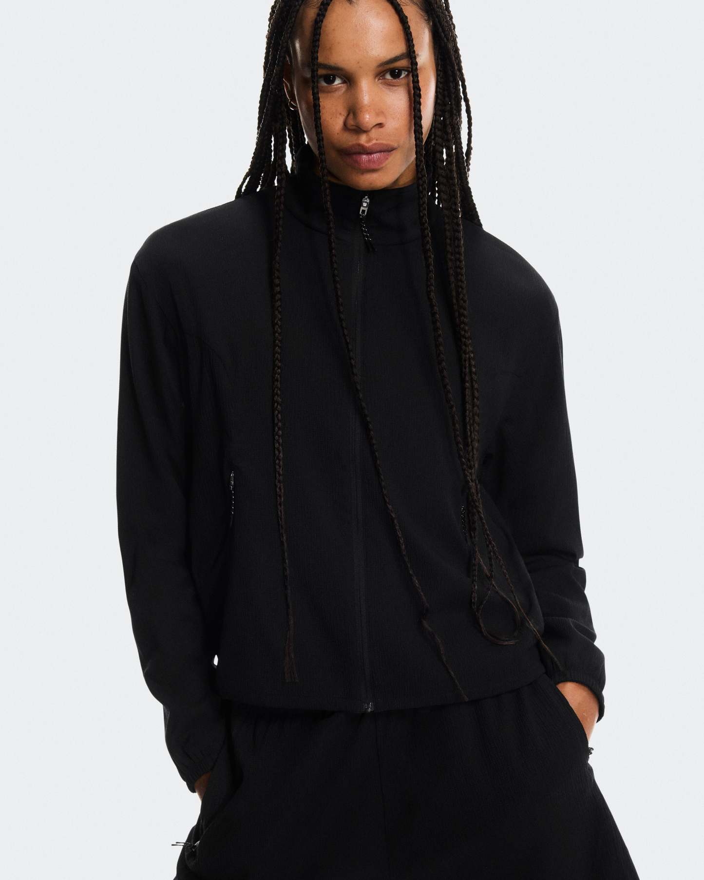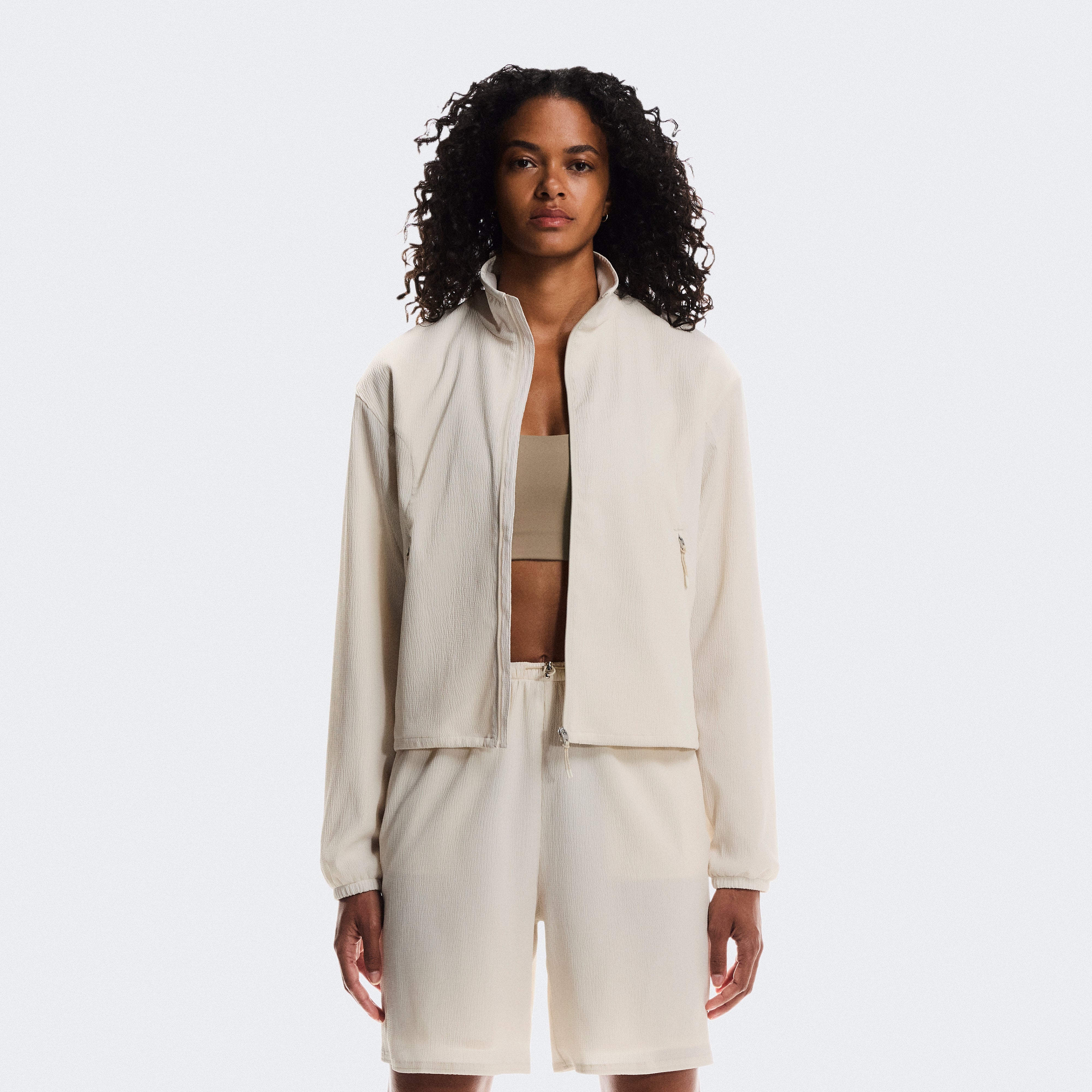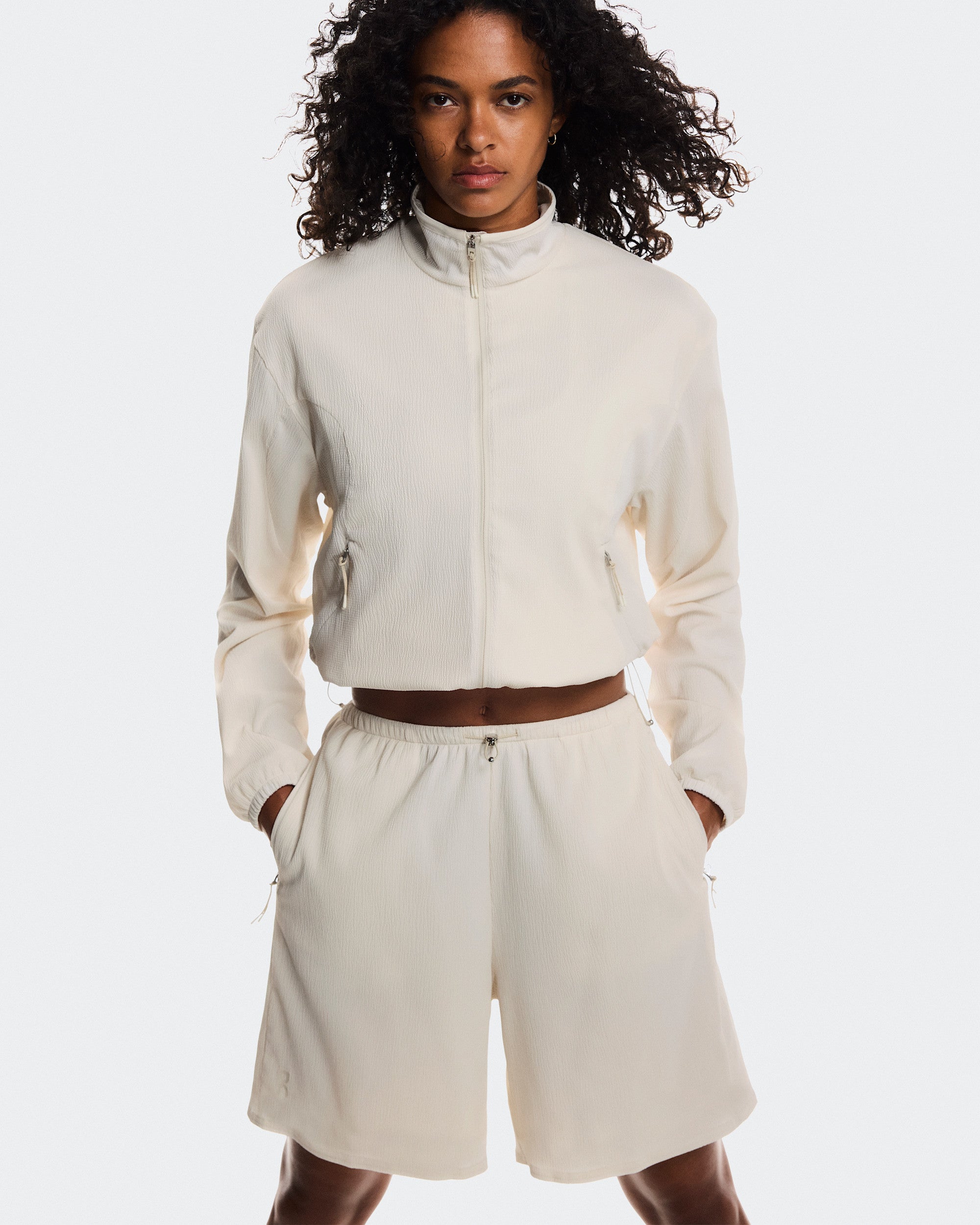 An ultra-light track jacket with a boxy fit, featuring adjustable drawstrings at the hem.