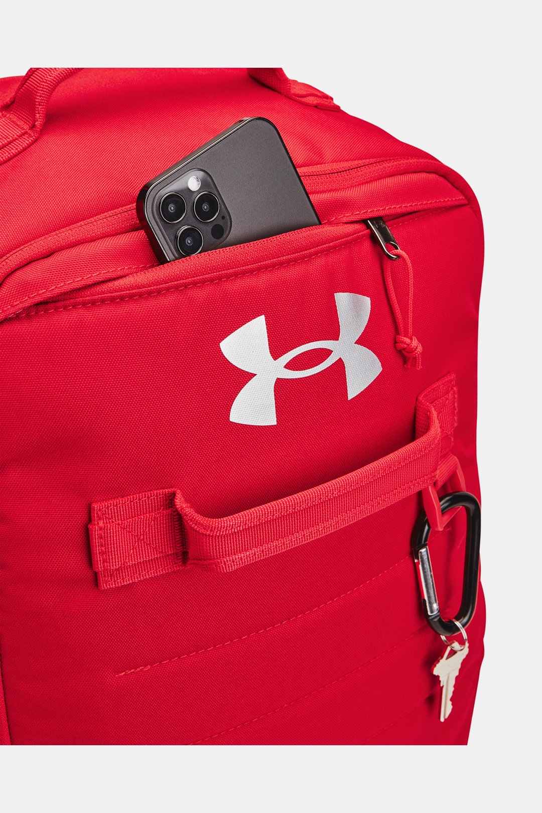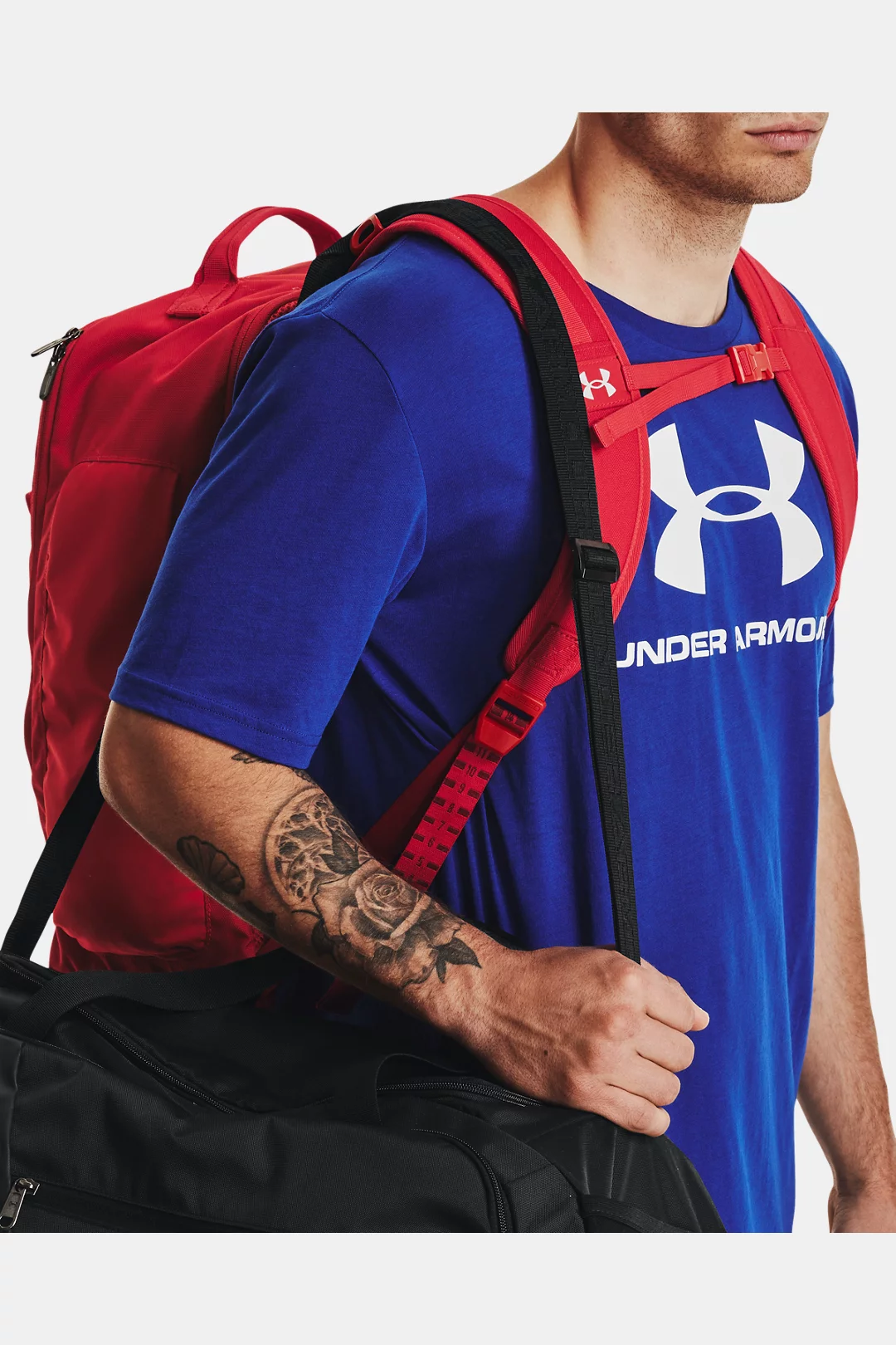 - Adjustable, removable UA Strap Clip? on shoulder to prevent duffle bag from falling off when carrying both