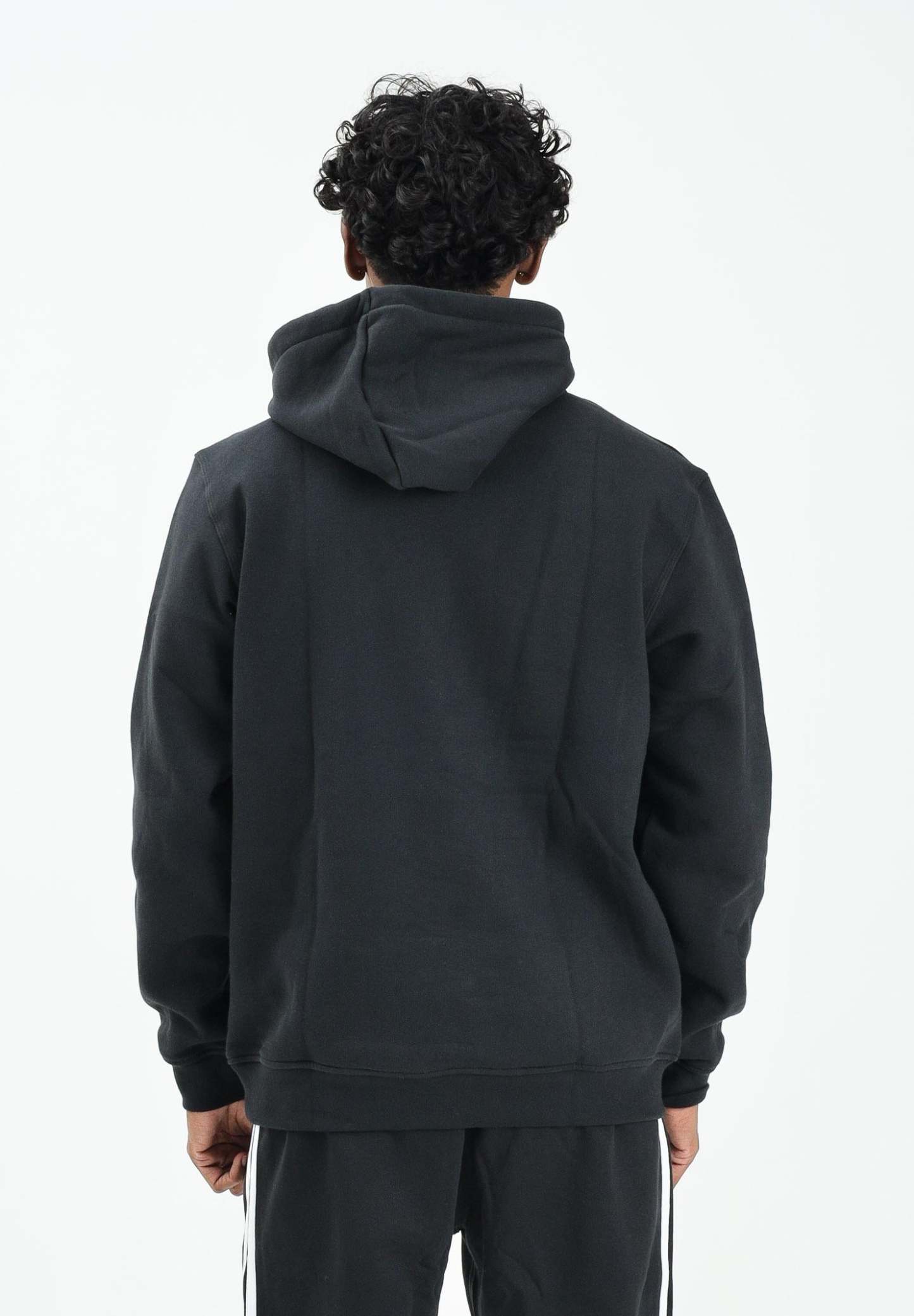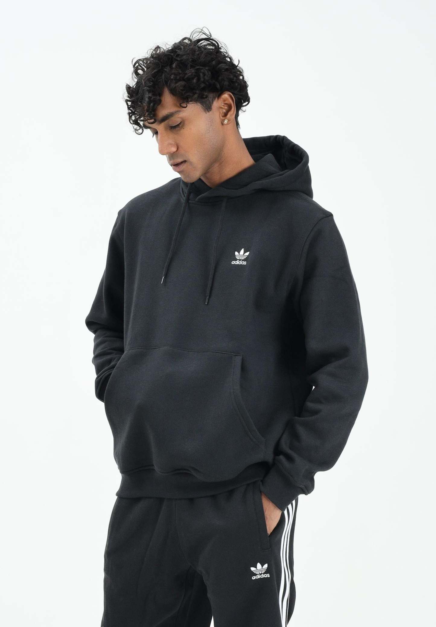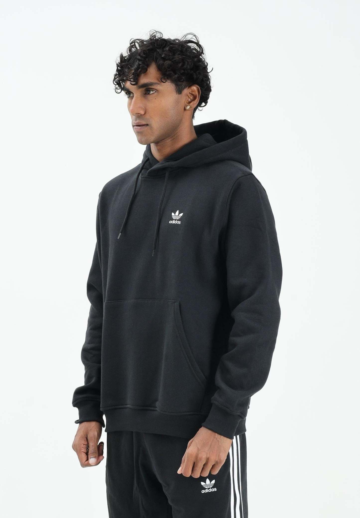 Adithtdas Men's Black Trefoil Essentials Hoodie. When you want to feel good and relaxed, wear this Adithtdas hoodie. The soft fleece fabric is finished with iconic details like ribbed cuffs and a Trefoil logo for a sporty touch. The regular fit, not too tight or too loose, makes it an instant must-have. The model is wearing a size L and is 187 cm tall. We recommend washing and ironing at medium heat. Fall/Winter season.