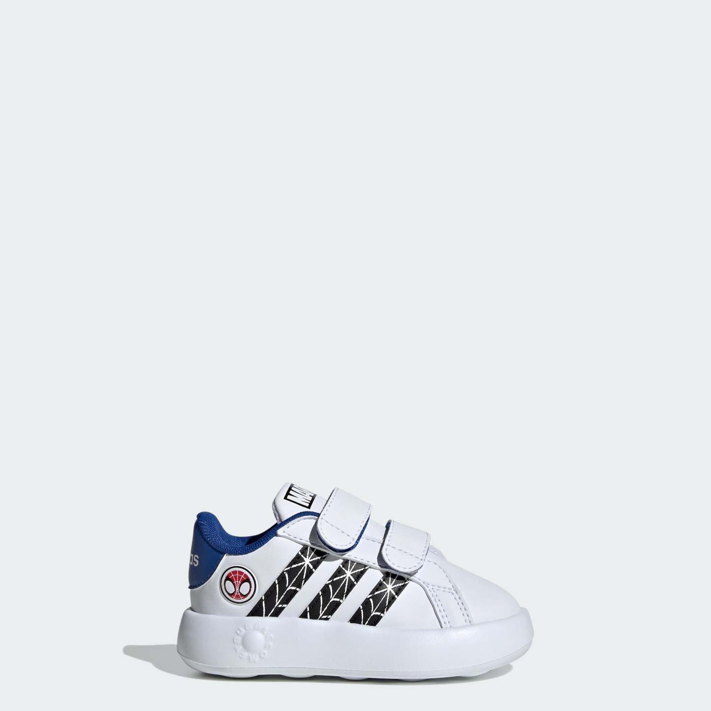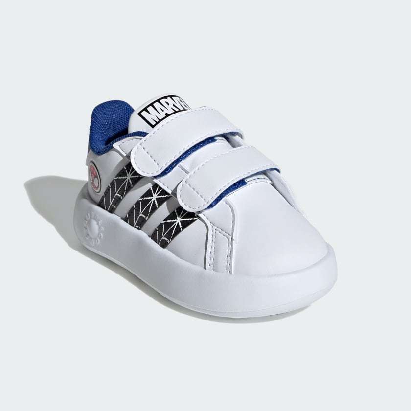Playtime never looked so good. These infants' shoes reinvent the iconic adithtdas court style with the softest sole. A synthetic leather upper is accented with classic-look 3-Stripes and graphics inspired by Marvel's Spider-Man. You'll appreciate the fully adjustable hook-and-loop straps, making these shoes easy to slip on and off for quick changes while keeping little feet snug and secure. A one-piece EVA midsole and bubble-styled outsole provide cushioning and traction without the weight, ideal for little ones discovering the world one step at a time. This product features at least 20% recycled materials. By reusing materials that have already been created, we help to reduce waste and our reliance on finite resources and reduce the footprint of the products we make.