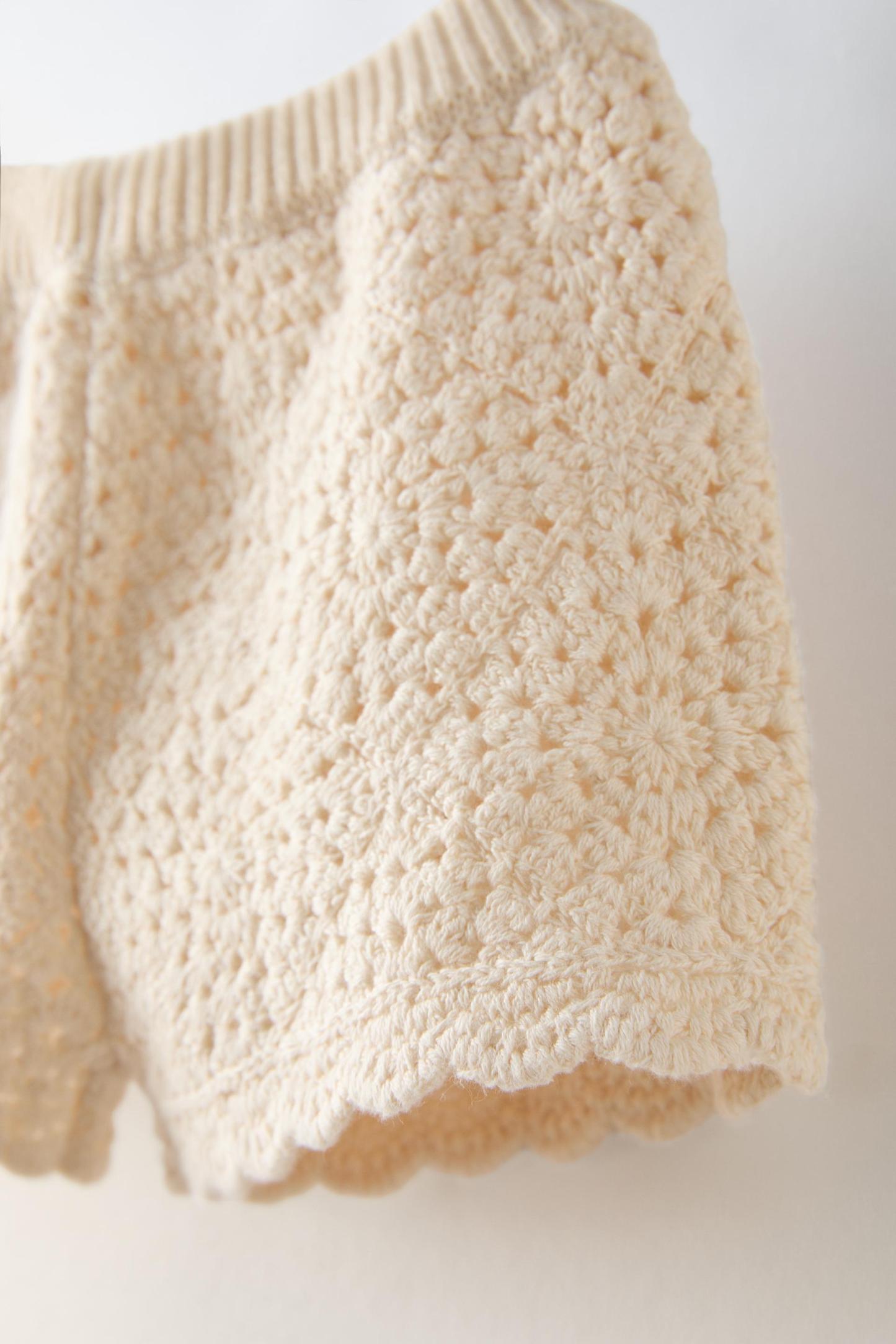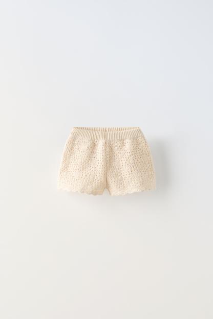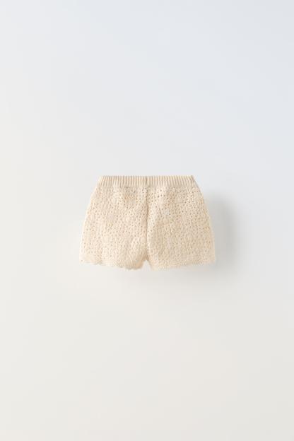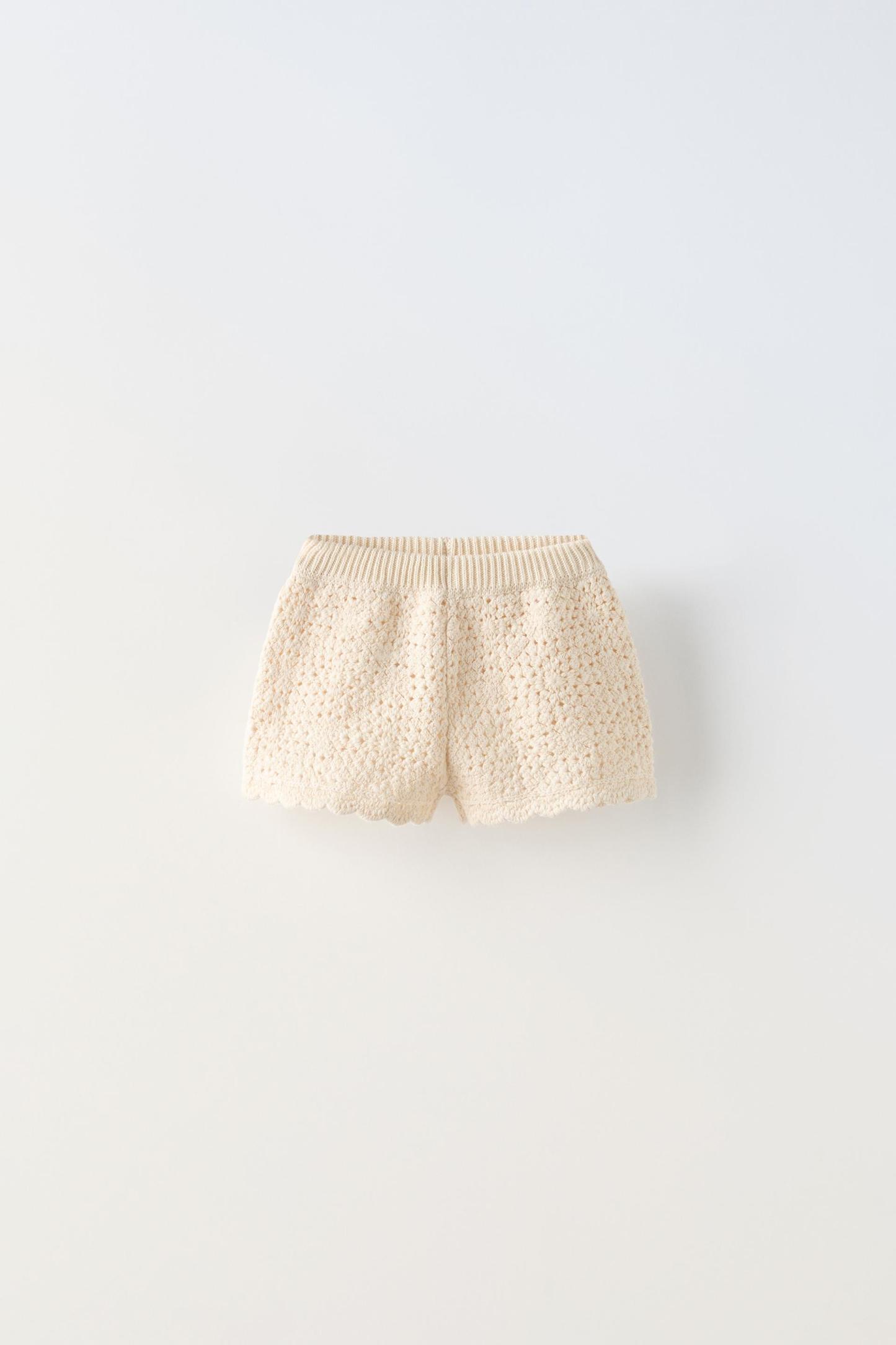 Knit shorts with elastic waistband. Scalloped hem.