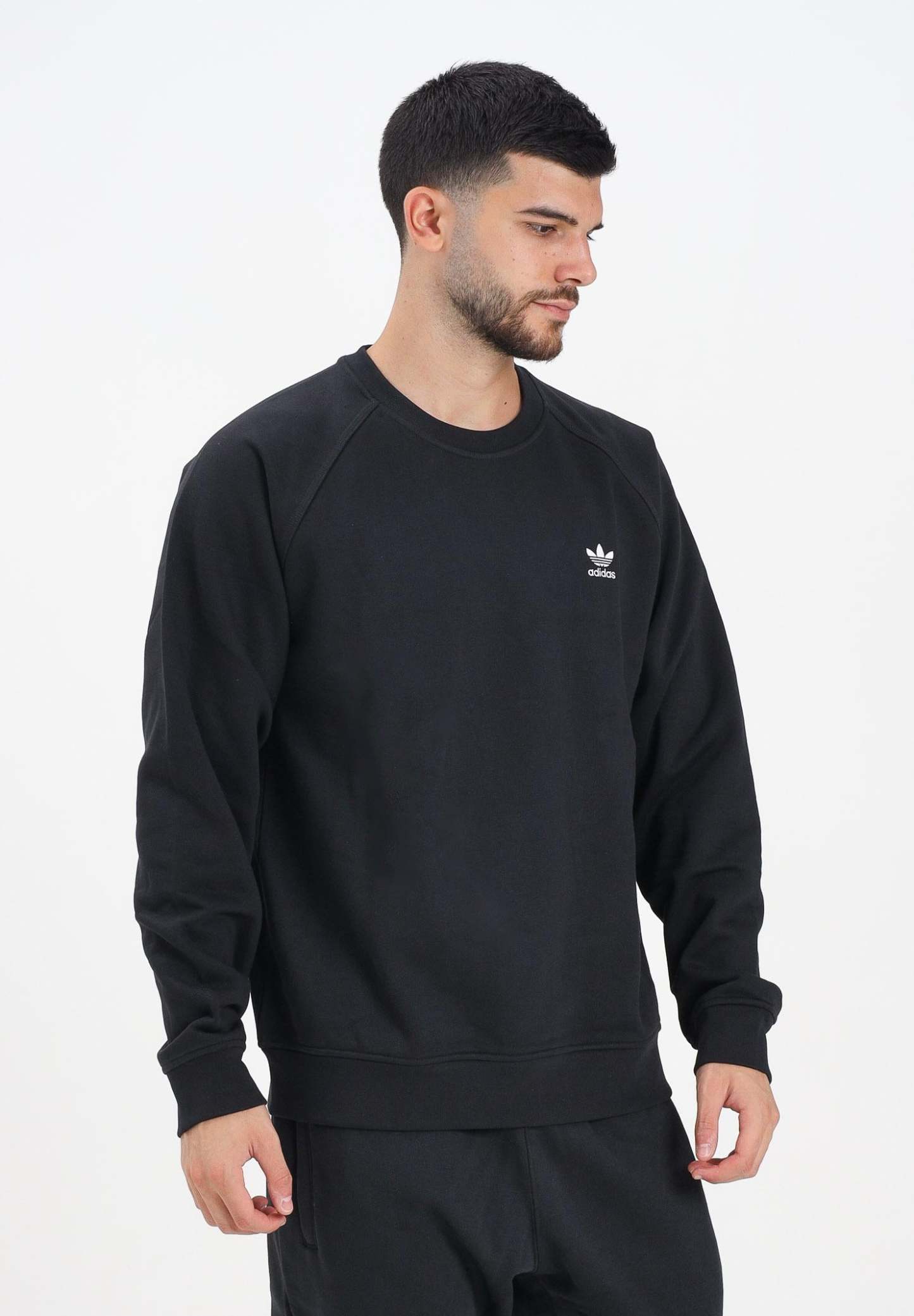 Adithtdas Men's Trefoil Essentials Crew Sweatshirt in Black. This Adithtdas sweatshirt combines practicality and sporty style. The soft fleece fabric ensures optimal warmth, while the embroidered Trefoil logo on the chest shows your passion for sport. The fit is not too tight, not too loose, so you can move effortlessly from the sofa to the coffee break. When comfort is essential, this sweatshirt is the ideal solution. The model is wearing a size L and is 187 cm tall. We recommend washing and ironing at medium heat. Fall/Winter season.