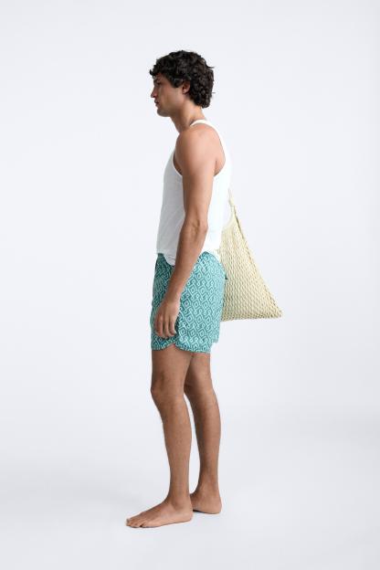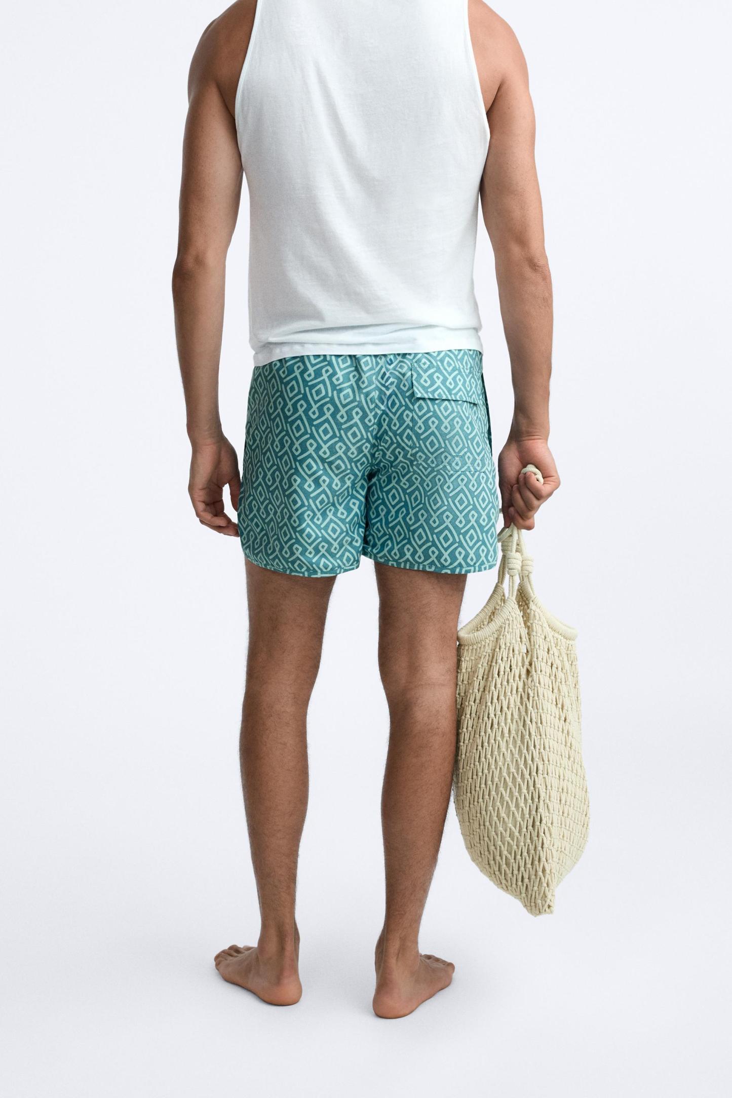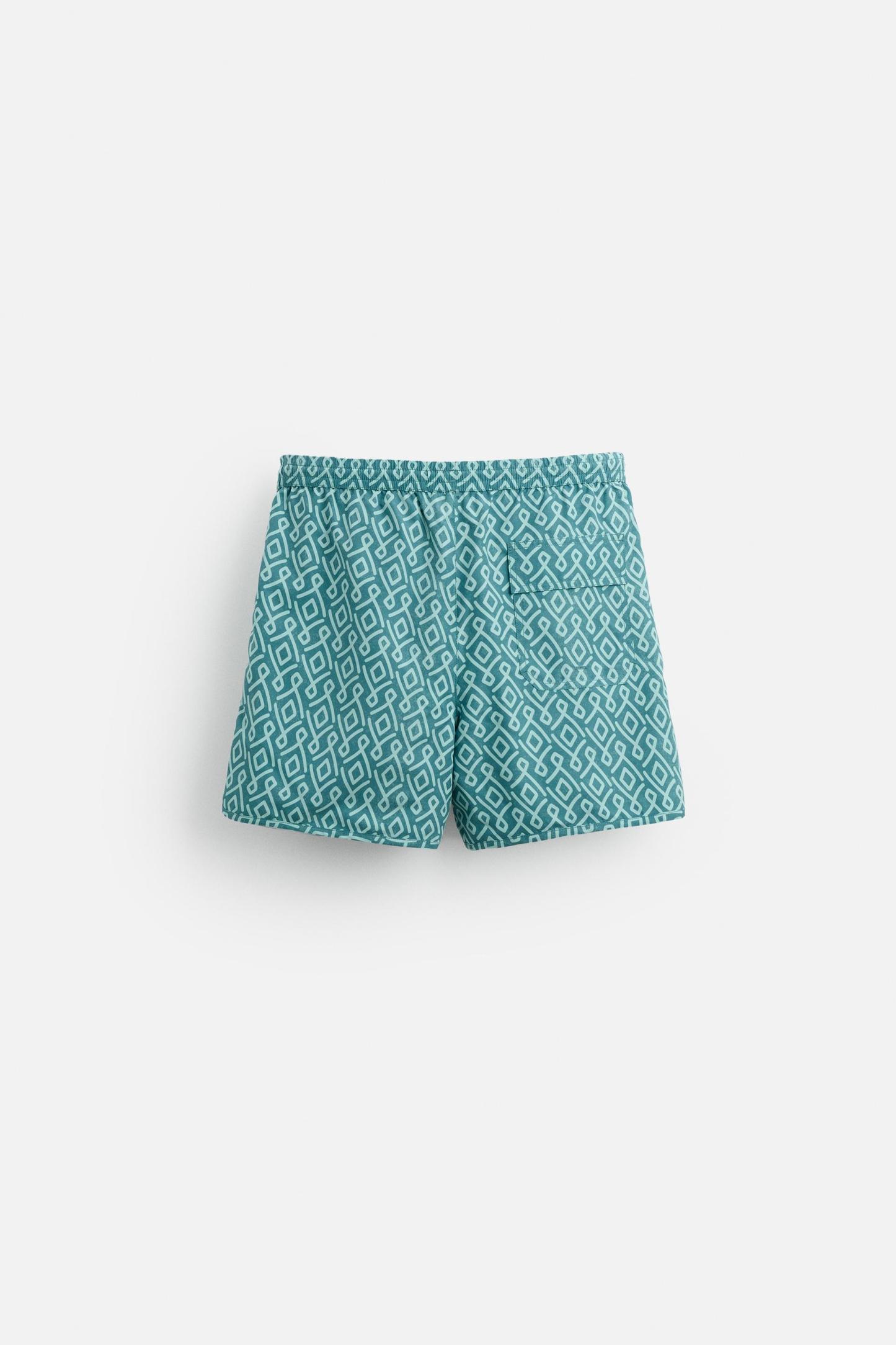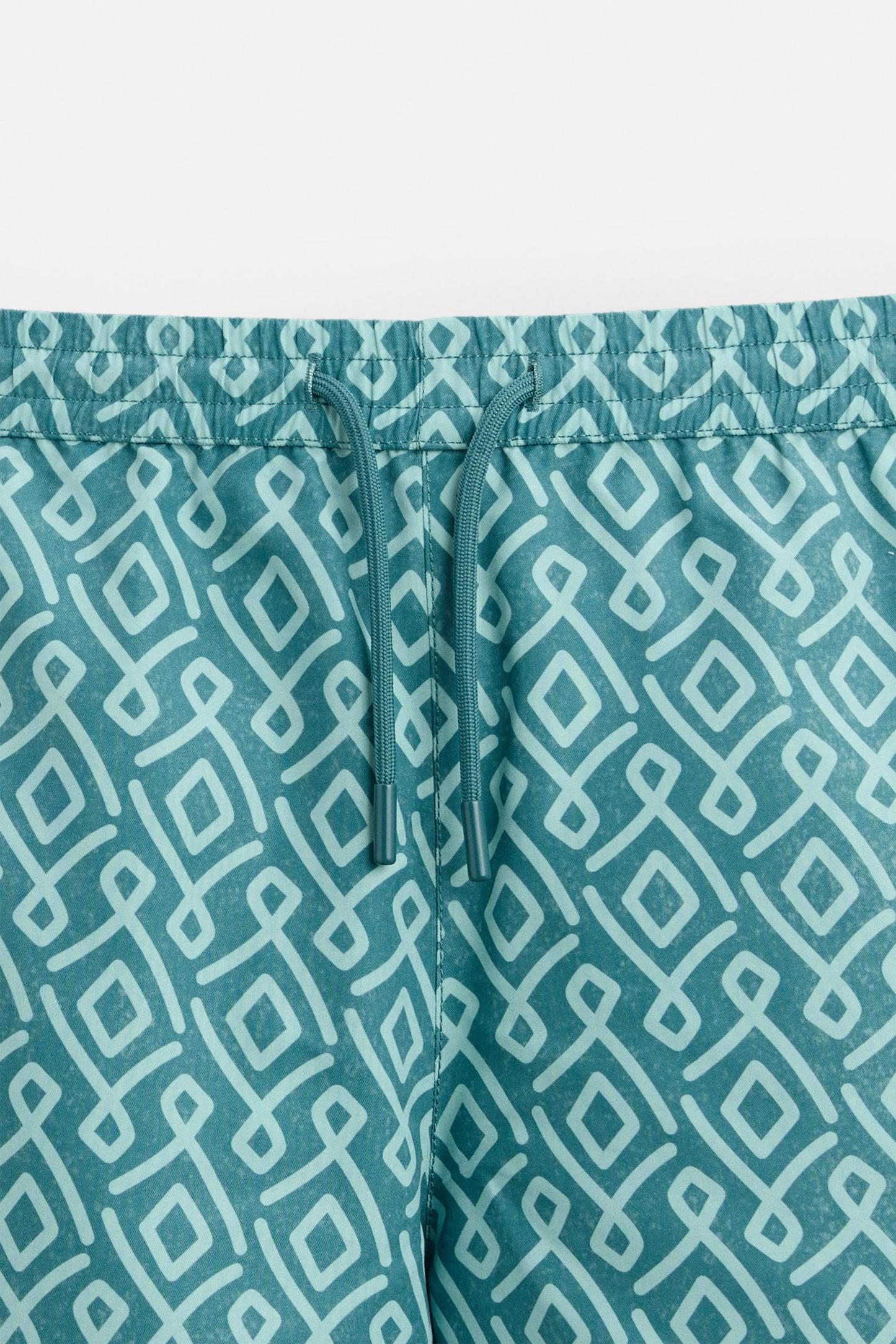GEOMETRIC PRINT LONGLINE SWIMMING TRUNKS