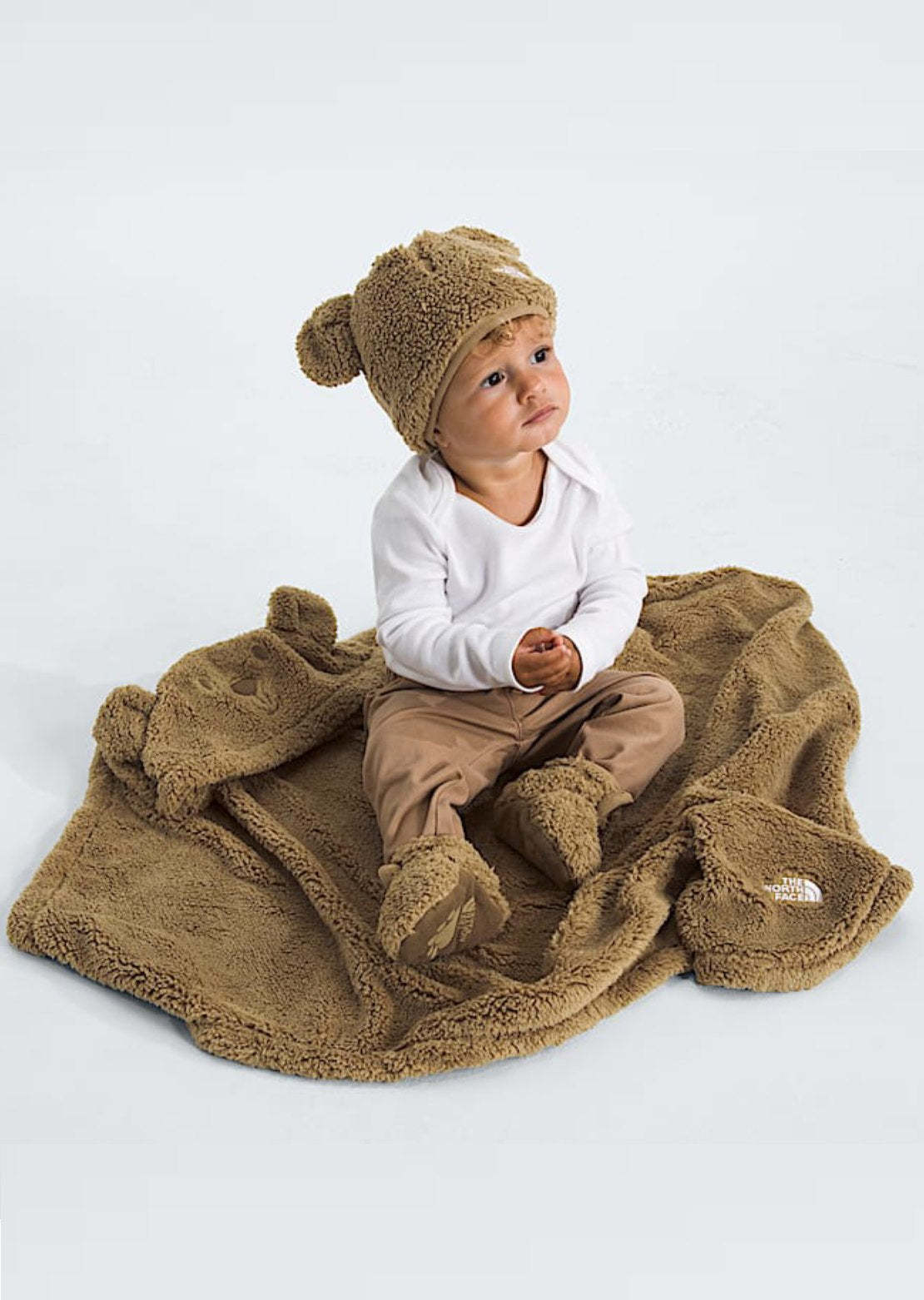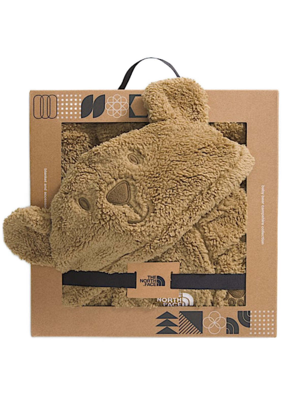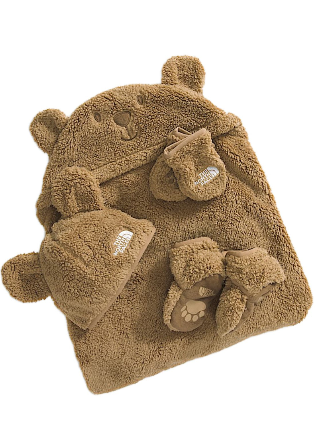 - The square blanket has a corner hood with a bear face and attached ears, and an embroidered logo