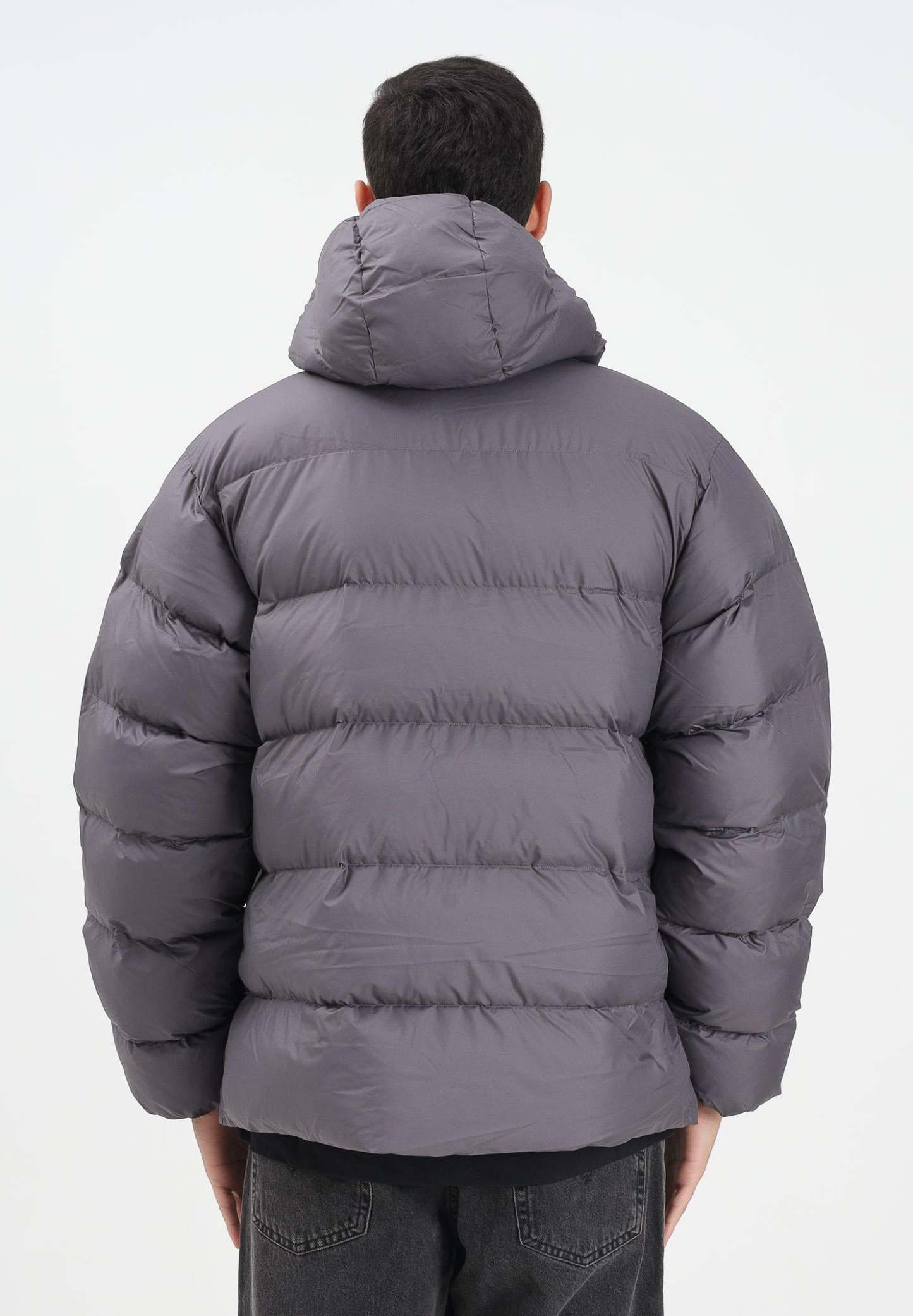 Adithtdas Men's Tonal Hooded Puffer Jacket in grey. This Adithtdas hooded jacket features a simple, trendy silhouette, perfect for cold days. Crafted from durable fabric, it combines an old-school sporty look with a minimalist aesthetic. The full zip, high collar, and elasticated details lock in heat, while side pockets keep hands warm. The model is wearing a size L and is 187 cm tall. Medium-heat wash recommended. Fall/Winter season.